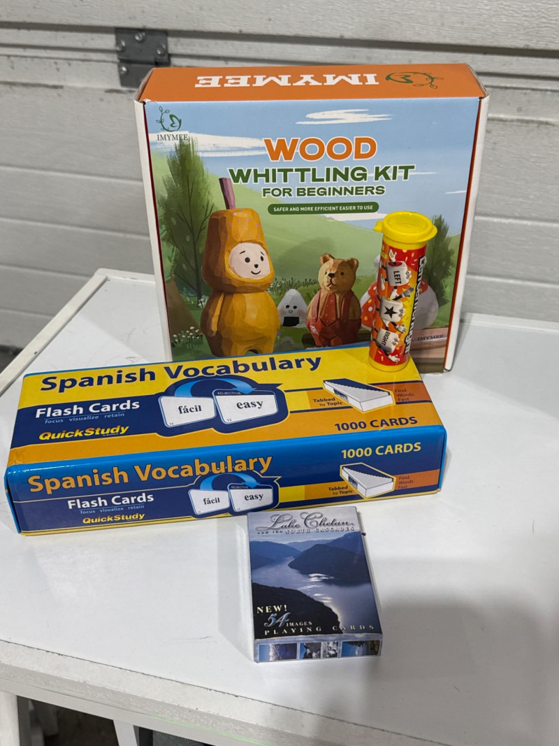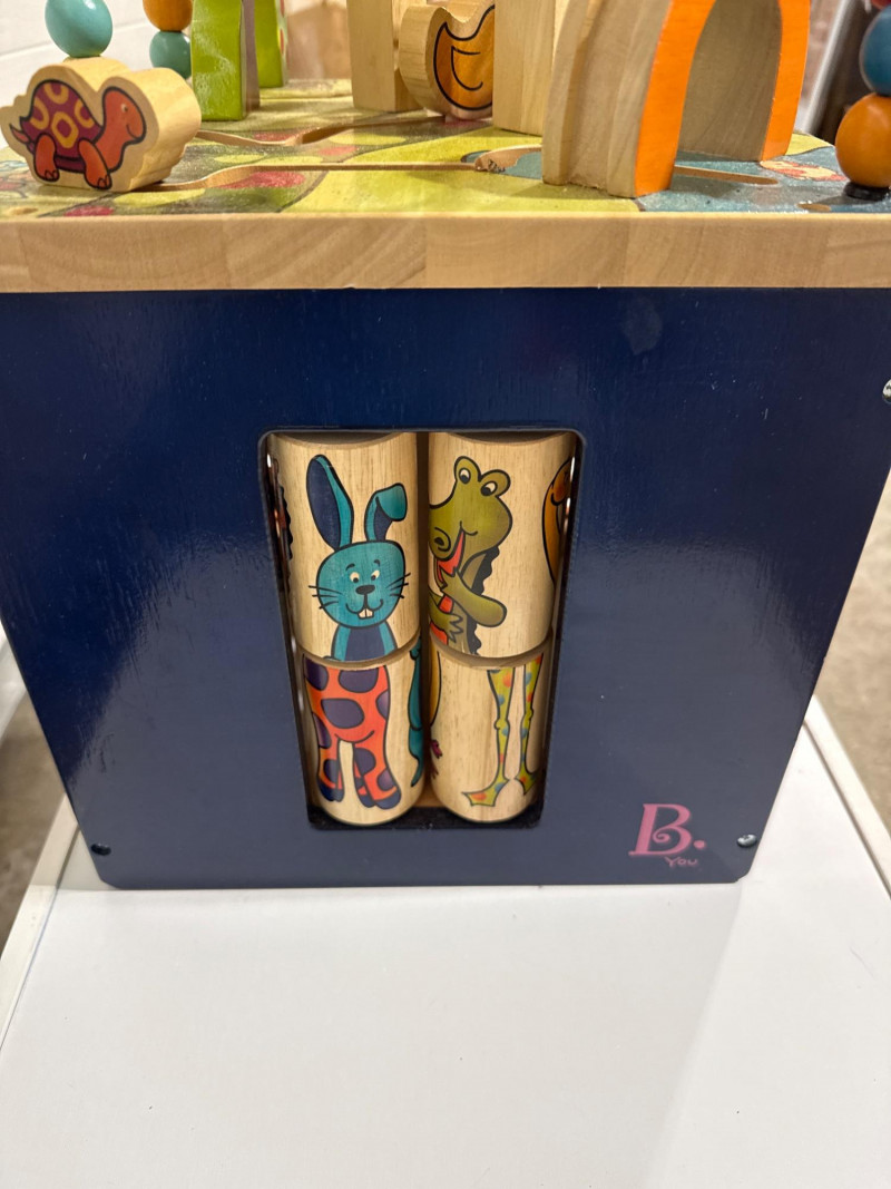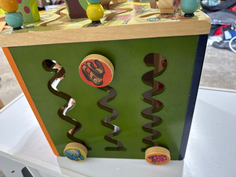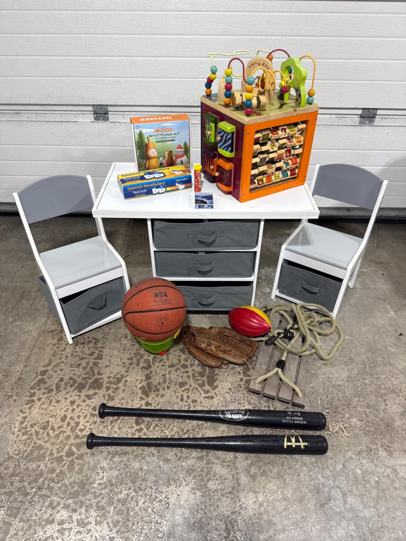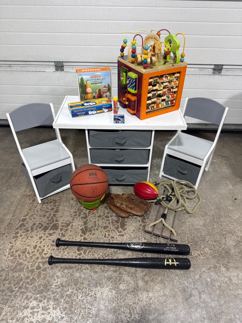 Great set of toys and activities for kiddos. Two junior Wood bats, composite swing, sports balls and mitt, Wood whittle kit, Spanish vocabulary, cards, table games. Zani zoo activity Square. Wood activity table and two matching chairs. Table dimensions are 31.5 inches long, 16.25 inches wide, 1.5 inches tall. All wood construction. Fabric drawers.