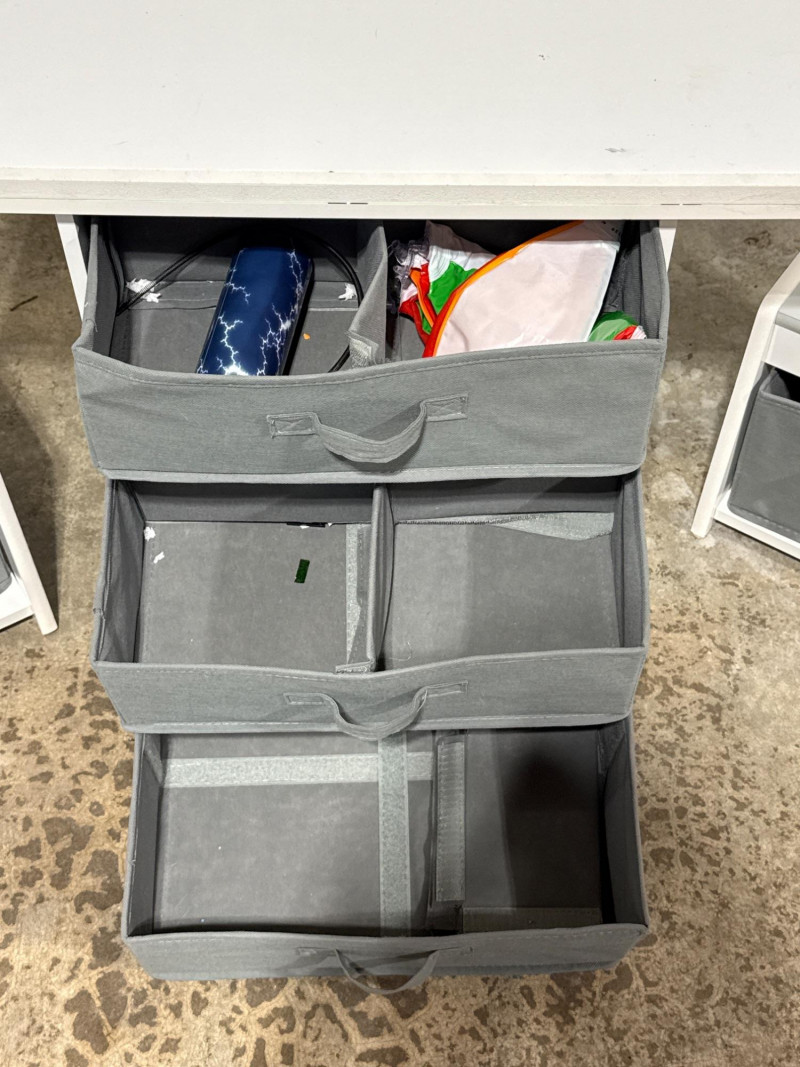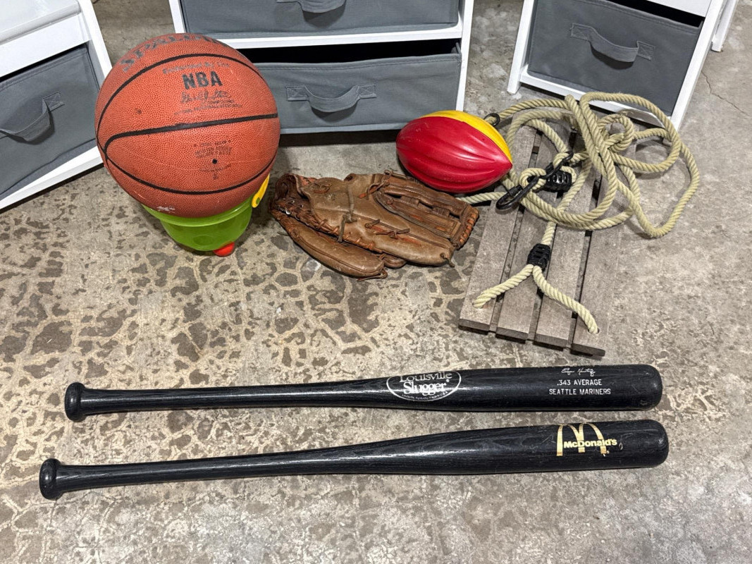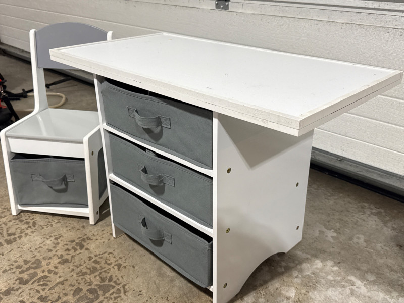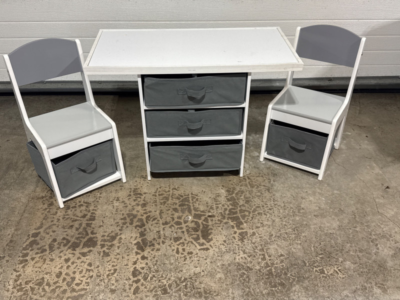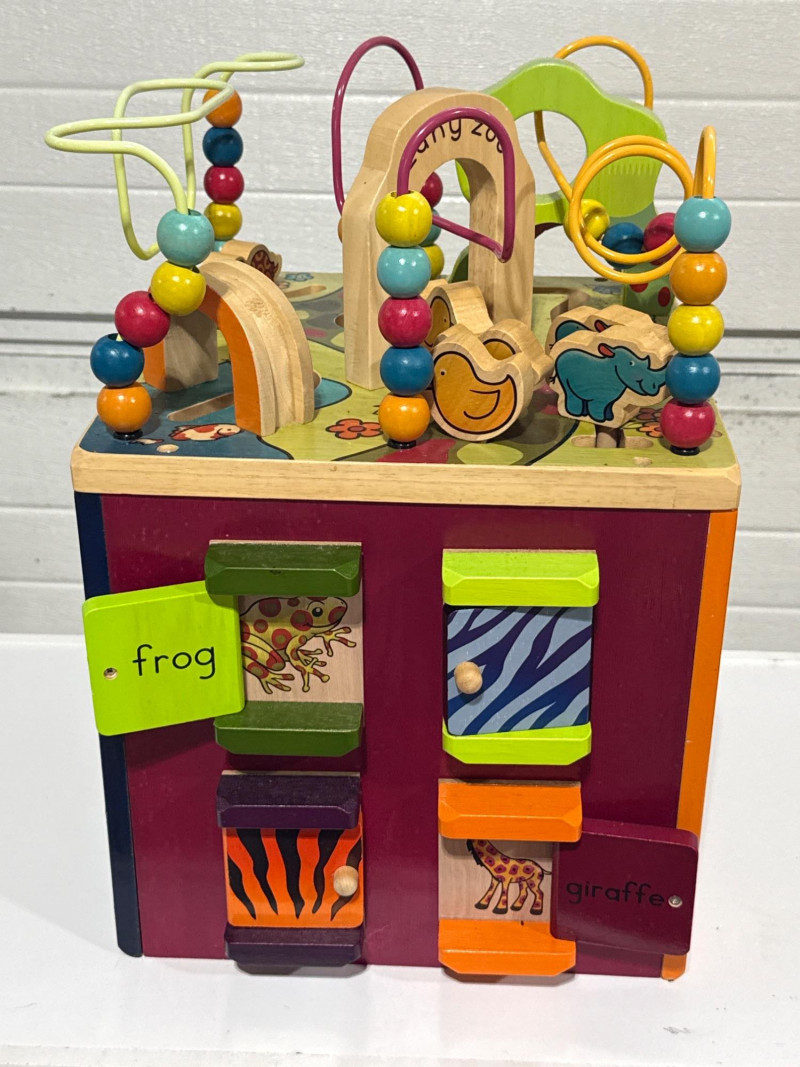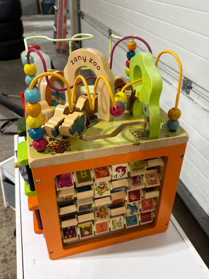Great set of toys and activities for kiddos. Two junior Wood bats, composite swing, sports balls and mitt, Wood whittle kit, Spanish vocabulary, cards, table games. Zani zoo activity Square. Wood activity table and two matching chairs. Table dimensions are 31.5 inches long, 16.25 inches wide, 1.5 inches tall. All wood construction. Fabric drawers.