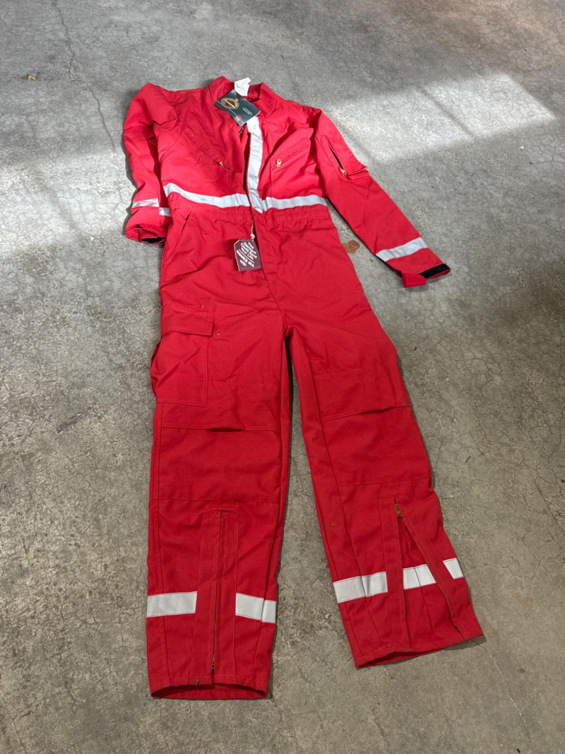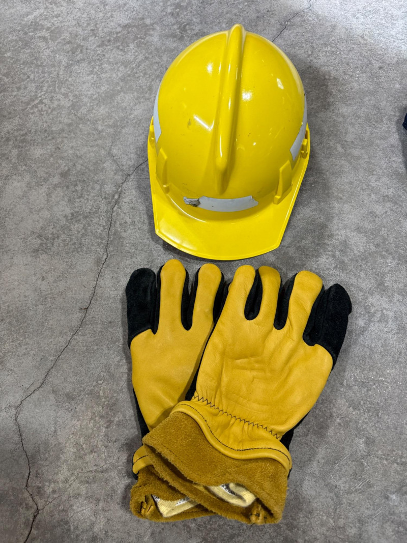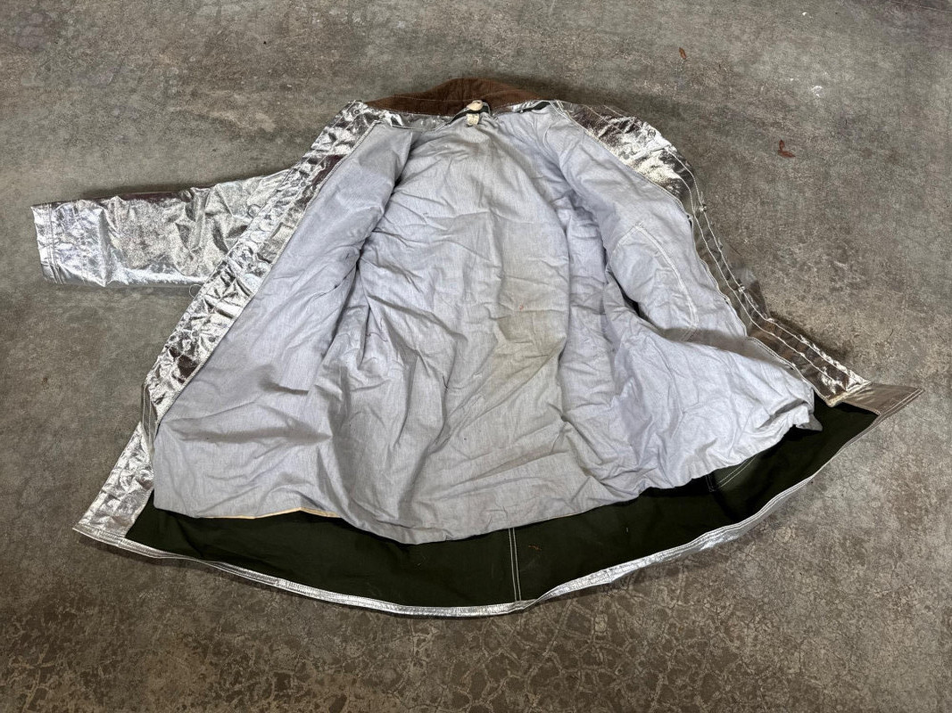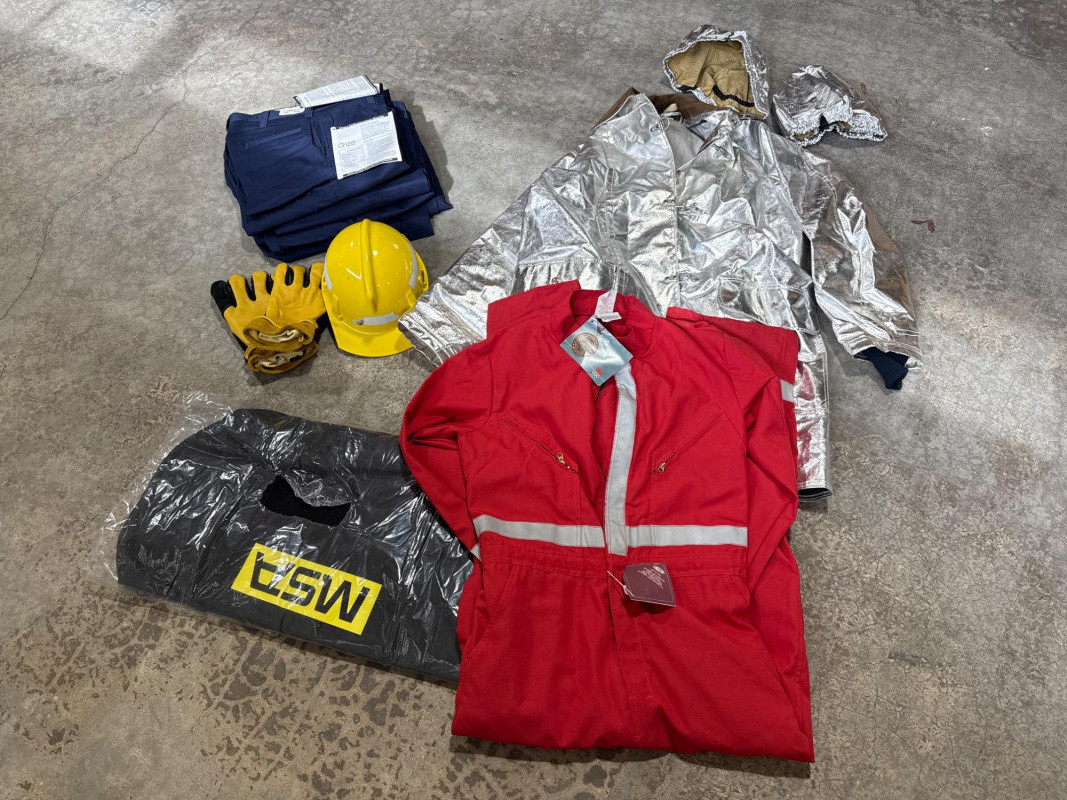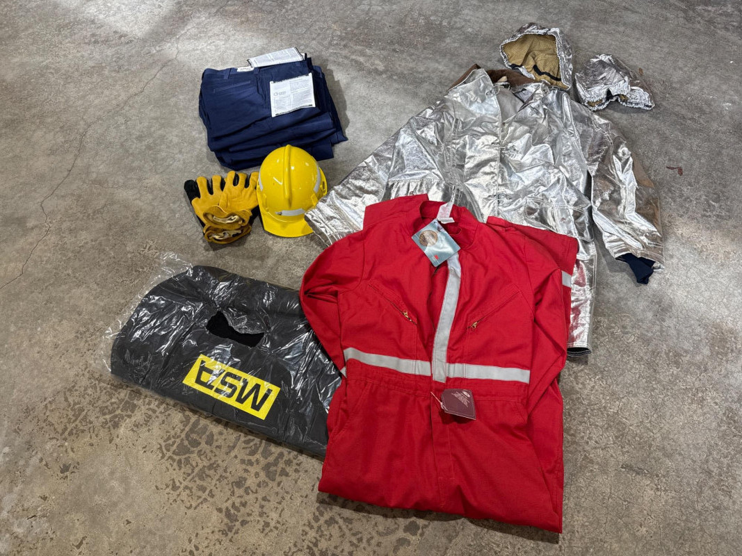 Uniquely different than the other firefighting gear in the auction. This lot features: Scotchlite red safety coverall with reflective striping. This item still has tags. Size Medium Leather gloves with fleece lining. Yellow safety helmet, NEW MSW canvas duffle bag. Multiple pairs of new trousers. Blue duty uniform. See pics for sizes. Aluminized proximity fire protection coat. Designed for high temperature industrial environments. Metal clasps. Flame retardant vapor barrier