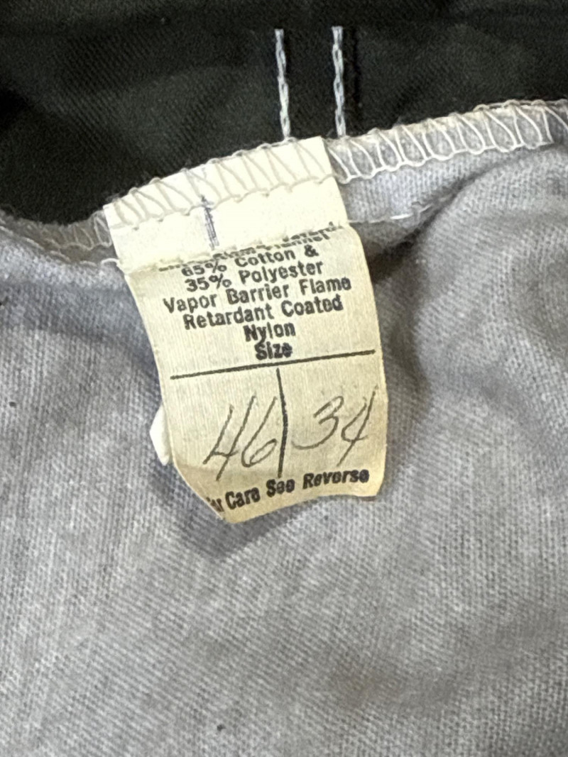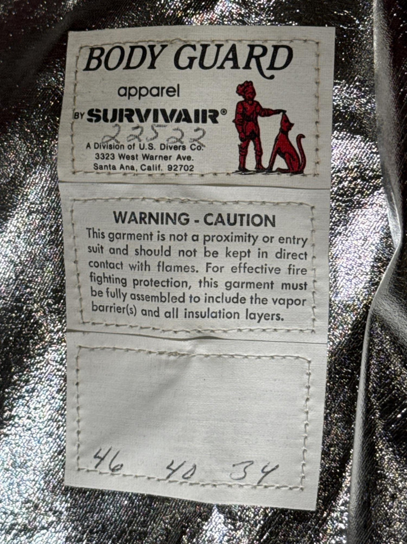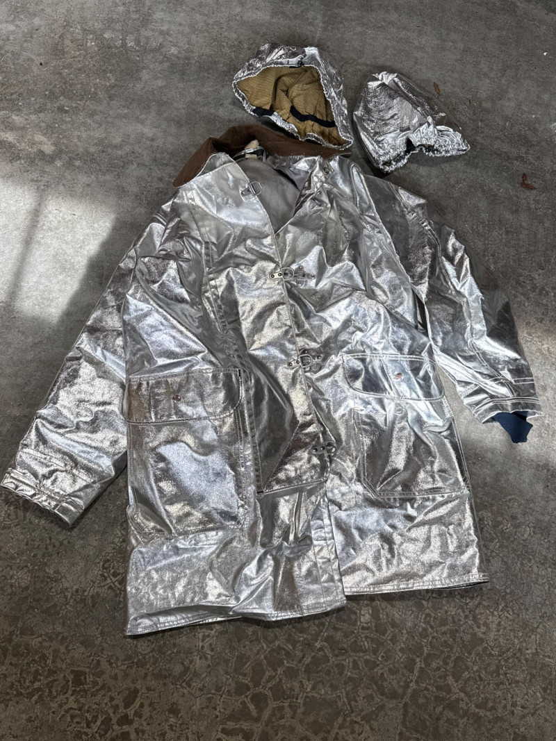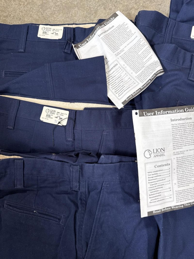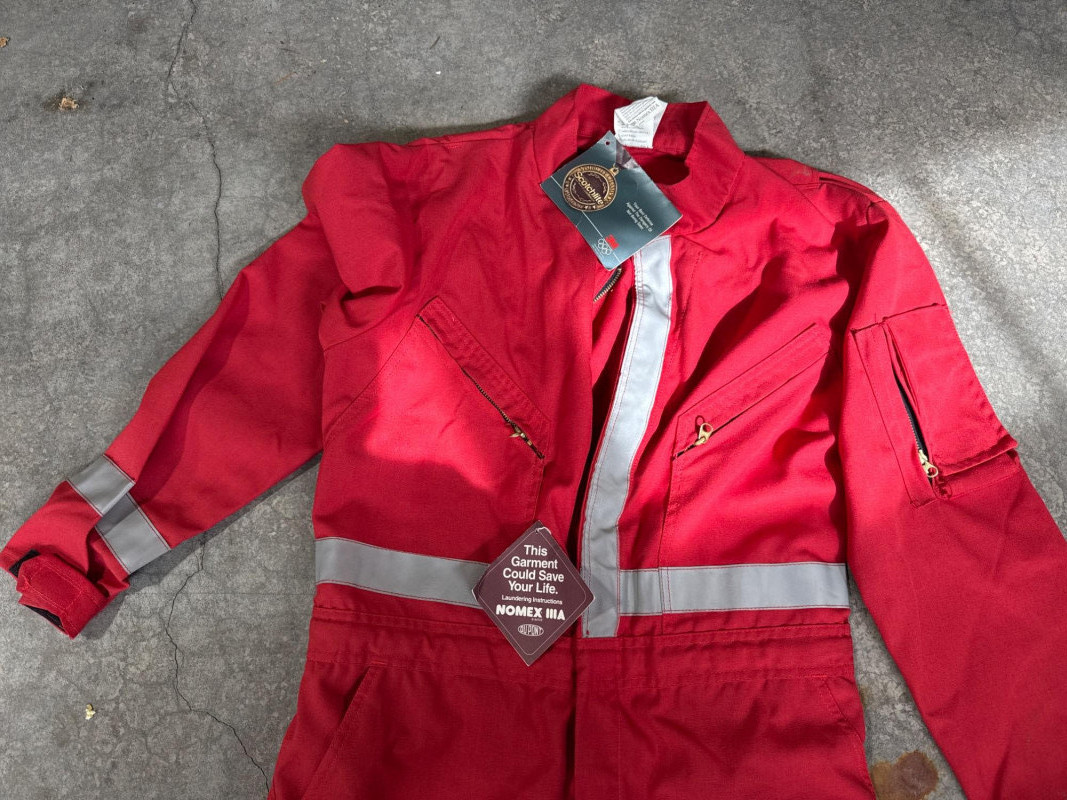 Uniquely different than the other firefighting gear in the auction. This lot features: Scotchlite red safety coverall with reflective striping. This item still has tags. Size Medium Leather gloves with fleece lining. Yellow safety helmet, NEW MSW canvas duffle bag. Multiple pairs of new trousers. Blue duty uniform. See pics for sizes. Aluminized proximity fire protection coat. Designed for high temperature industrial environments. Metal clasps. Flame retardant vapor barrier