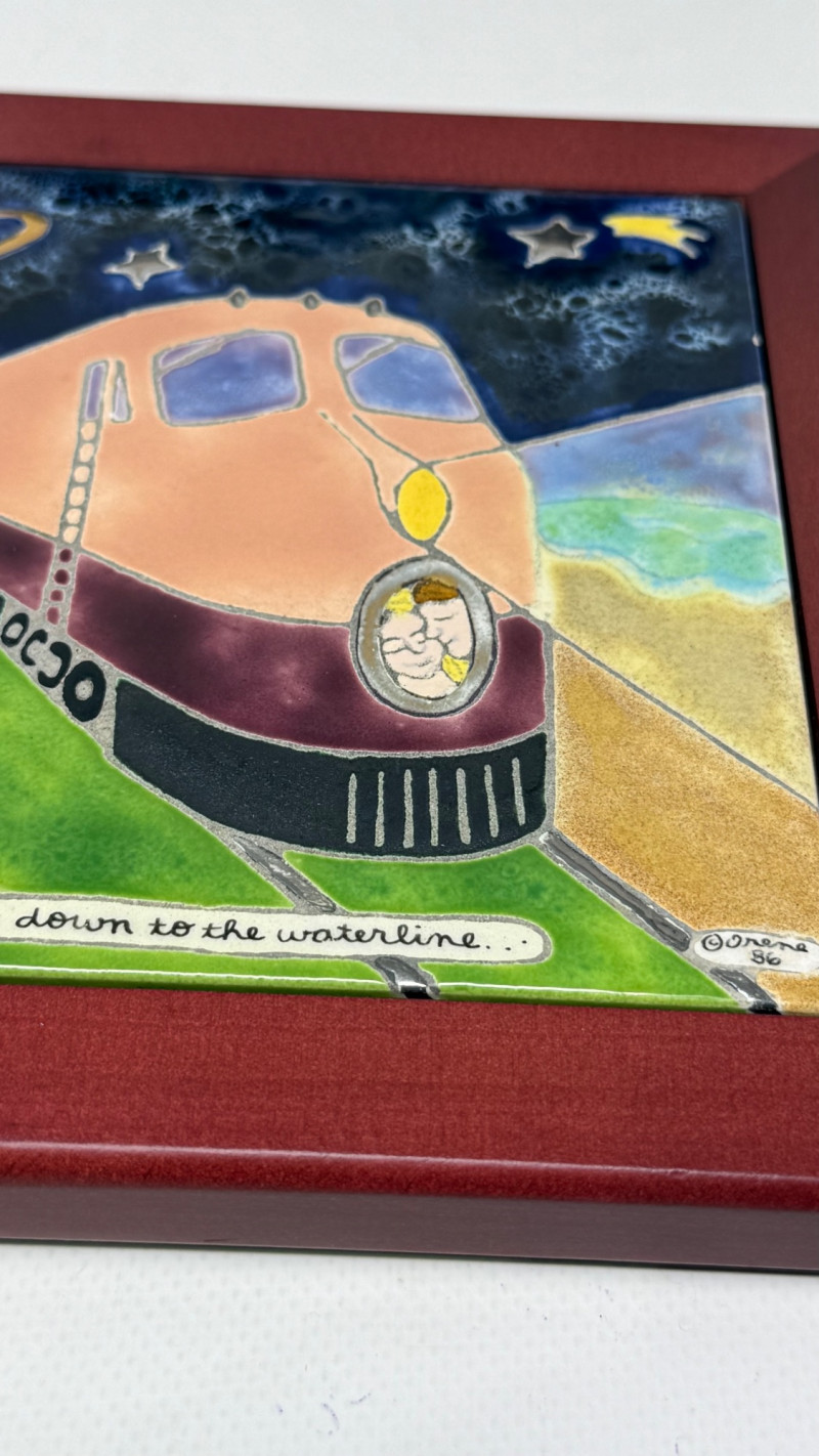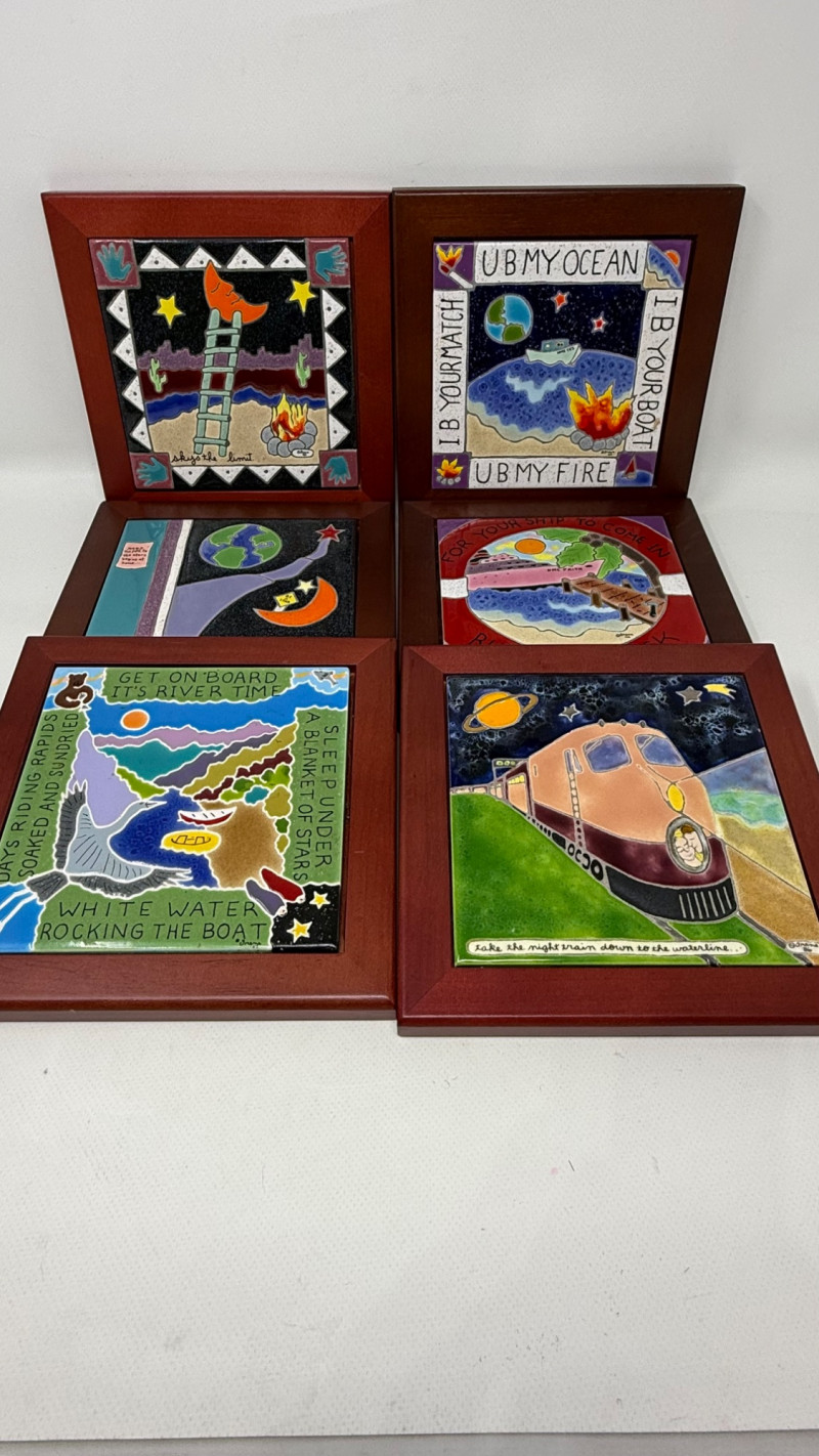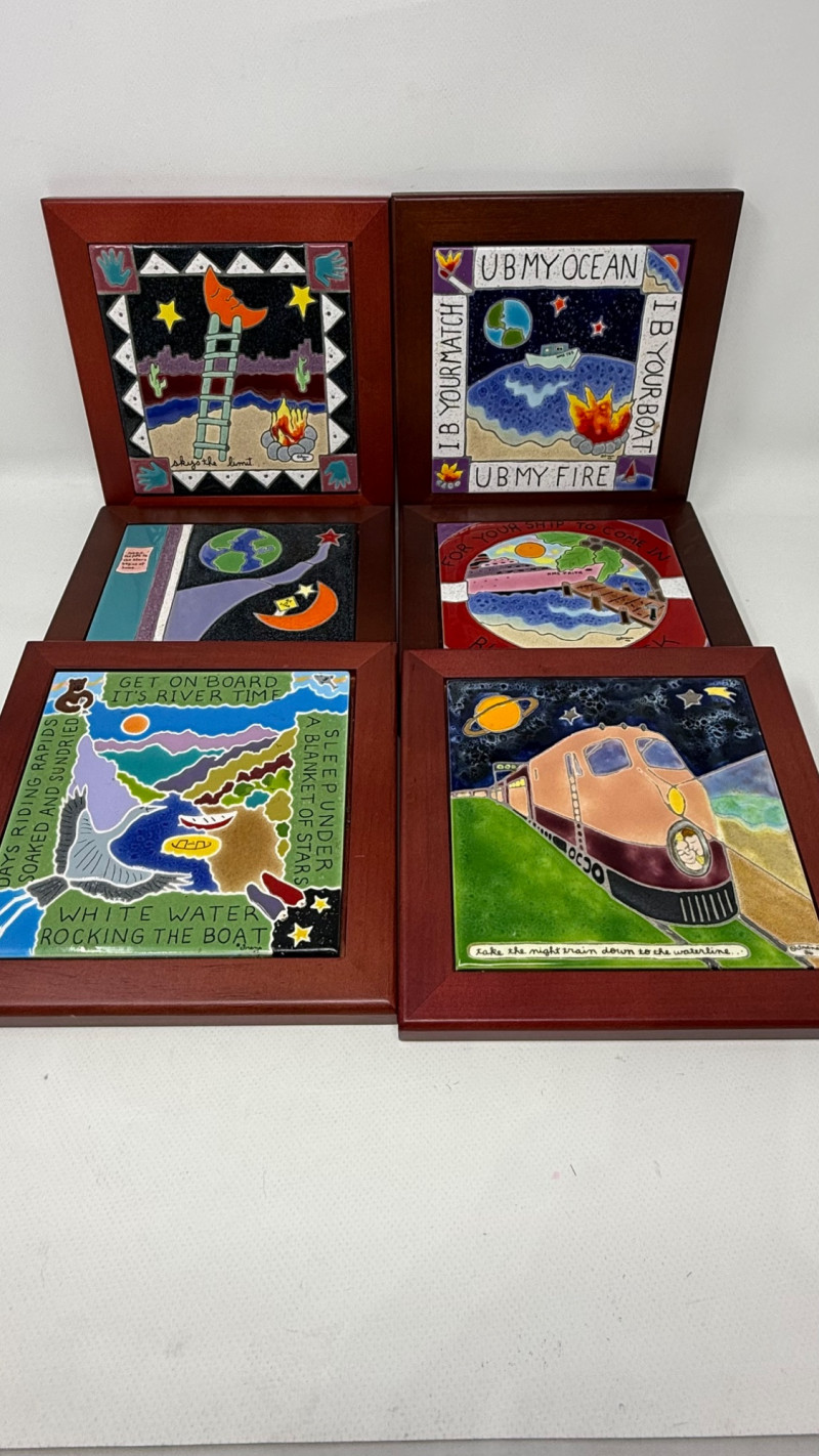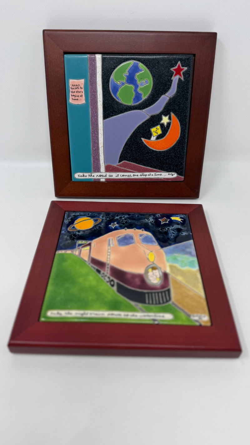 Beautiful collection of six handmade ceramic art tiles by Irene. Each is uniquely illustrated with whimsical dream-inspired designs and thoughtful messages. These pieces feature vibrant colors, textured glazing, and charming storytelling elements—perfect for adding warmth and personality to any space. Each tile is individually framed (mix of wood tones including red and black) and signed by the artist (dated mid-1980s). Backs are labeled “Irene’s Tiles – Handmade on a small island in the Pacific N.W.” and can be displayed on a wall or used decoratively. Themes include methods of transportation used to transport you to places of rest, nature, connection and imaginative scenes with phrases. "For the boat to come in, build a dock". A cohesive yet varied set that works beautifully as a gallery wall or standalone accents.