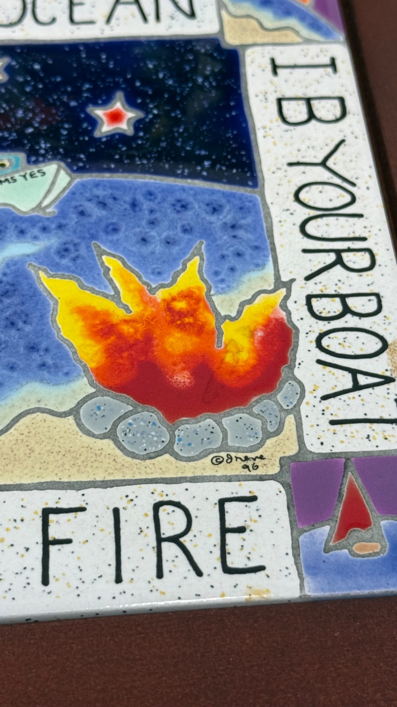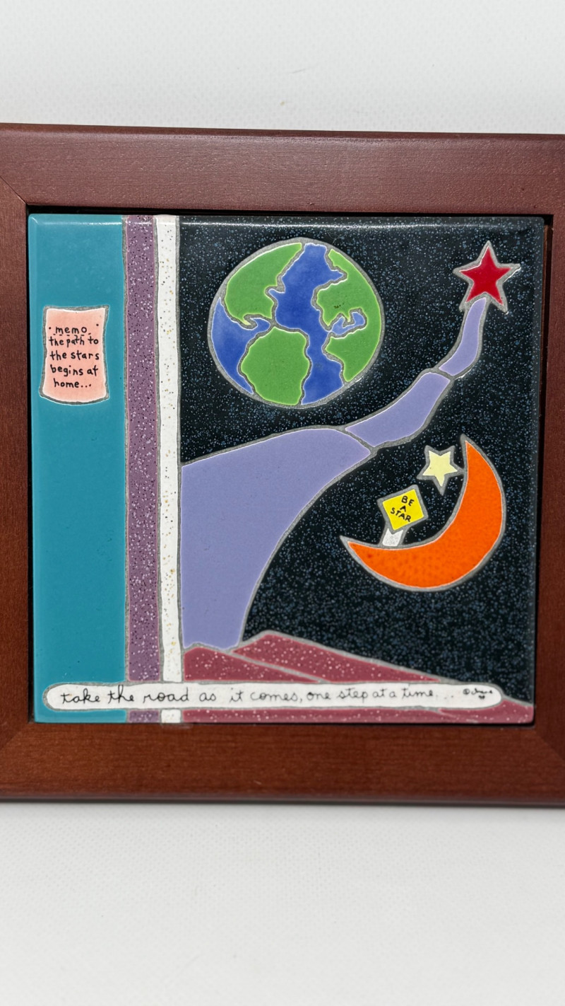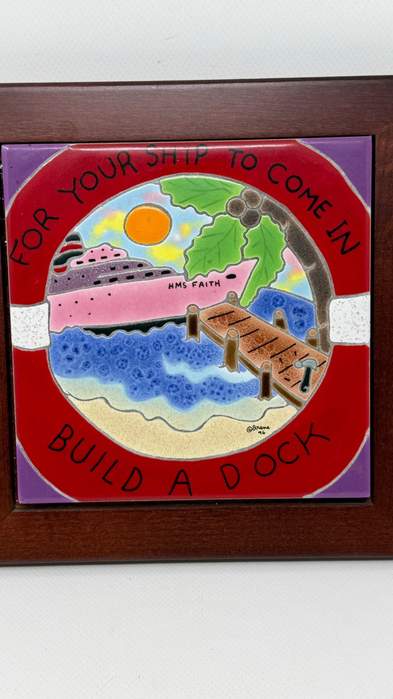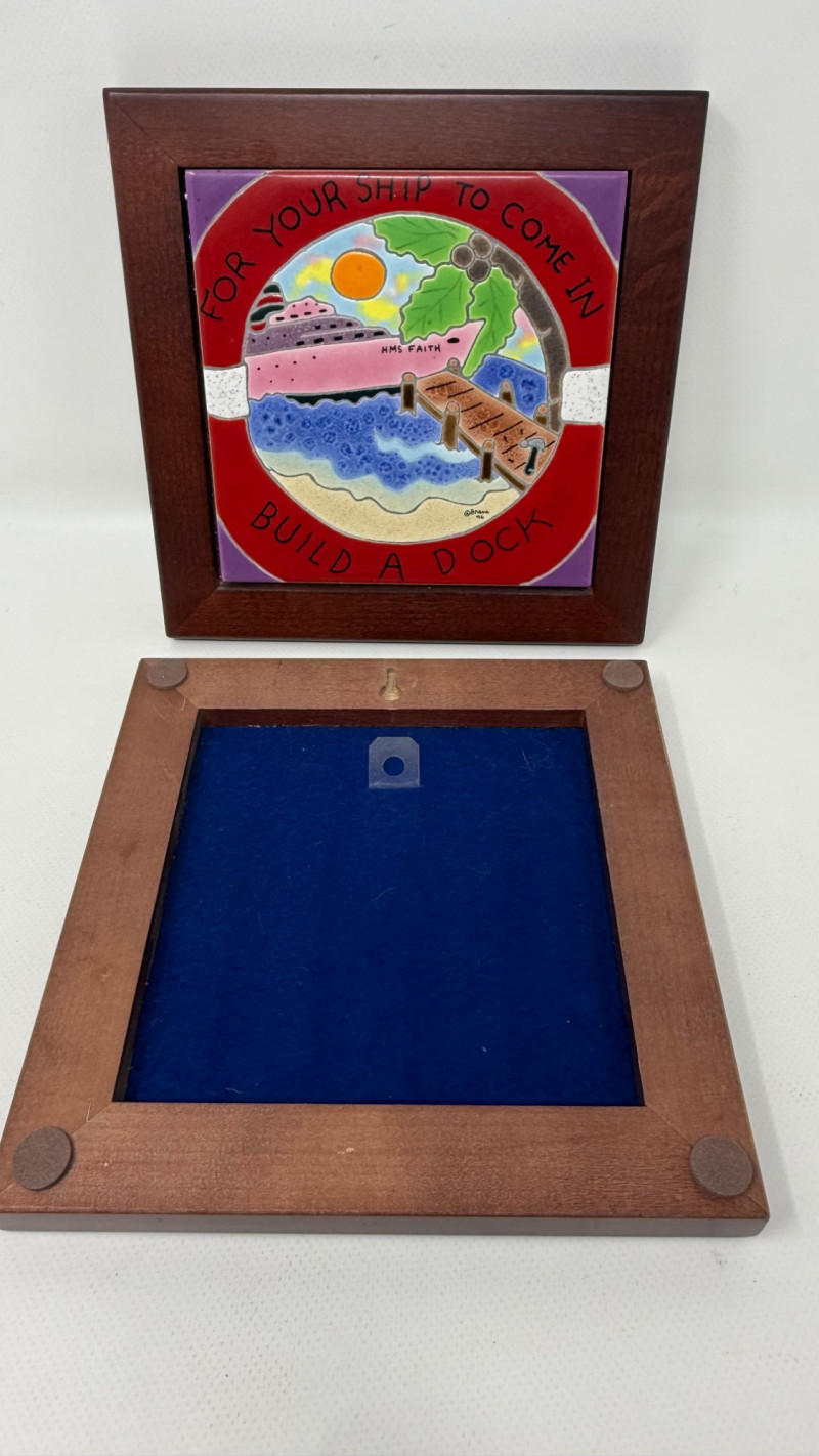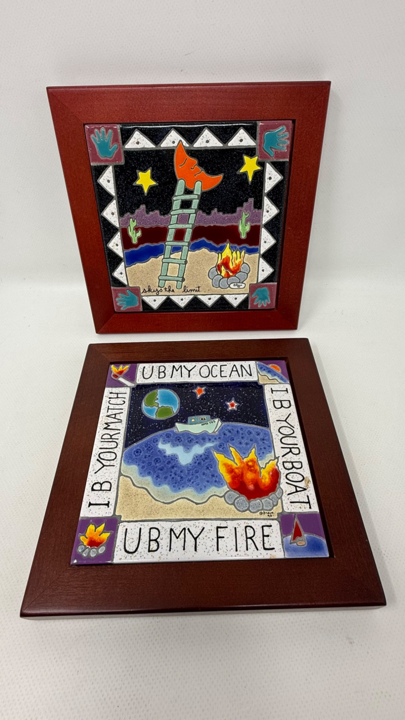 Beautiful collection of six handmade ceramic art tiles by Irene. Each is uniquely illustrated with whimsical dream-inspired designs and thoughtful messages. These pieces feature vibrant colors, textured glazing, and charming storytelling elements—perfect for adding warmth and personality to any space. Each tile is individually framed (mix of wood tones including red and black) and signed by the artist (dated mid-1980s). Backs are labeled “Irene’s Tiles – Handmade on a small island in the Pacific N.W.” and can be displayed on a wall or used decoratively. Themes include methods of transportation used to transport you to places of rest, nature, connection and imaginative scenes with phrases. "For the boat to come in, build a dock". A cohesive yet varied set that works beautifully as a gallery wall or standalone accents.