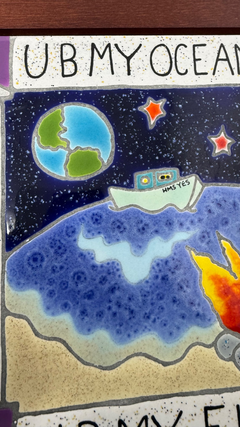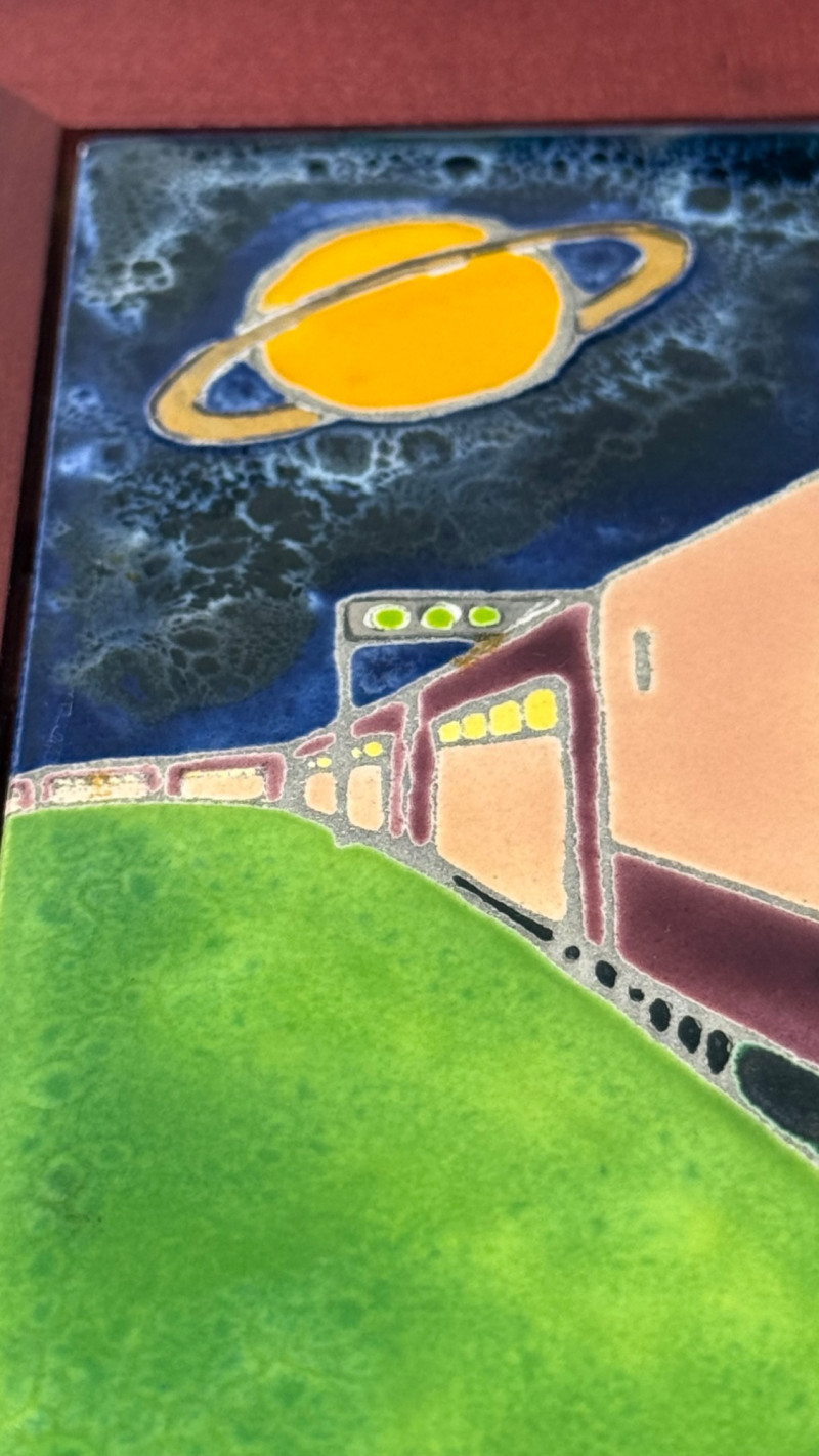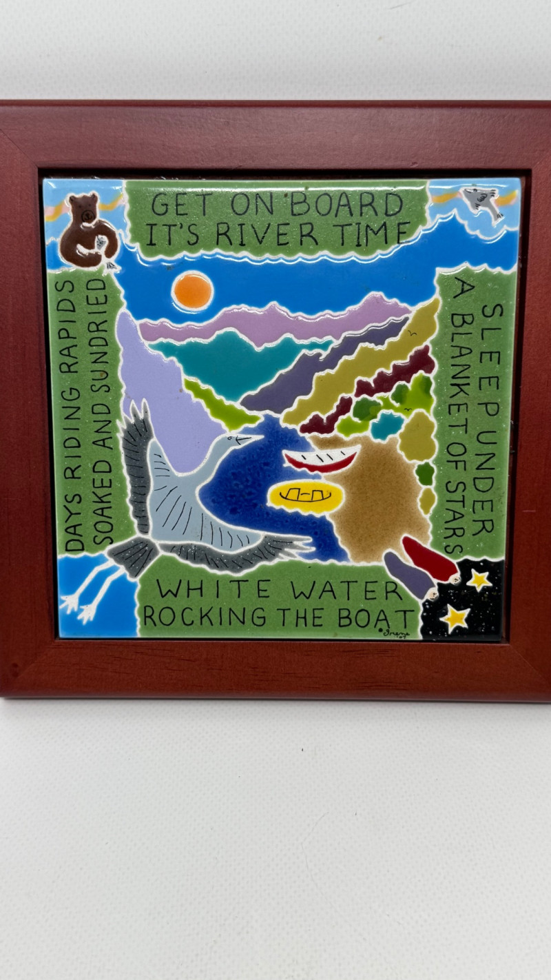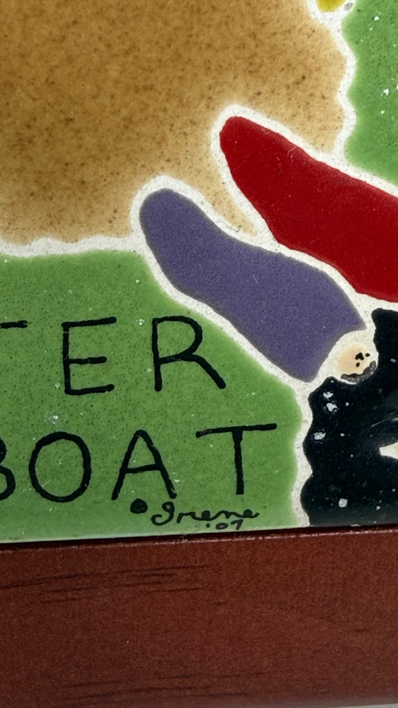 Beautiful collection of six handmade ceramic art tiles by Irene. Each is uniquely illustrated with whimsical dream-inspired designs and thoughtful messages. These pieces feature vibrant colors, textured glazing, and charming storytelling elements—perfect for adding warmth and personality to any space. Each tile is individually framed (mix of wood tones including red and black) and signed by the artist (dated mid-1980s). Backs are labeled “Irene’s Tiles – Handmade on a small island in the Pacific N.W.” and can be displayed on a wall or used decoratively. Themes include methods of transportation used to transport you to places of rest, nature, connection and imaginative scenes with phrases. "For the boat to come in, build a dock". A cohesive yet varied set that works beautifully as a gallery wall or standalone accents.