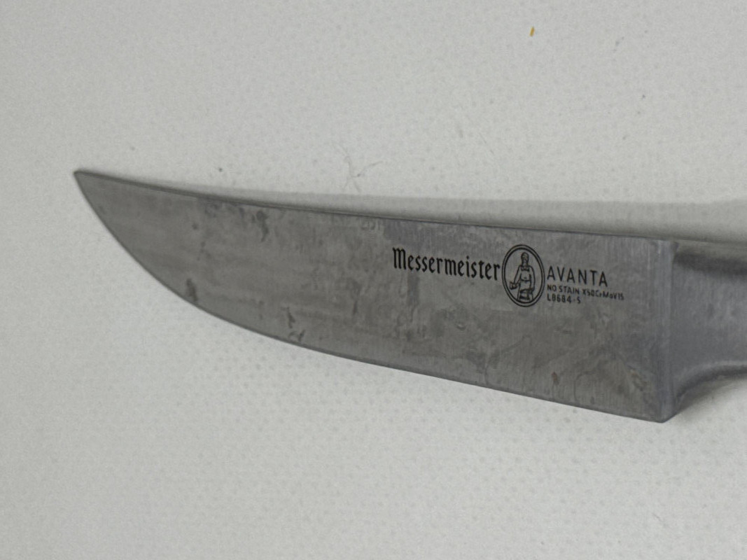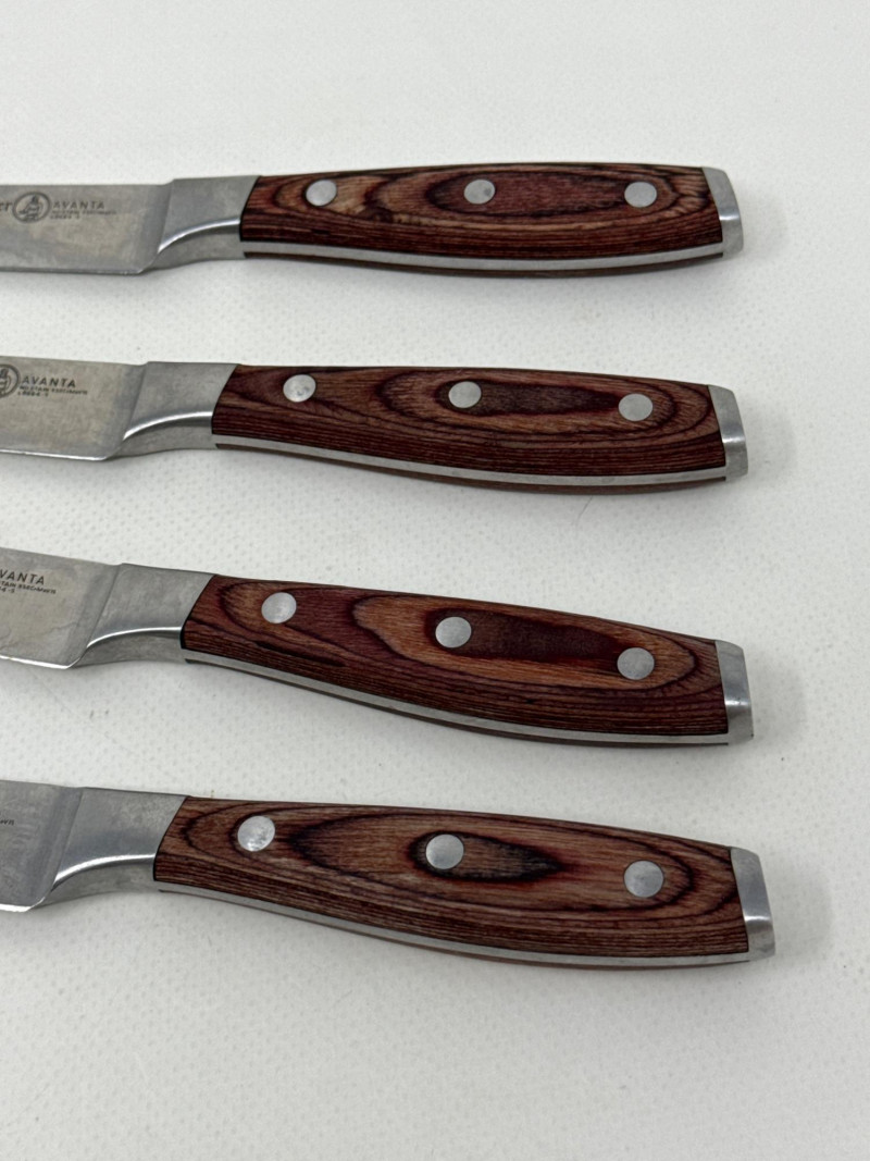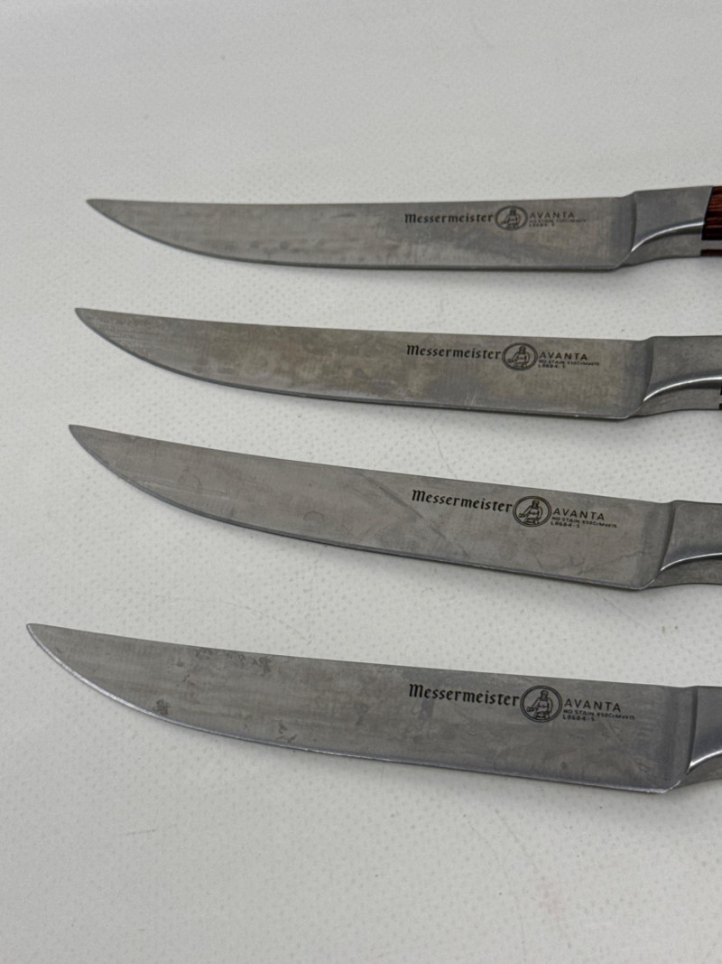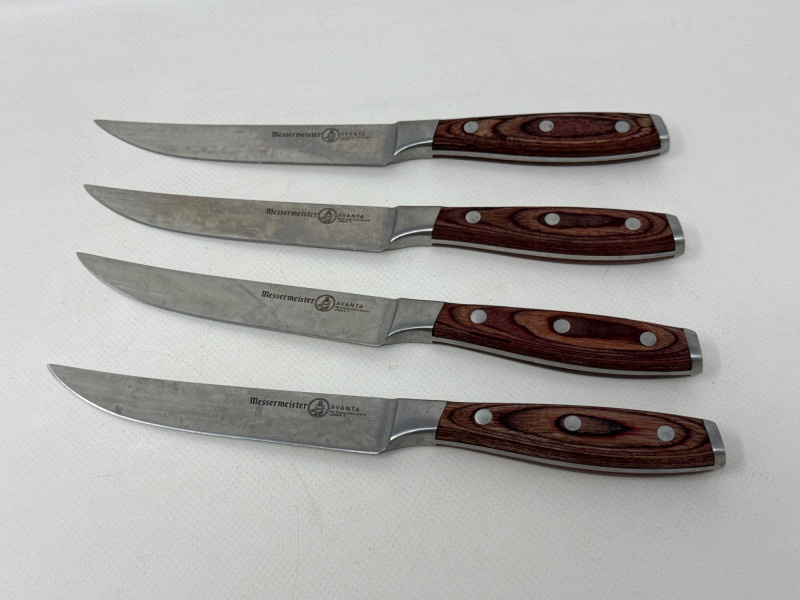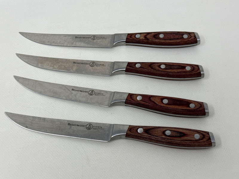 Set of four Messermeister Avanta steak knives featuring sleek stainless steel blades and rich wood handles with triple rivet construction. Each knife has a 5-inch blade, ideal for cutting steaks and other meats with ease. These knives show visible signs of use, including surface scratches and patina on the blades, but remain solid, functional, and durable. The handles are in good condition with a comfortable grip and classic look.