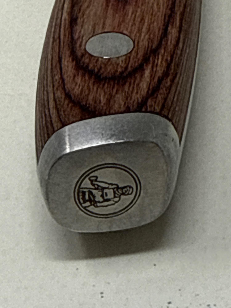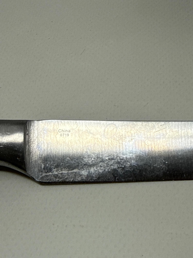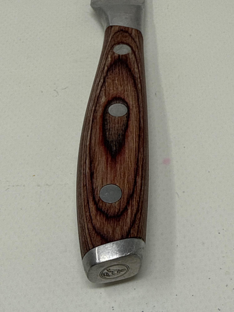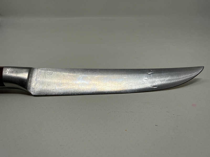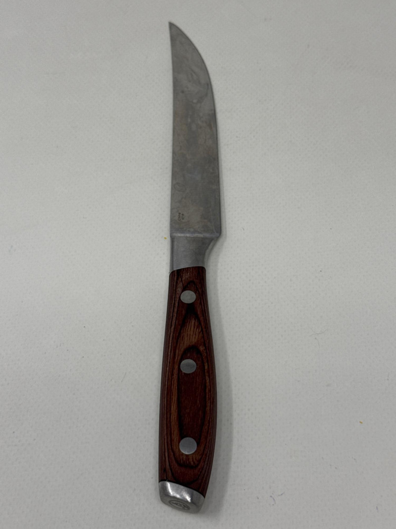 Set of four Messermeister Avanta steak knives featuring sleek stainless steel blades and rich wood handles with triple rivet construction. Each knife has a 5-inch blade, ideal for cutting steaks and other meats with ease. These knives show visible signs of use, including surface scratches and patina on the blades, but remain solid, functional, and durable. The handles are in good condition with a comfortable grip and classic look.