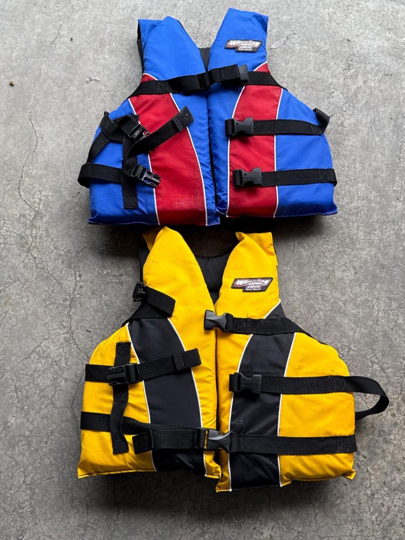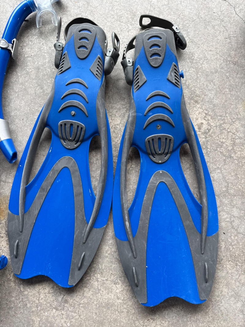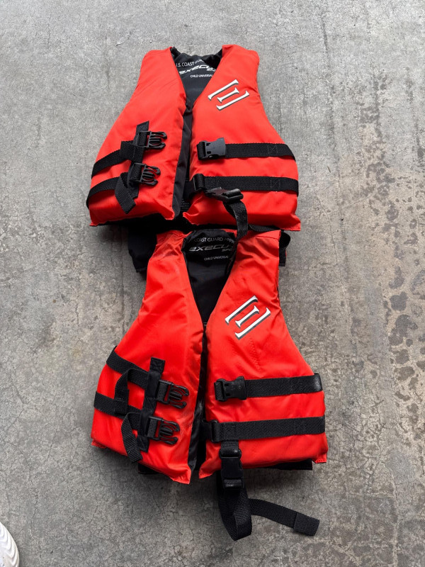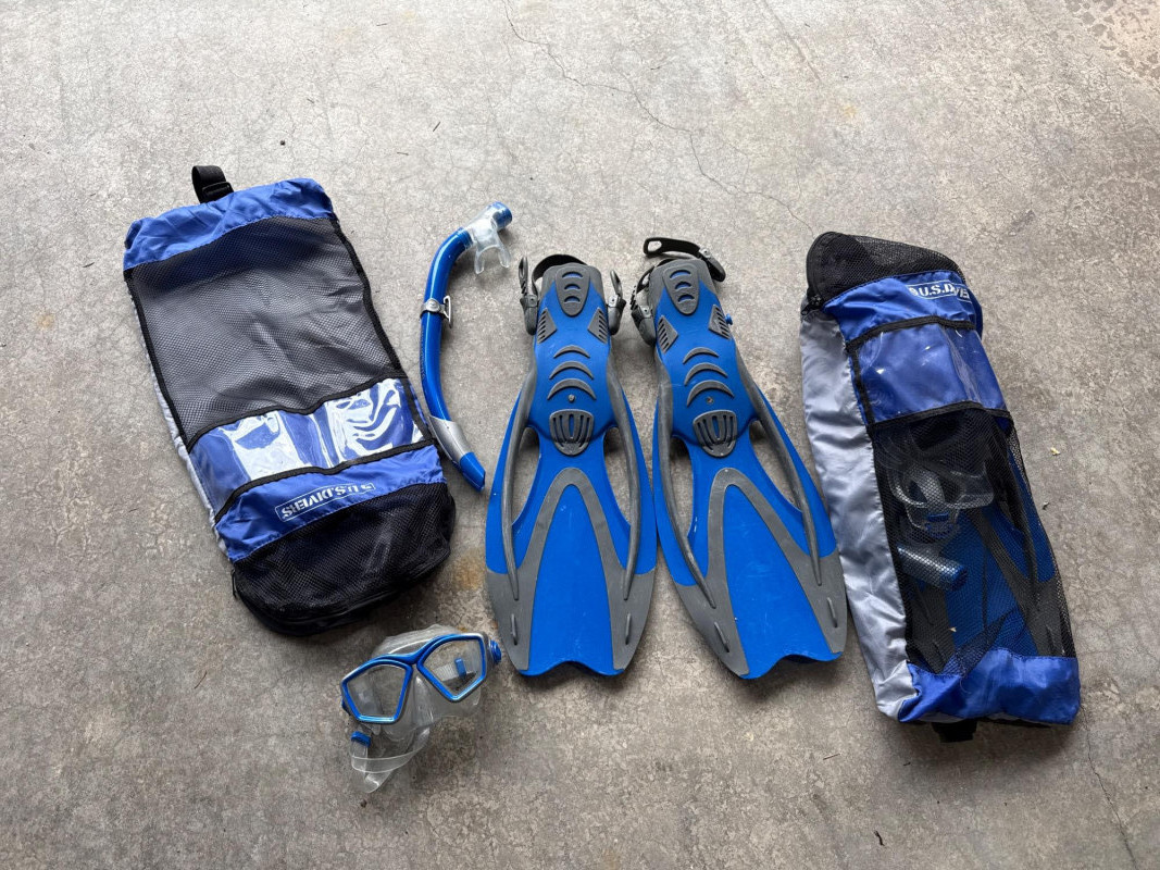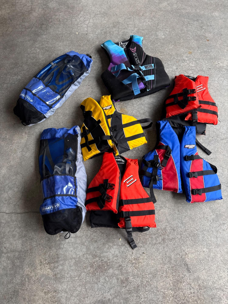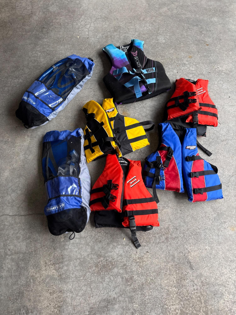 Keep the family safe this summer, with multiple life preservers. Youth and ladies' sizes. See pics for details and ratings. 5 Total. Two sets of snorkeling gear. Goggles, breathing apparatus, fins (size L 10/13) and mesh bag. In good condition with some use evident.