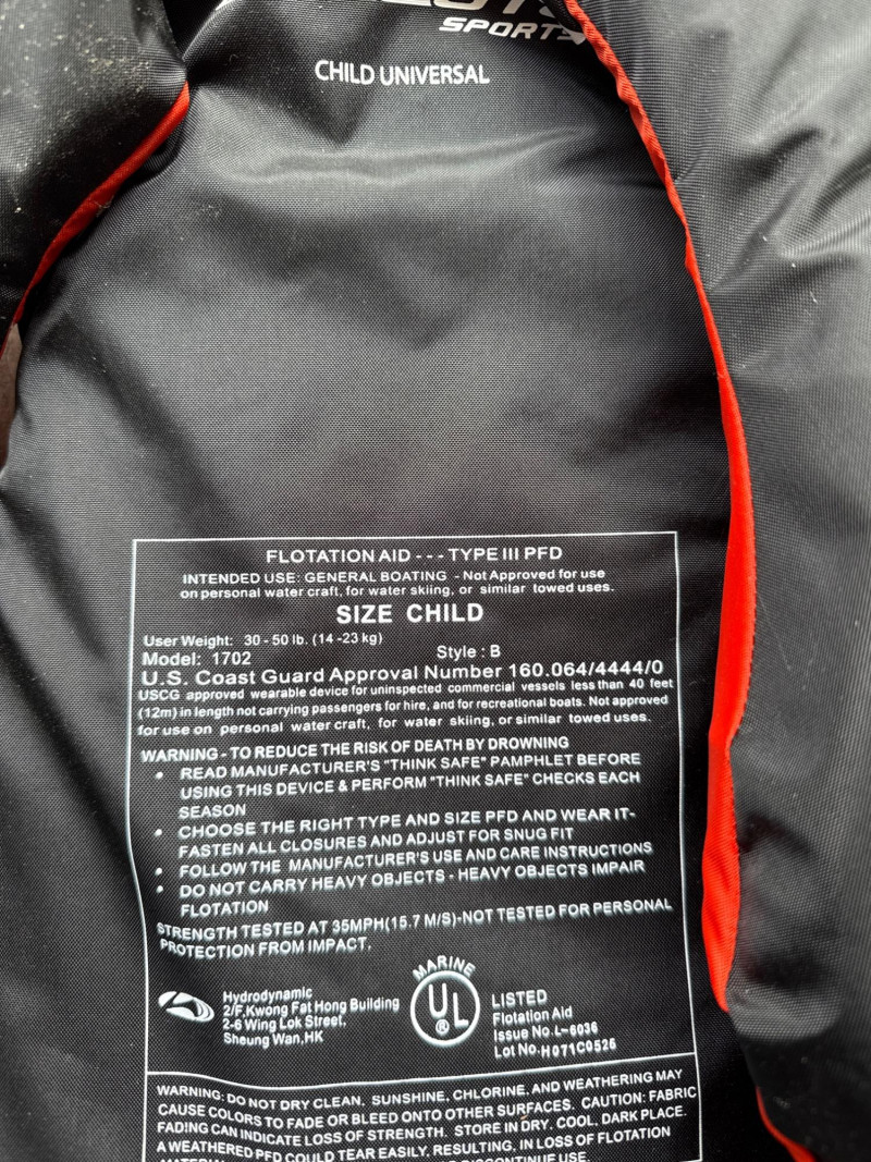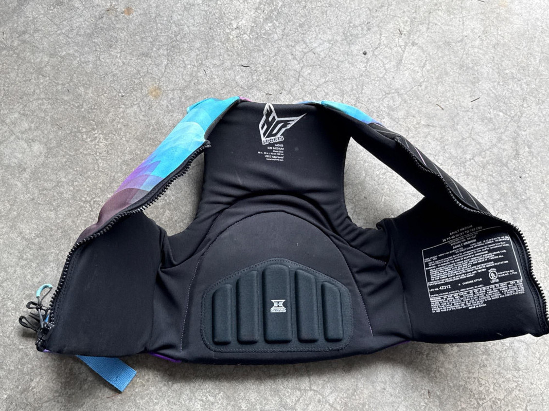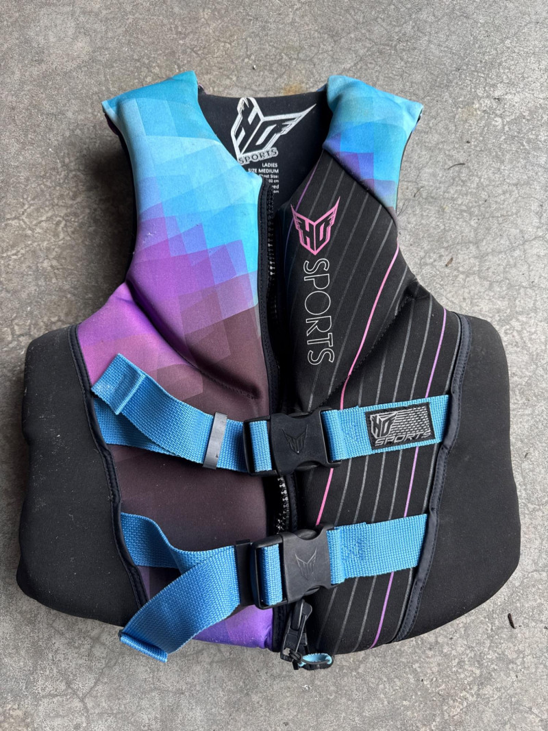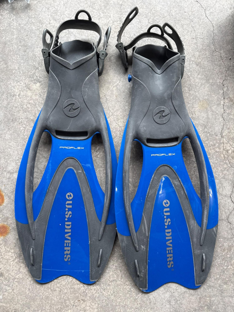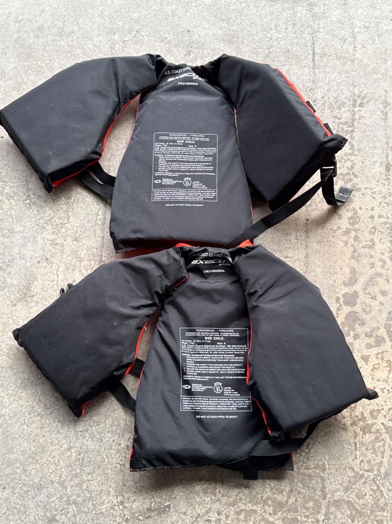 Keep the family safe this summer, with multiple life preservers. Youth and ladies' sizes. See pics for details and ratings. 5 Total. Two sets of snorkeling gear. Goggles, breathing apparatus, fins (size L 10/13) and mesh bag. In good condition with some use evident.