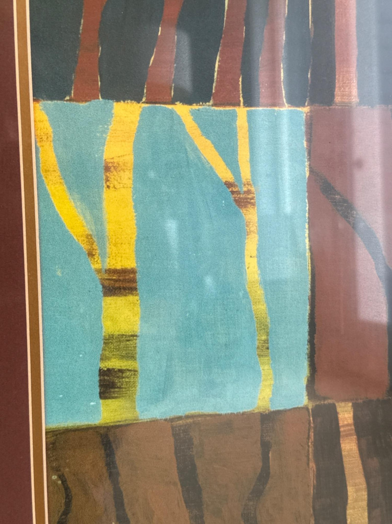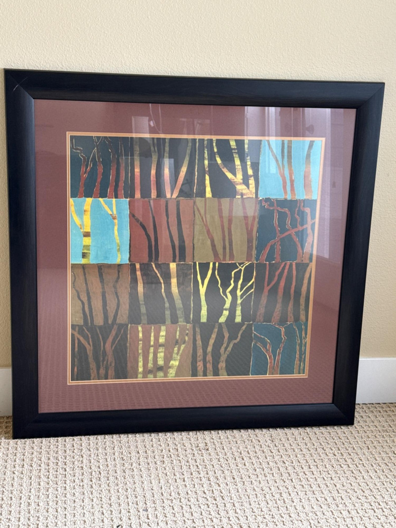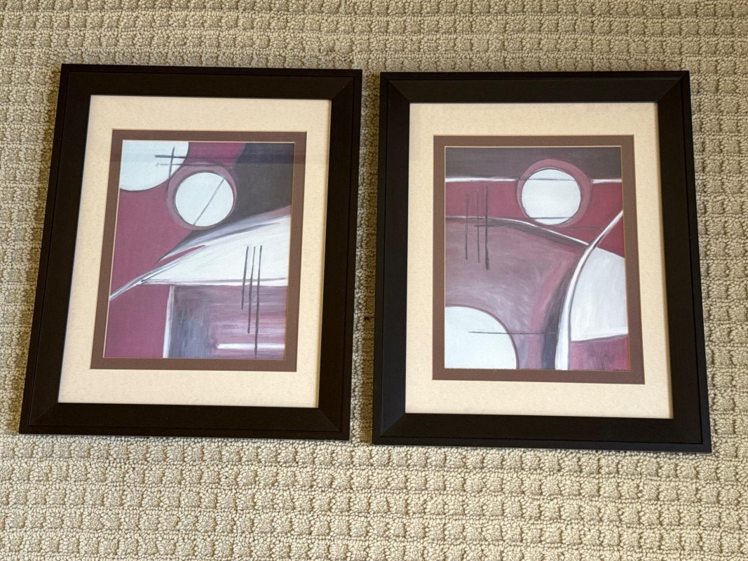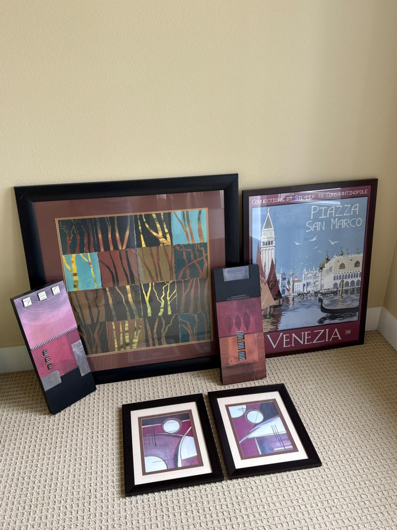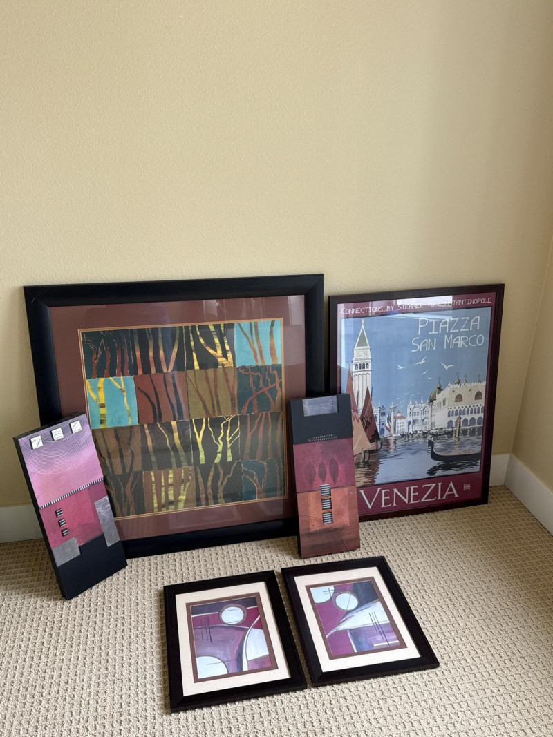 Large lot of contemporary art. Lots of detail and design. Circa design pair is 16 inches long, 13 inches wide. To triptych wood pieces are 8 inches wide, 20 inches tall. Travel poster dimensions 23.5 inches wide, 35 inches tall. Red trees by Gail Schuler is 34.5 in. Square.