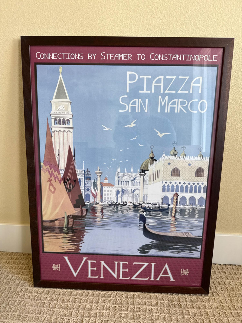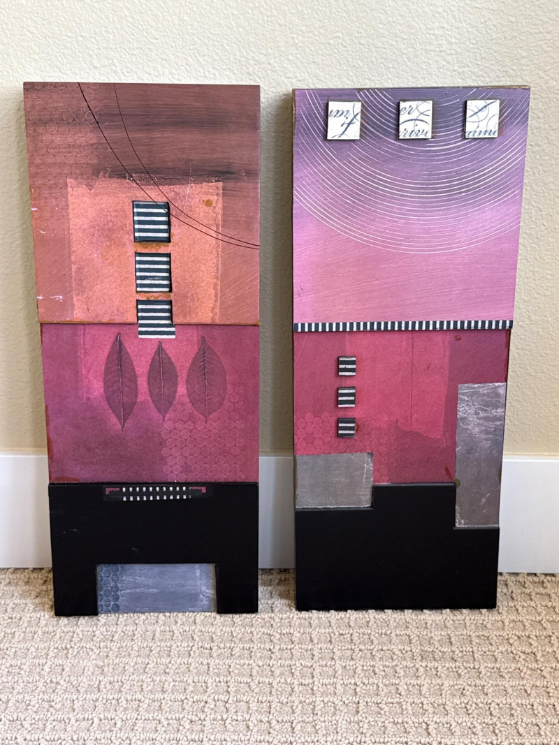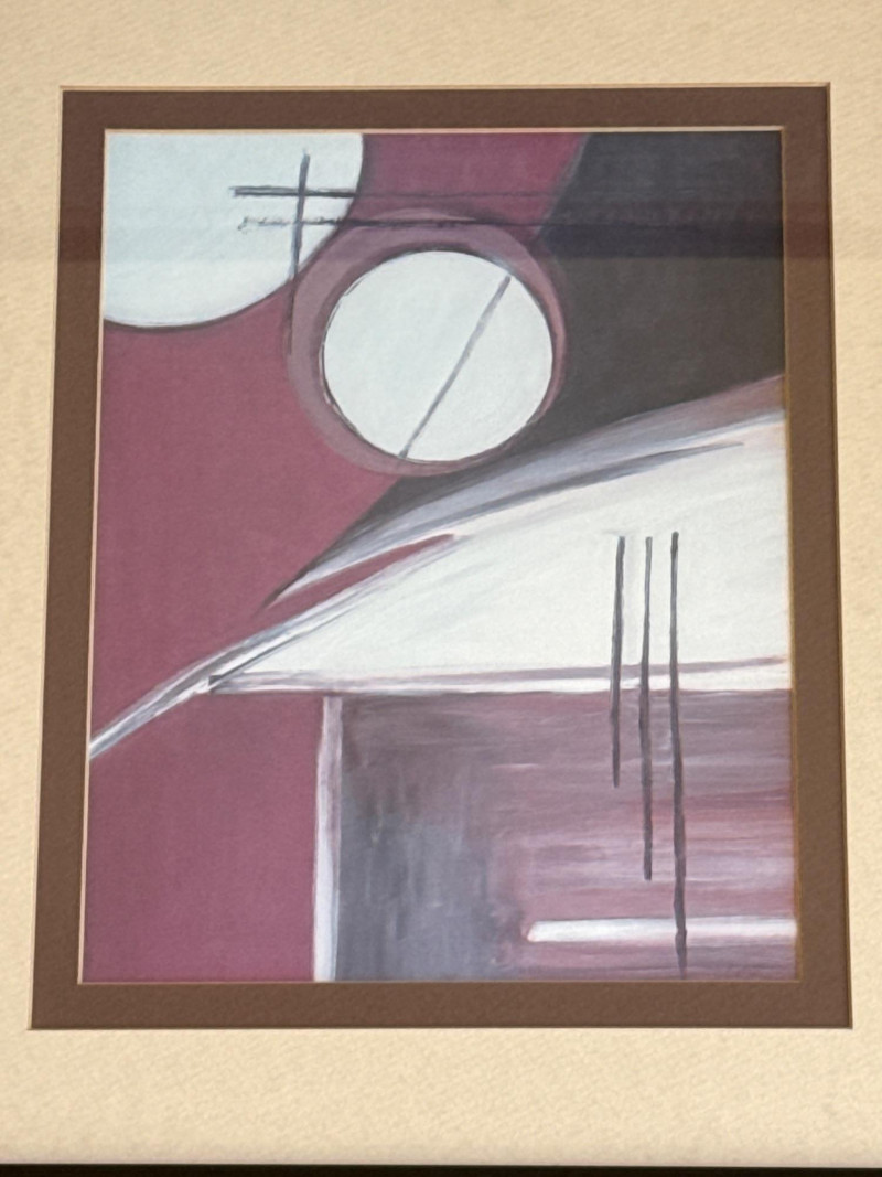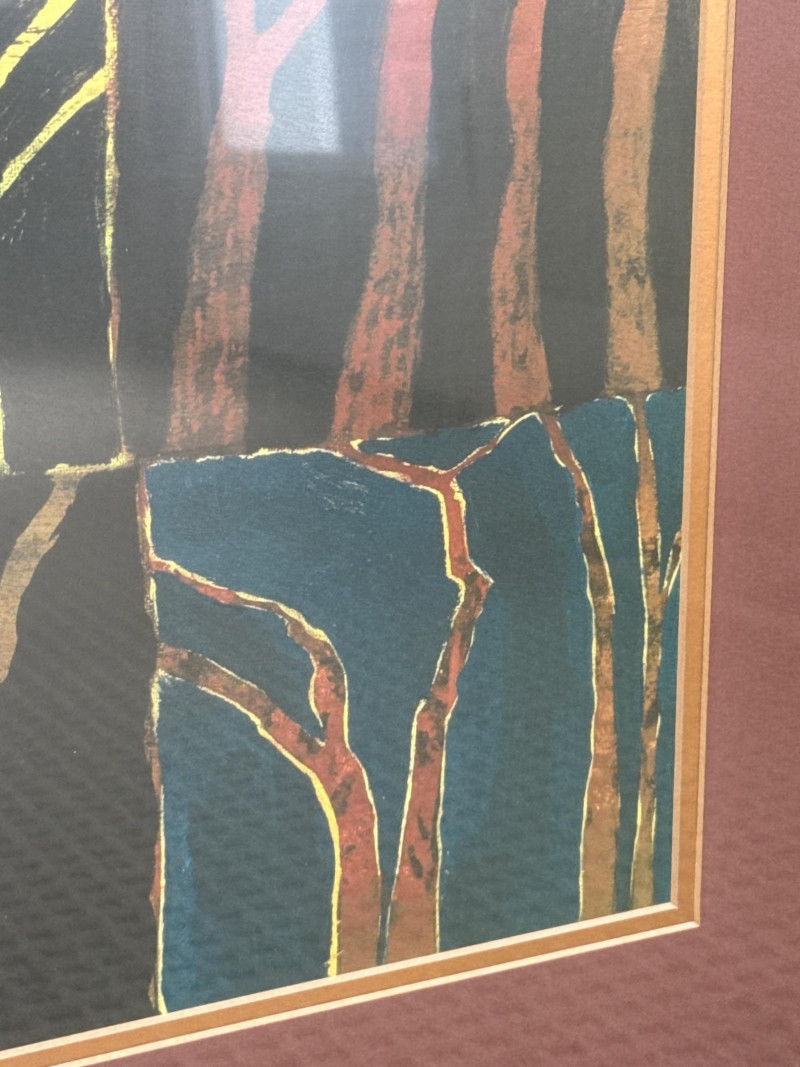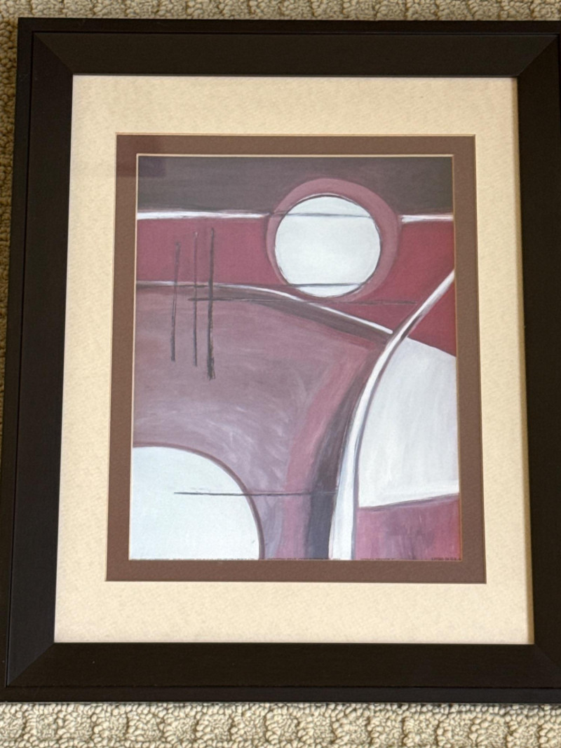 Large lot of contemporary art. Lots of detail and design. Circa design pair is 16 inches long, 13 inches wide. To triptych wood pieces are 8 inches wide, 20 inches tall. Travel poster dimensions 23.5 inches wide, 35 inches tall. Red trees by Gail Schuler is 34.5 in. Square.