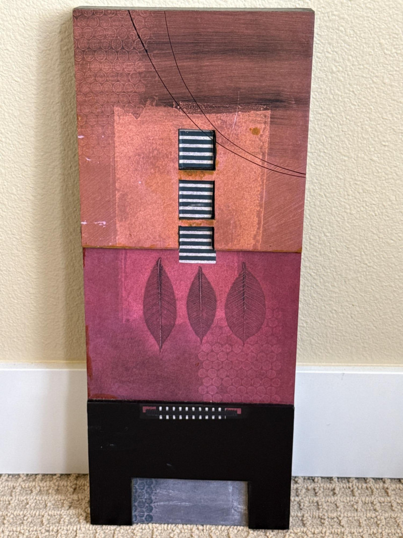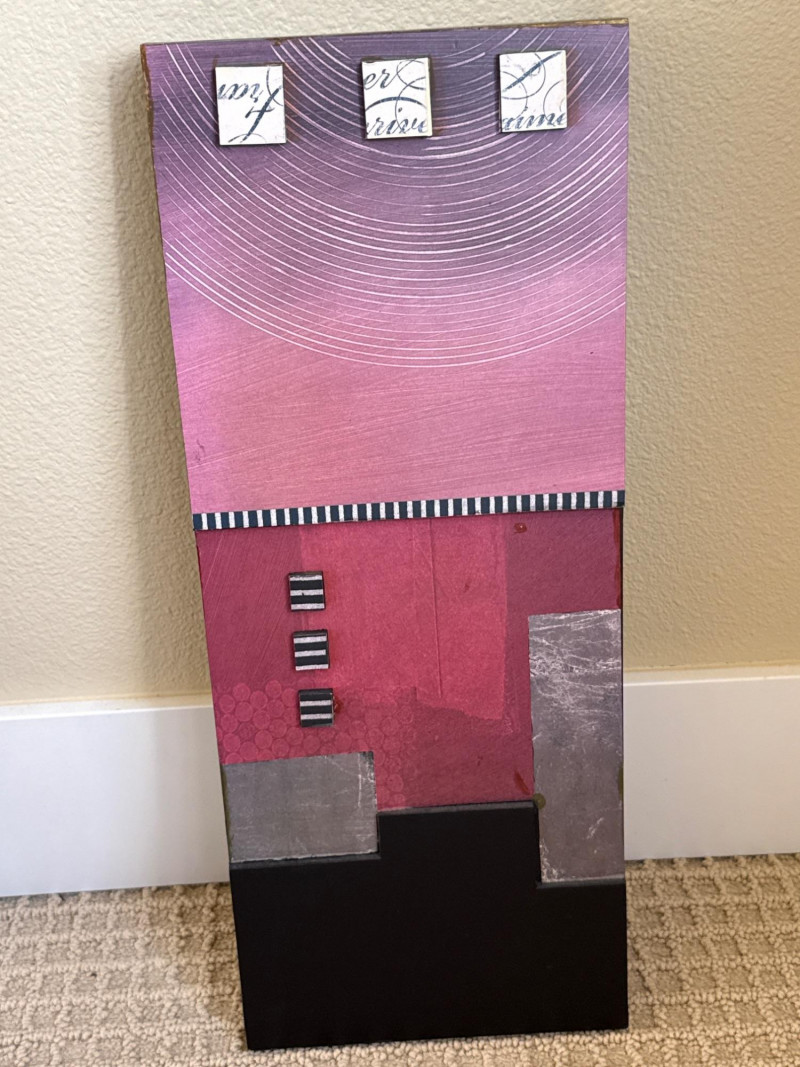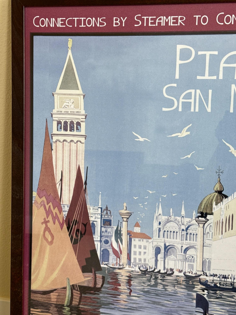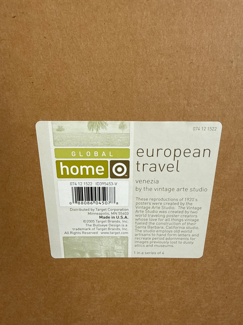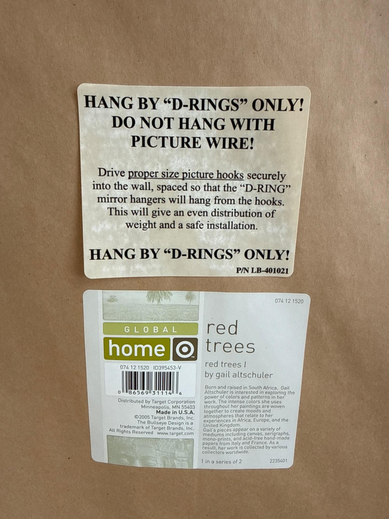 Large lot of contemporary art. Lots of detail and design. Circa design pair is 16 inches long, 13 inches wide. To triptych wood pieces are 8 inches wide, 20 inches tall. Travel poster dimensions 23.5 inches wide, 35 inches tall. Red trees by Gail Schuler is 34.5 in. Square.