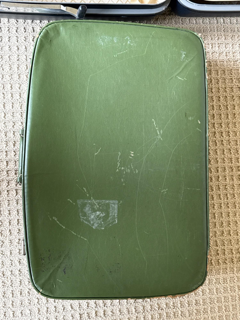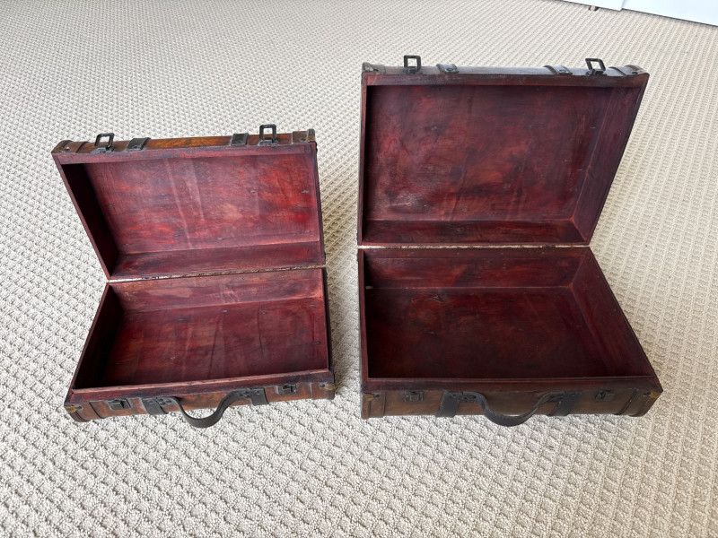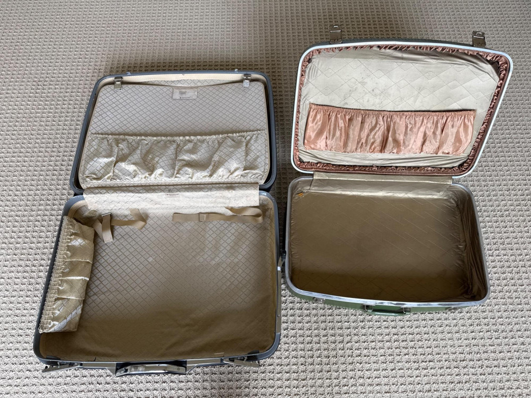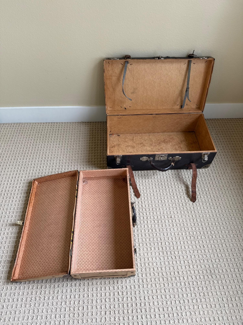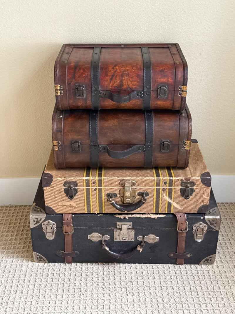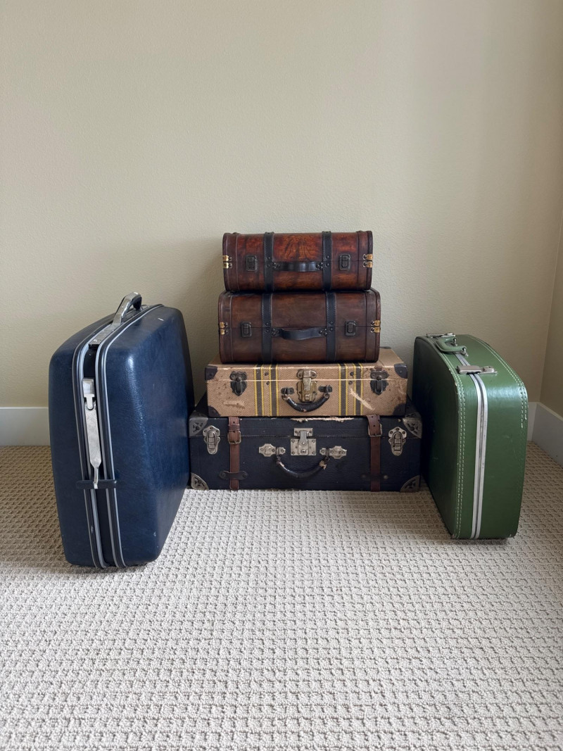 Six vintage suitcases, ideal for display or repurpose. Two are decorative, wood, and leather suitcases. Samsonite blue rolling case. Green case from a similar era. Two vintage trunks with leather, metal and wood construction. Condition is fair. Lots of age and wear. Loads of character. Did not have any unusual smells or damage, outside of age and normal use.