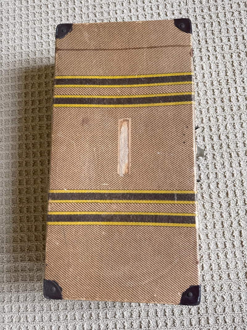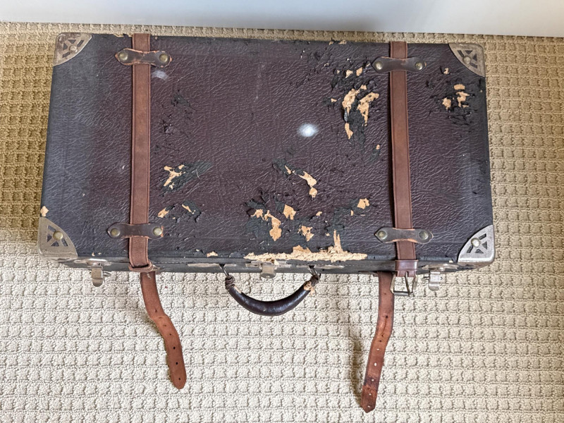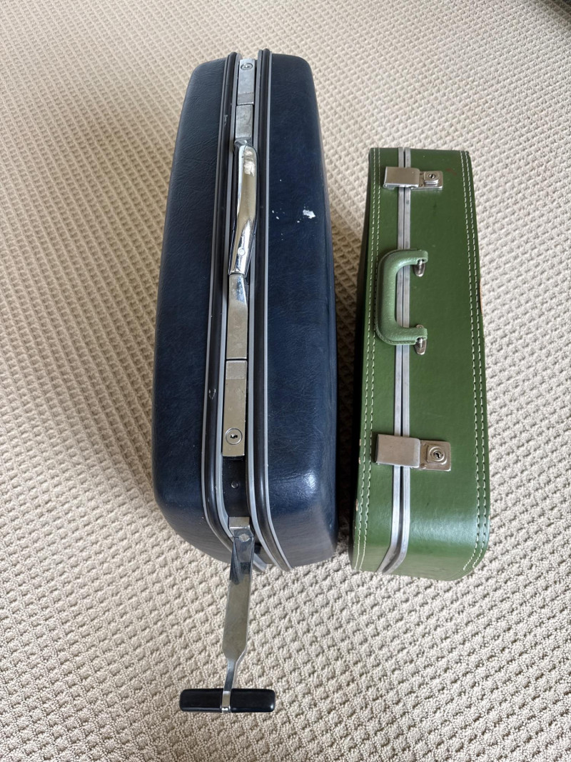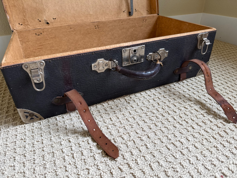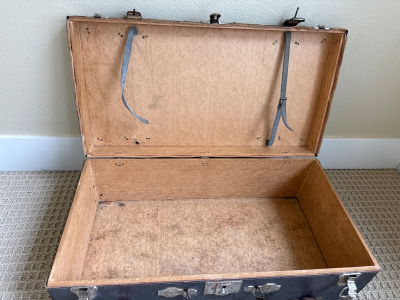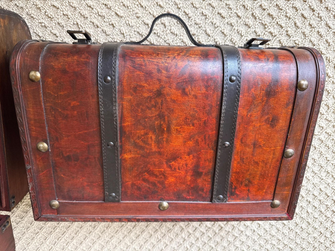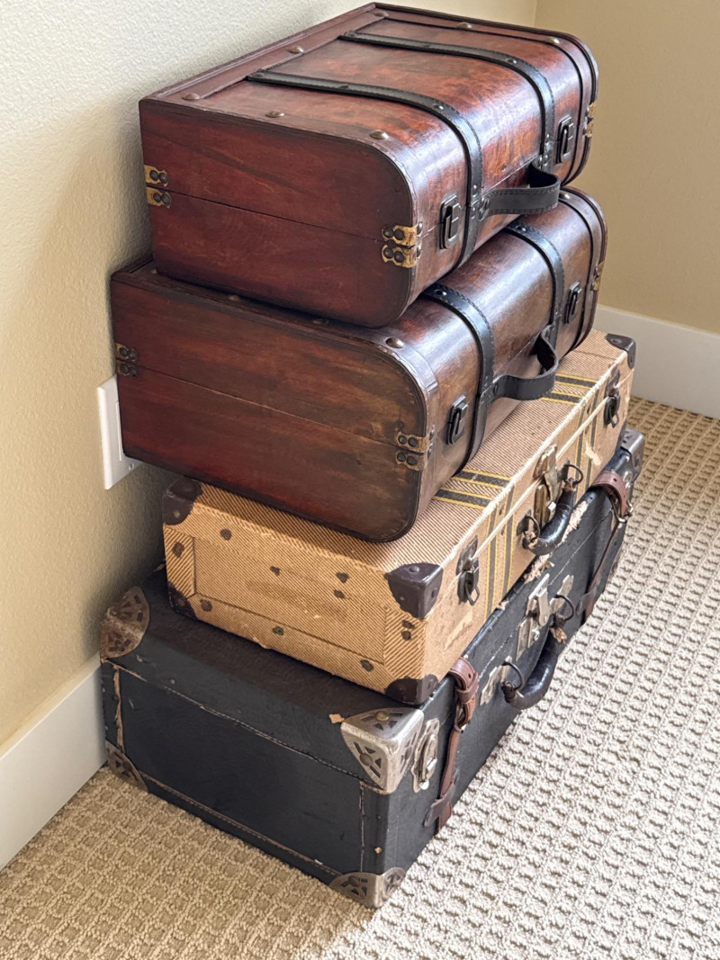 Six vintage suitcases, ideal for display or repurpose. Two are decorative, wood, and leather suitcases. Samsonite blue rolling case. Green case from a similar era. Two vintage trunks with leather, metal and wood construction. Condition is fair. Lots of age and wear. Loads of character. Did not have any unusual smells or damage, outside of age and normal use.