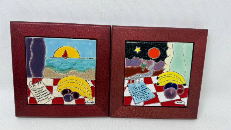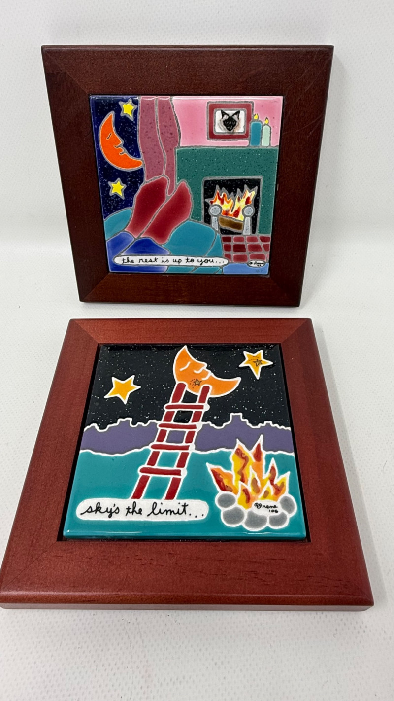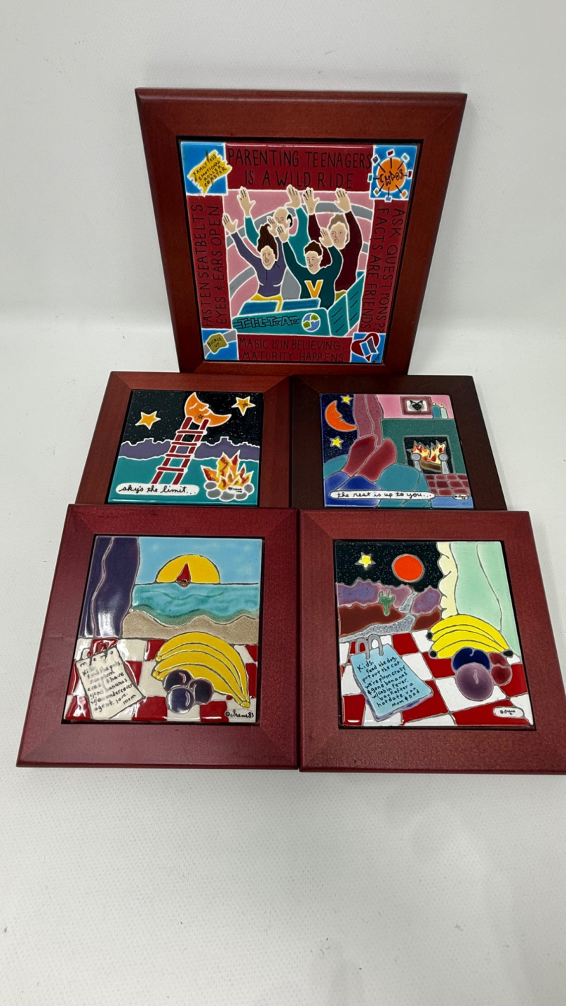 Five handcrafted ceramic art tiles by "Irene". The theme of this collection focuses on wisdom from parents and family. Each one is mounted on simple wooden frames. Each tile features bold colors, symbolic imagery, and short poetic phrases, giving the collection a whimsical, expressive, almost folk‑art feel. The collection feels like a set of intimate, symbolic story tiles, each blending: