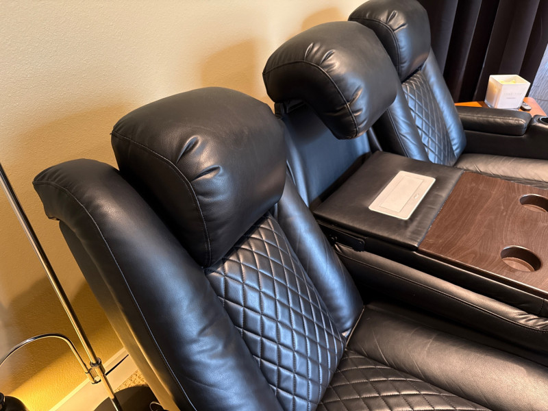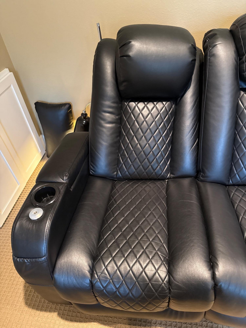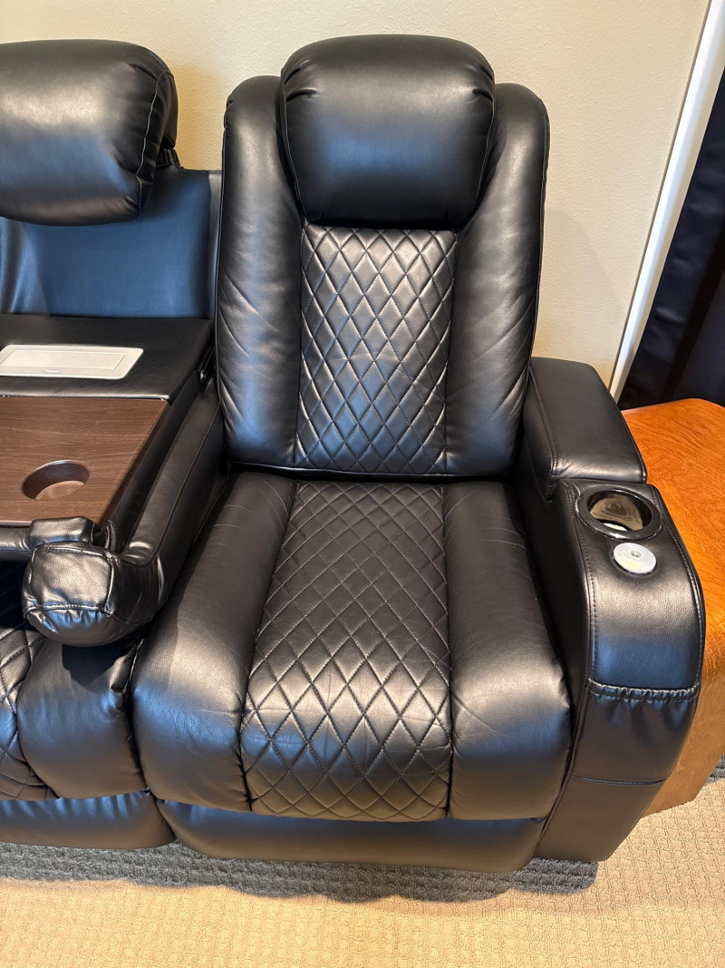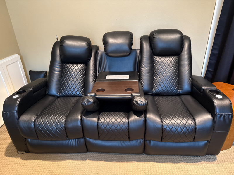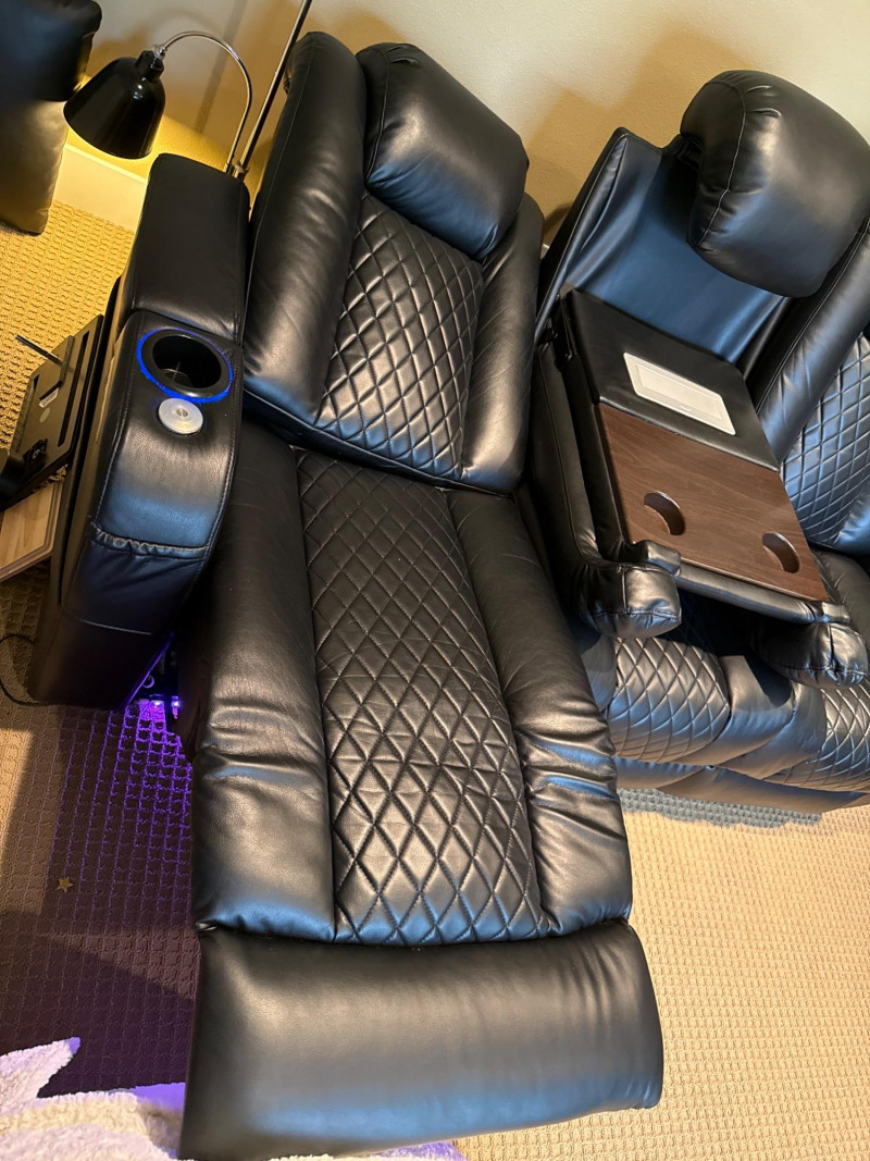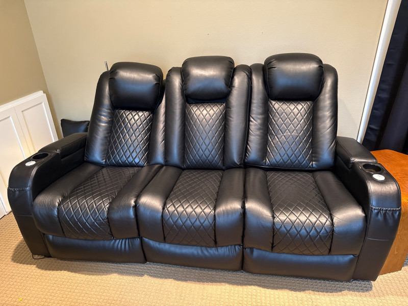 Fully loaded recliner set with all the bells and whistles. Removable trays, lighted cup holders, multiple storage options, charging ports, under seat lighting and more. One seat appears to be off track slightly and leans. it still functions normally. Multiple settings. Upholstery is in great condition. **Sold as is. **MUST BRING TOOLS, EQUIPMENT AND SUPPORT TO LOAD. EASY LOAD LOCATION. **
