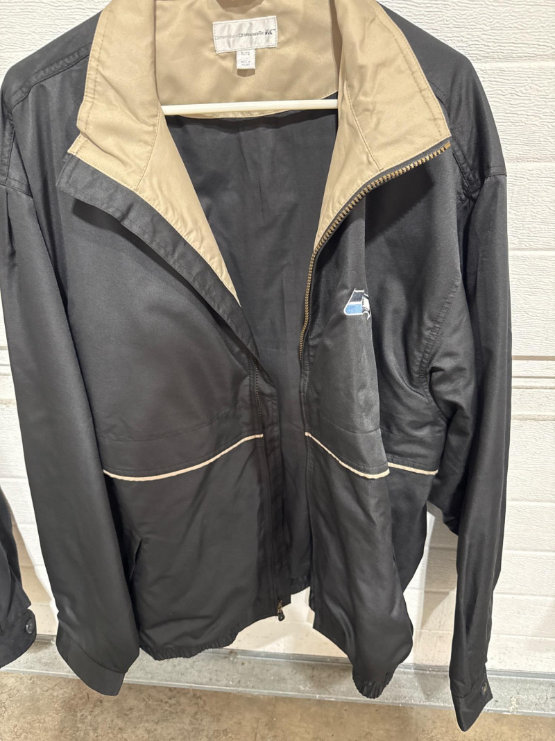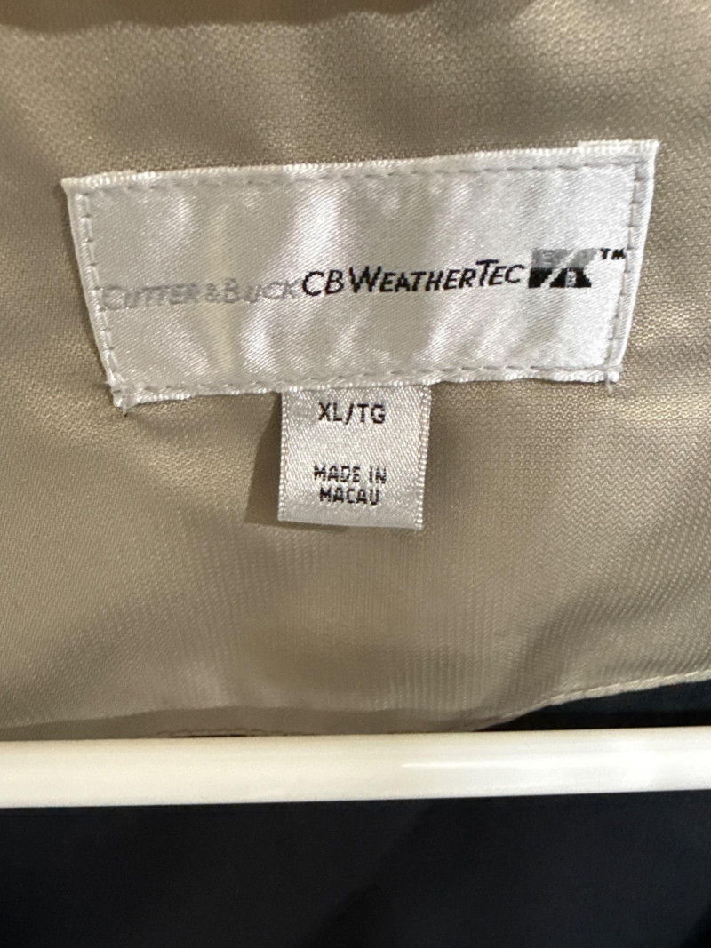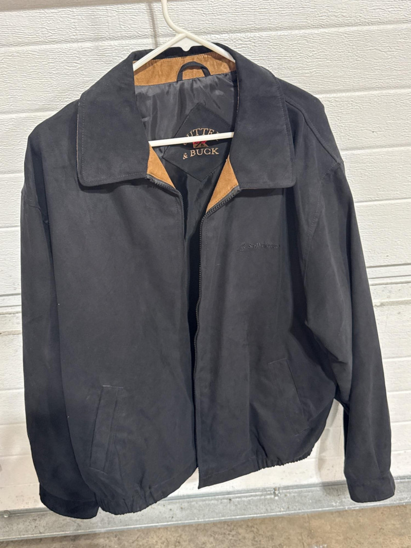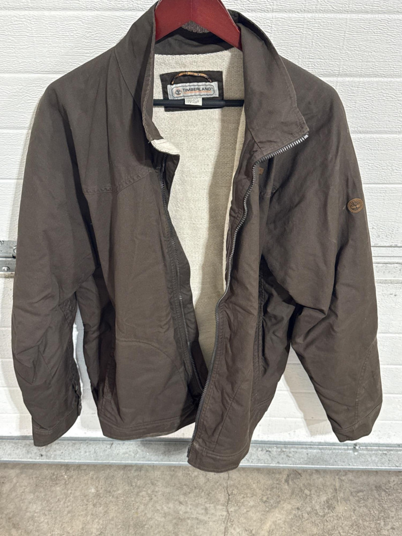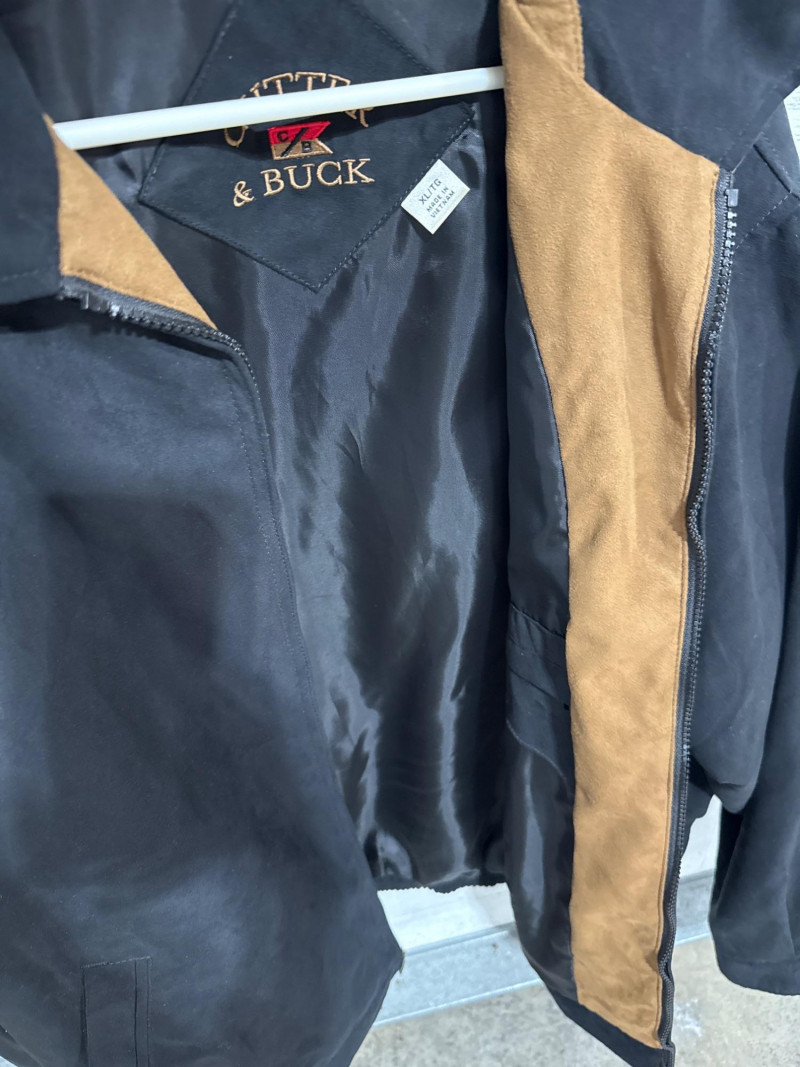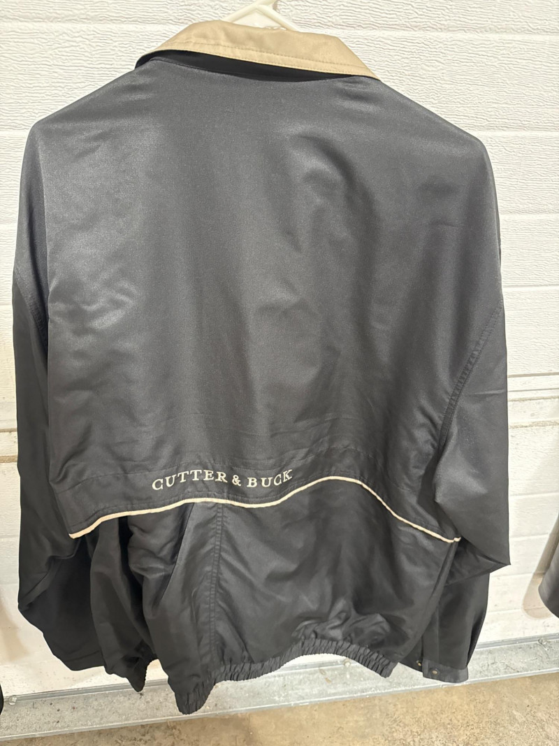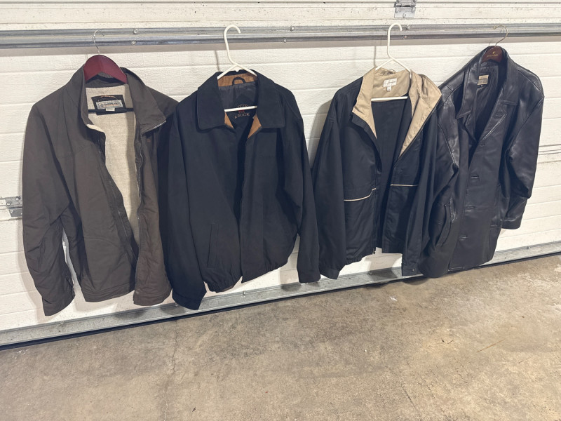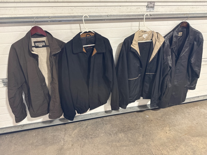 Leather jacket is Robert Comstock endurance. Size 44. Cutter and Buck lightweight jackets. Both are size XL. Timberland lightweight jacket with woven liner. Size XL All are in nice condition. Black and tan Cutter Buck coat is lightweight suede.