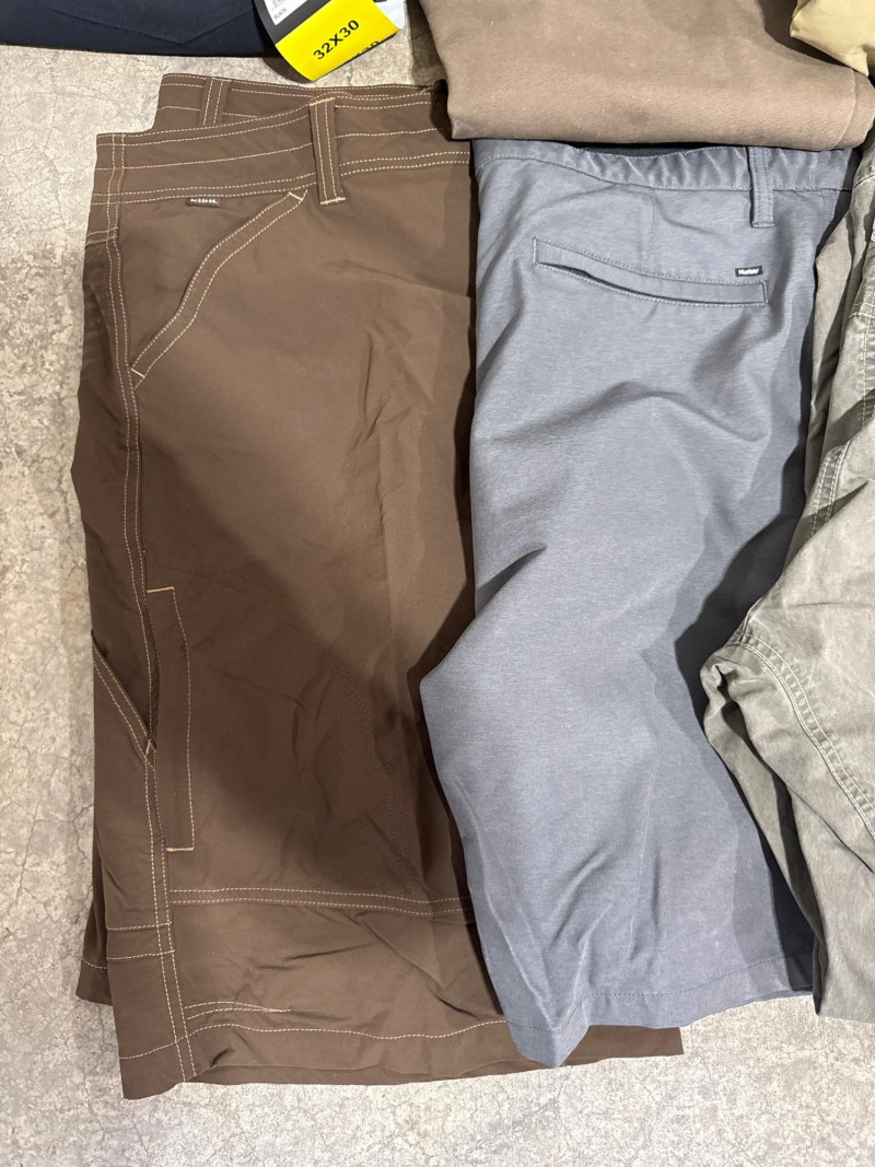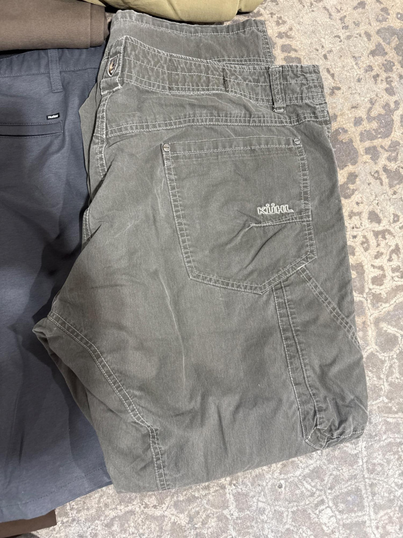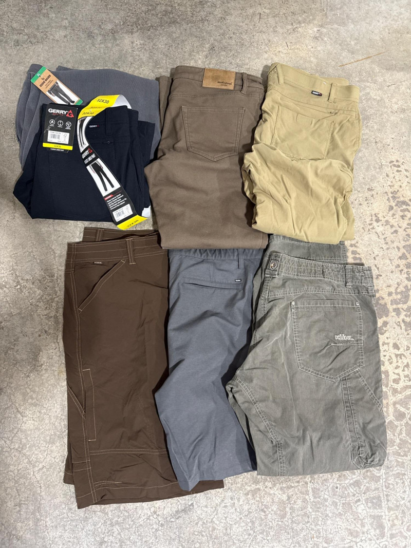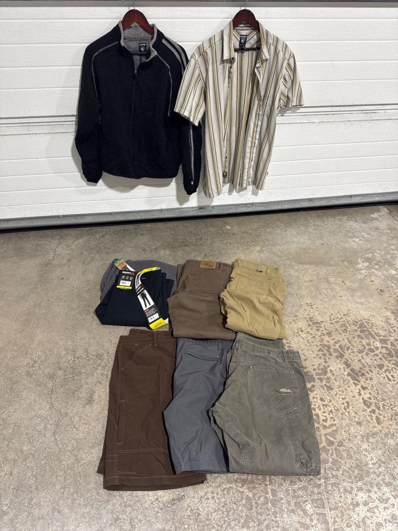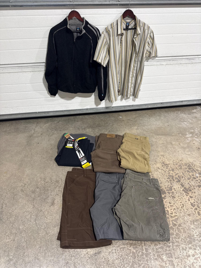 Popular brand Kuhl and Gerry clothing for men. Shorts, Pants, Sweater and shirt. Kuhl zippered wool sweater in XL. Button down shirt New-Textured XL lounge set from Eddie Bauer New-GERRY fleece lined pants are 32x30 Weatherproof pants are fleece lined. Used clothing, but did not see any damage outside of normal wear.