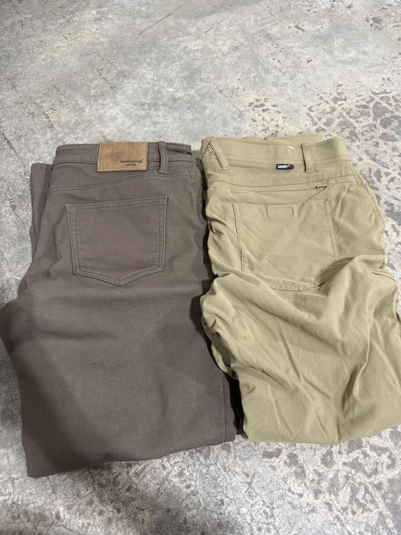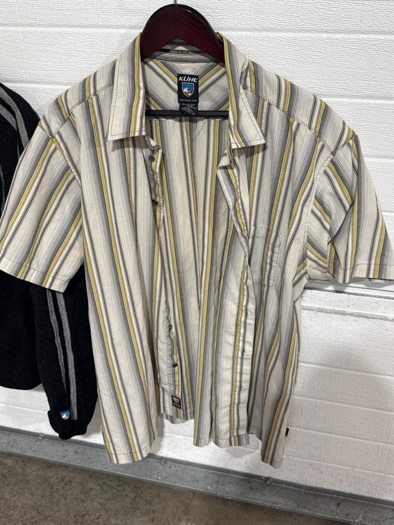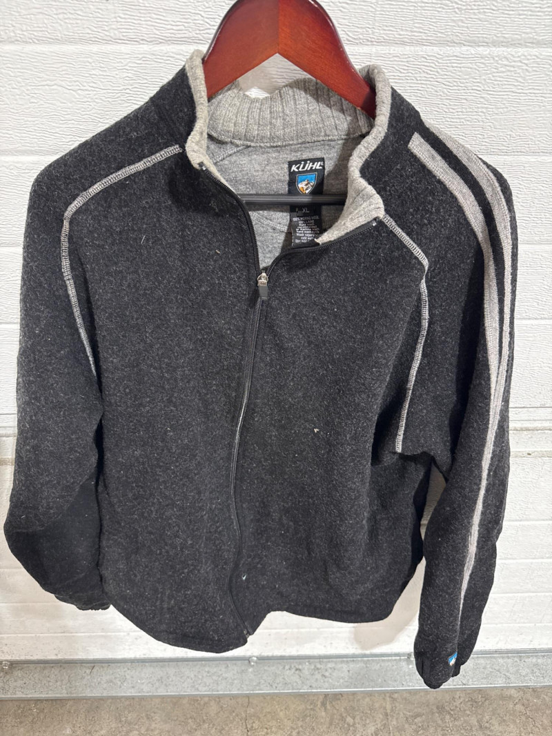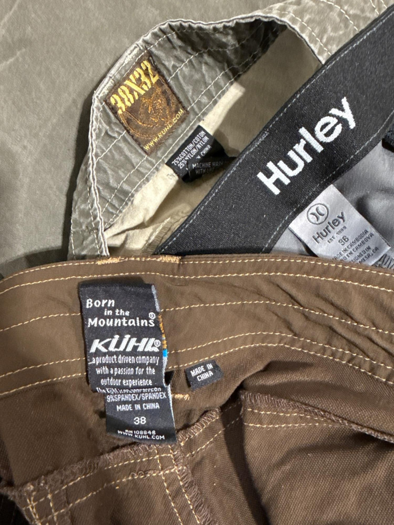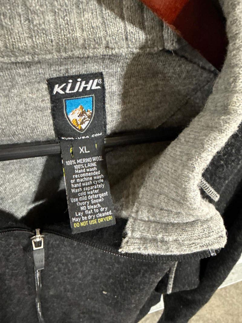 Popular brand Kuhl and Gerry clothing for men. Shorts, Pants, Sweater and shirt. Kuhl zippered wool sweater in XL. Button down shirt New-Textured XL lounge set from Eddie Bauer New-GERRY fleece lined pants are 32x30 Weatherproof pants are fleece lined. Used clothing, but did not see any damage outside of normal wear.