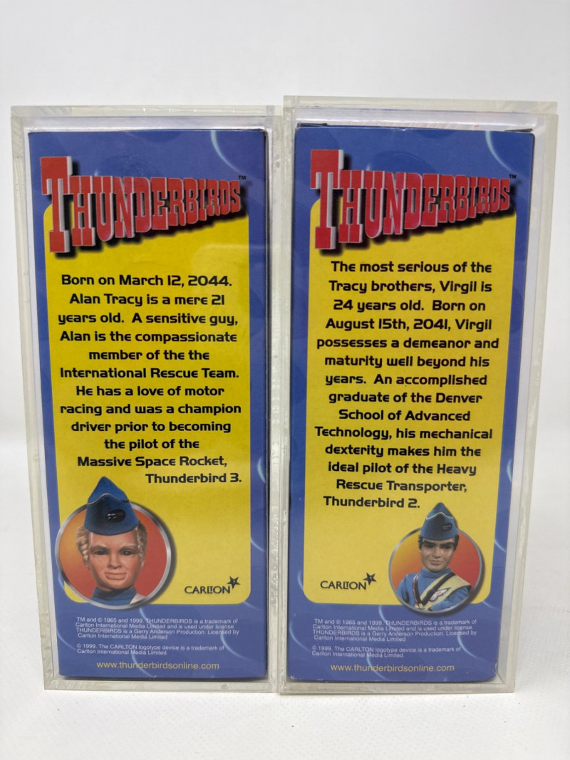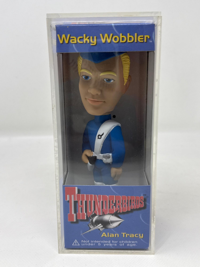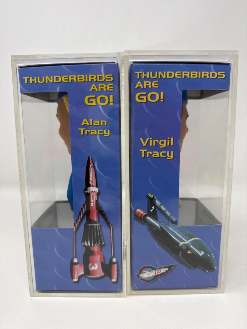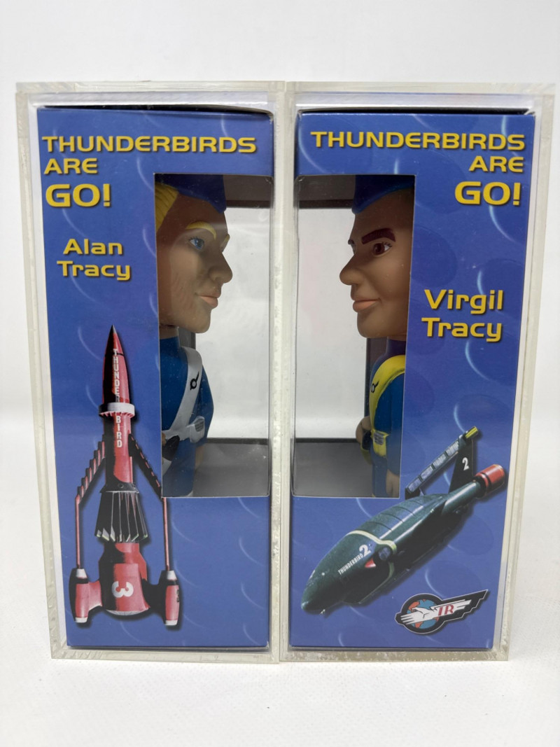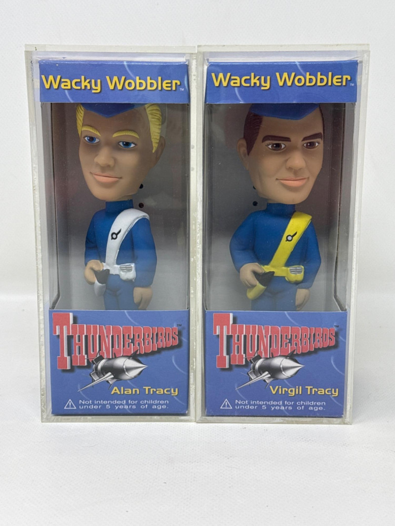 Up for sale is a vintage set of Funko Wacky Wobblers featuring Alan Tracy and Virgil Tracy from the classic Thunderbirds series. These collectible bobbleheads come new in box (NIB) and include their original protective display cases. Both figures showcase the iconic blue uniforms and signature details true to the beloved Thunderbirds characters. A great addition for Funko collectors or fans of classic animation and retro memorabilia. The items are in great condition