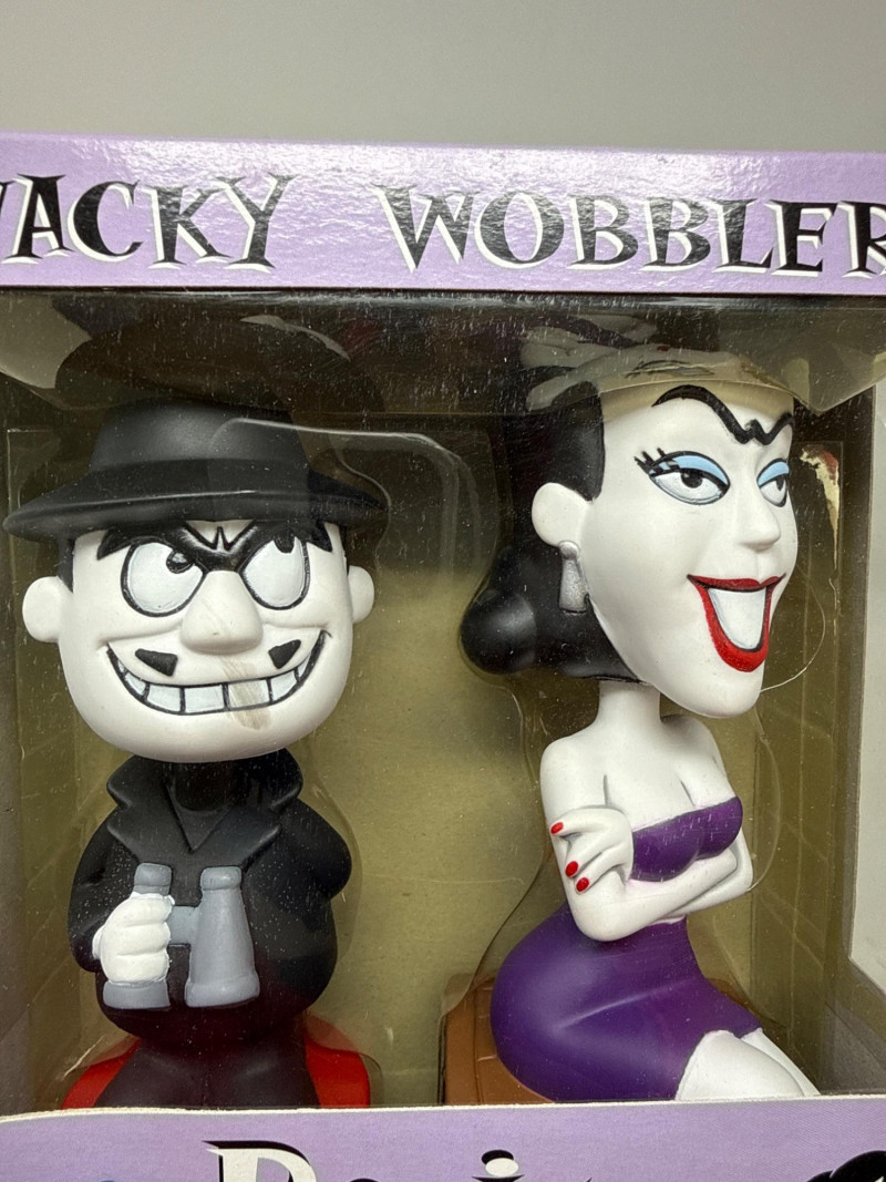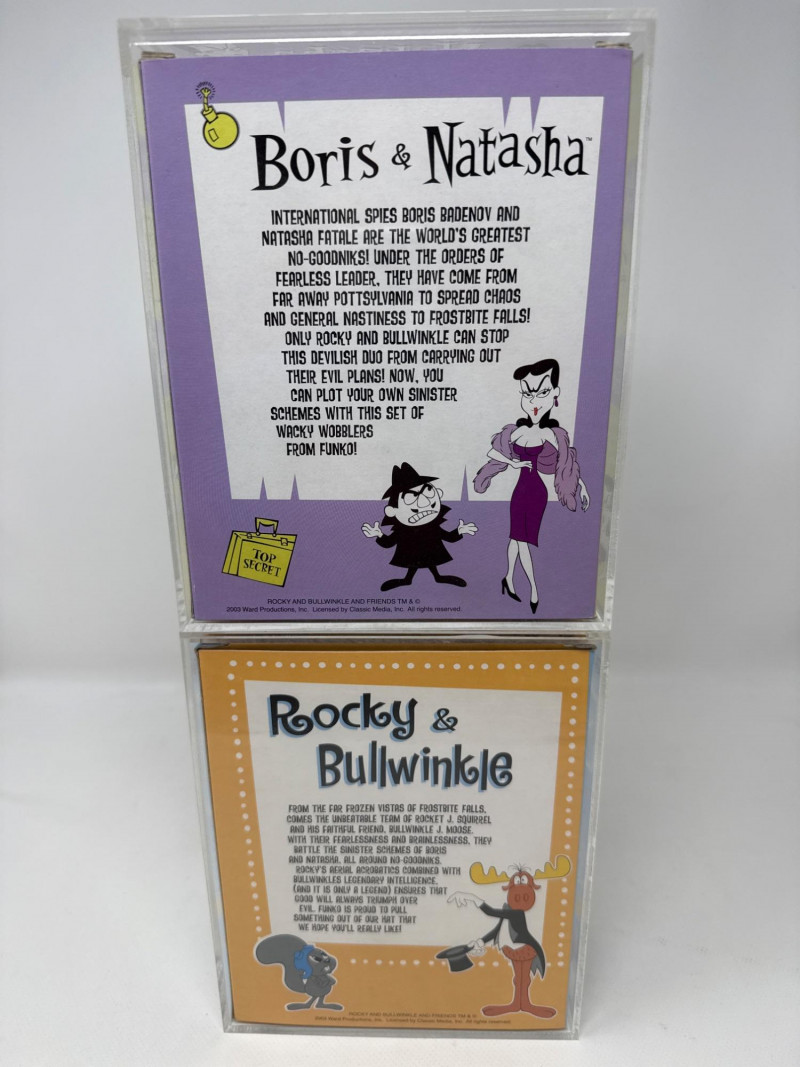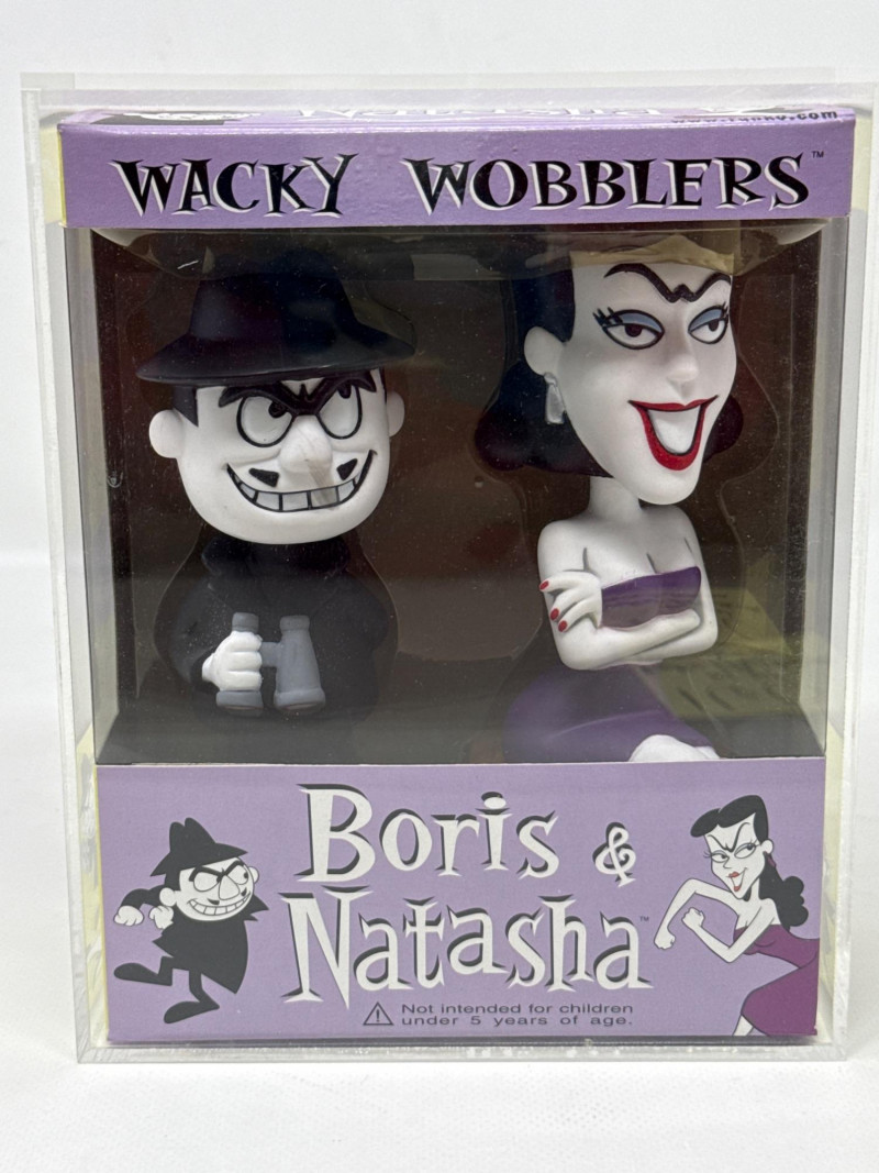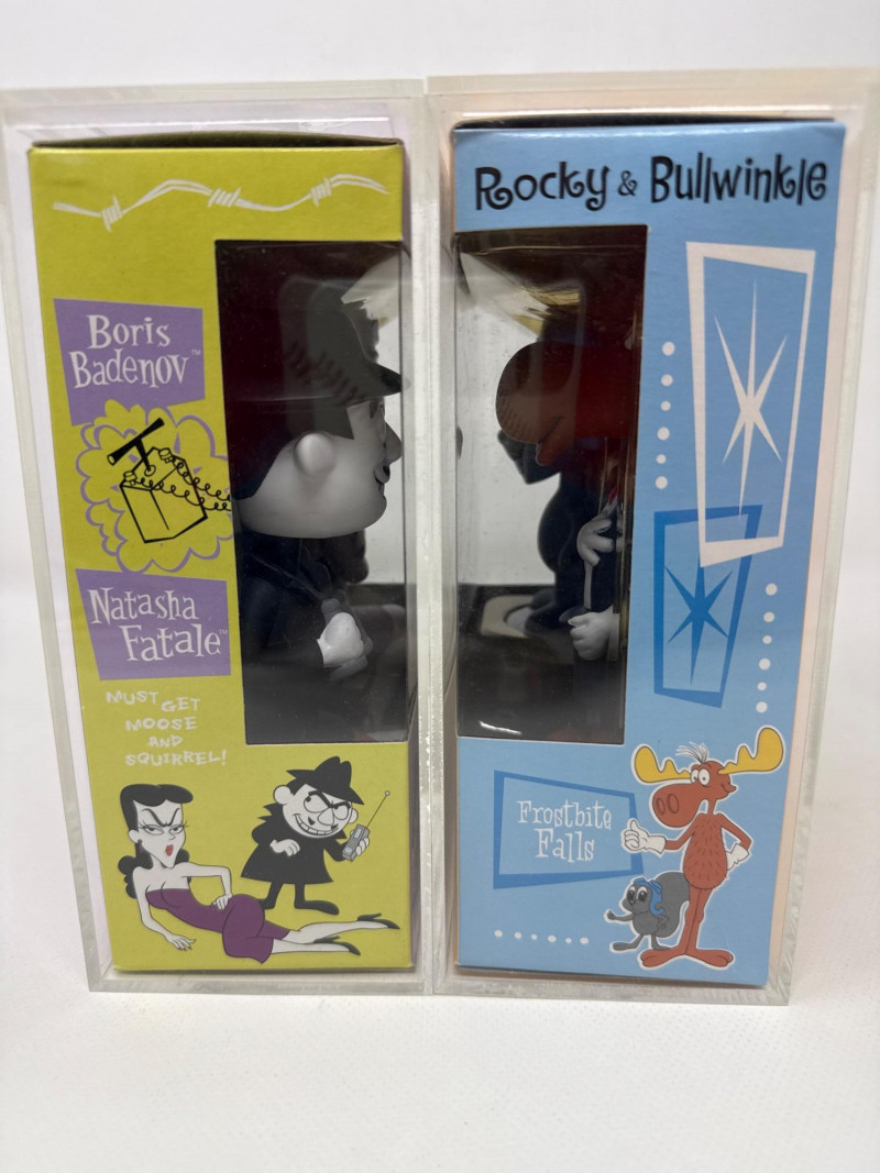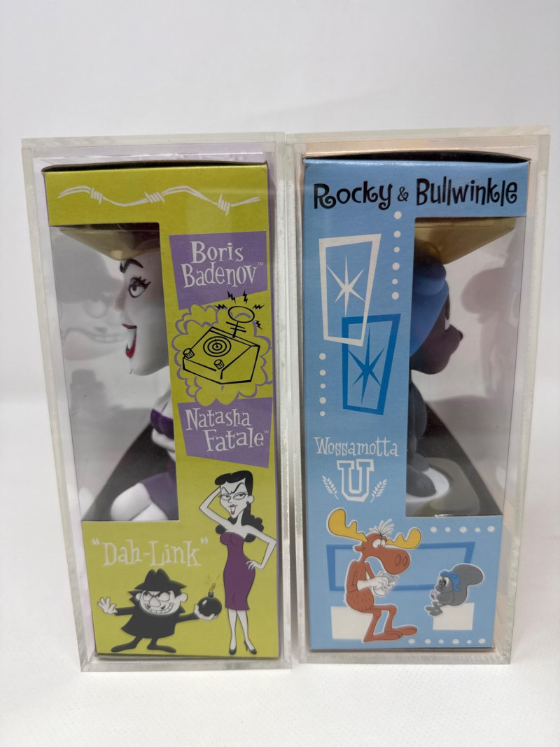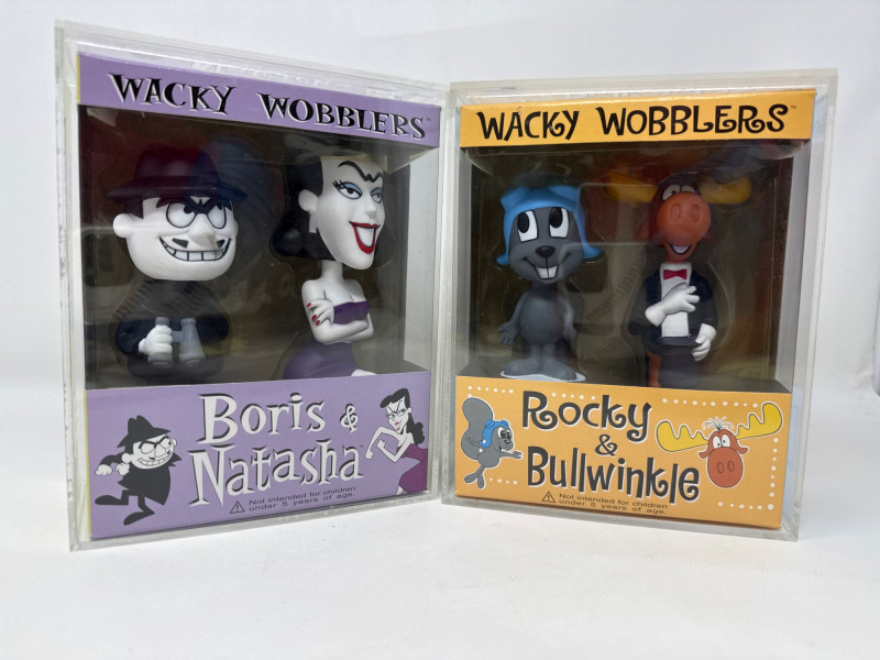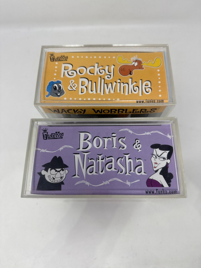 Funko Wacky Wobblers bobblehead set featuring characters from the classic Rocky & Bullwinkle series, including Rocky, Bullwinkle, Boris, and Natasha. Both sets are enclosed in protective display cases and present very nicely. A fun collectible featuring iconic cartoon villains and heroes. Figures and boxes are in good overall condition.