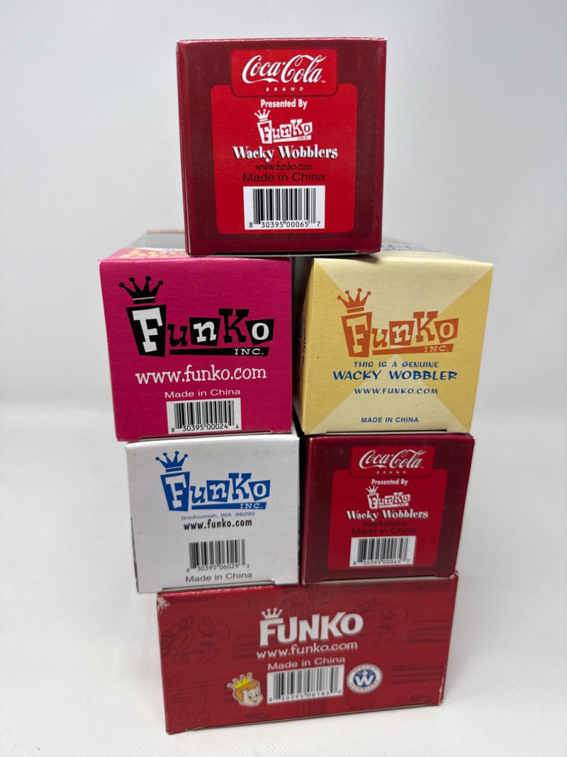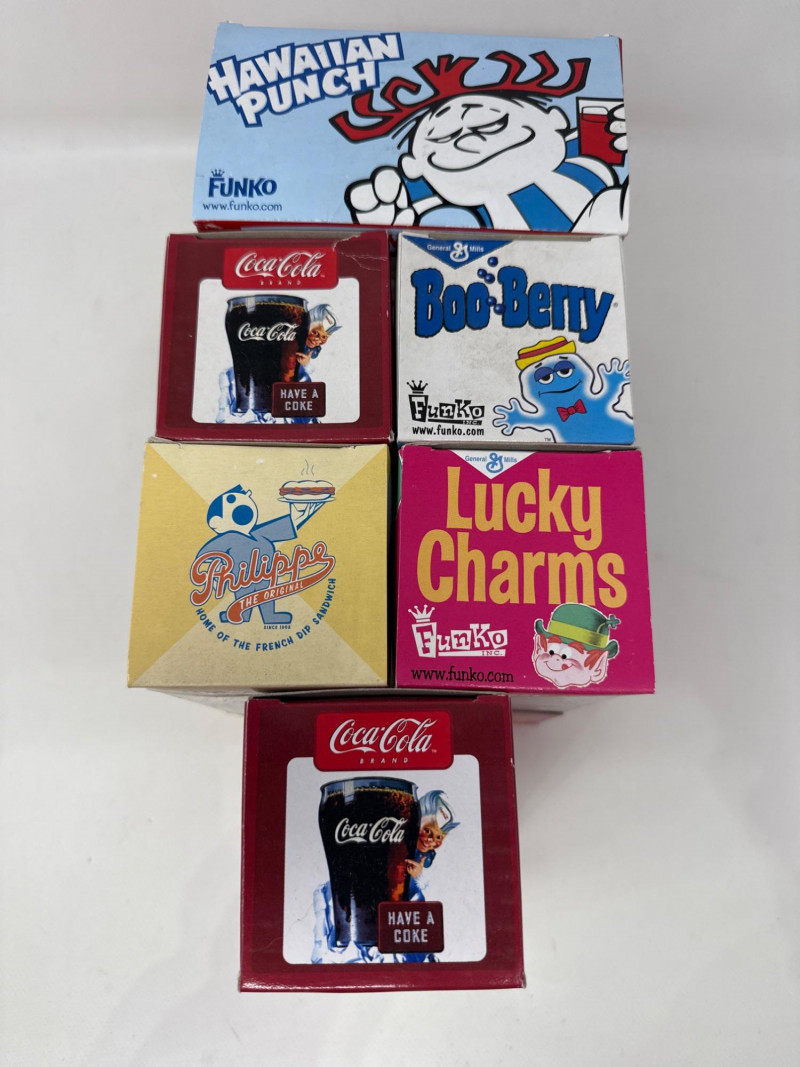 Six vintage characters, NIB. Coca-Cola has duplicate. Lucky charms, Philippe, Coca-Cola, Boo Berry, Large Hawaiian punch. All in great condition. Funko brand