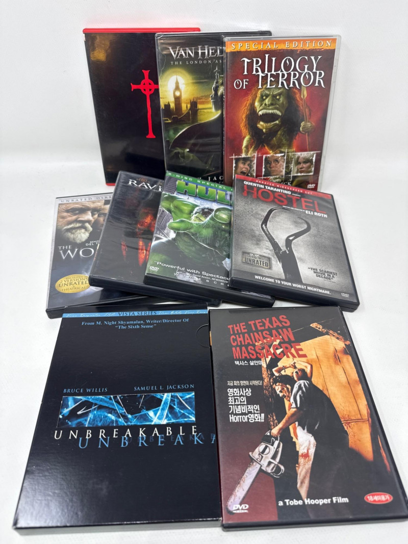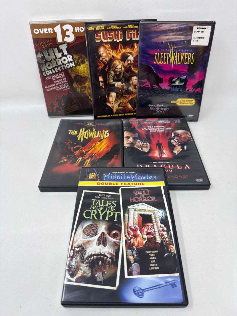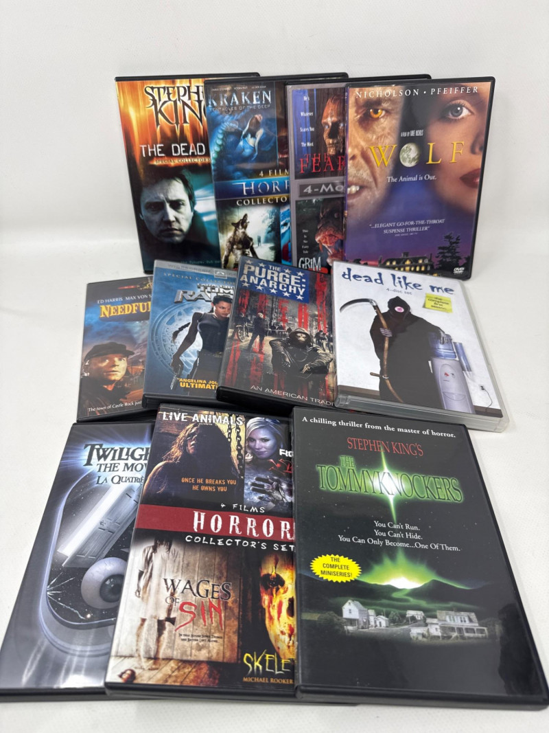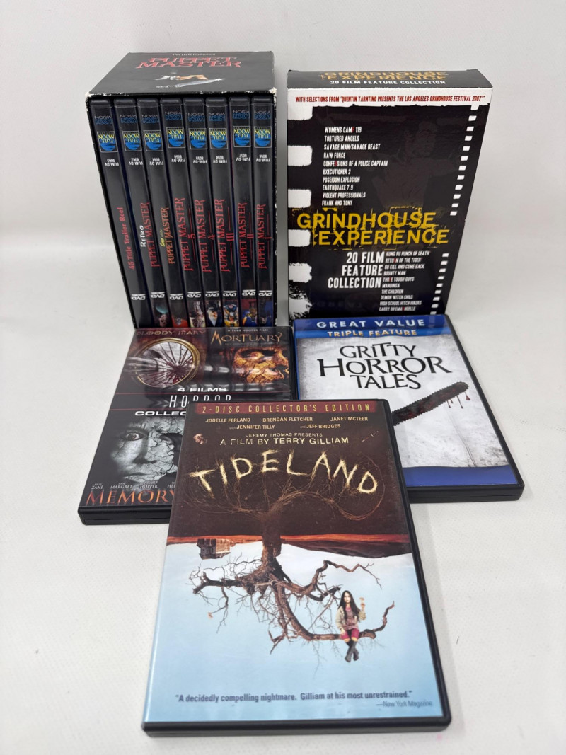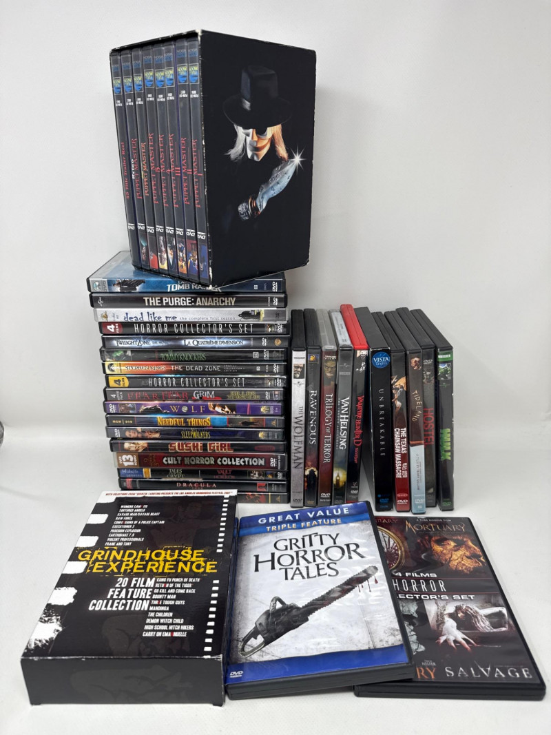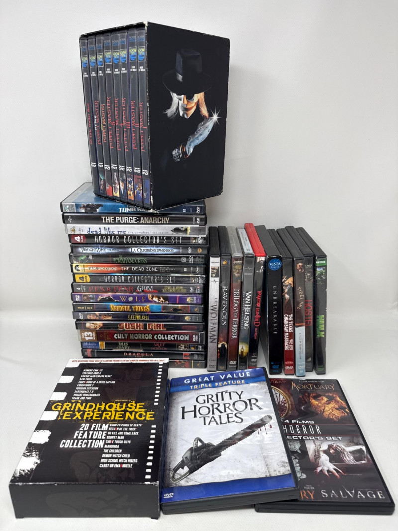 Puppet master box set. Includes eight DVDs. Box set grind House experience 20 film feature collection. Cult and recent films. Twilight zone, Stephen King, cult, horror collection with 13 movies. The Hulk, Texas Chainsaw Massacre, Wolfman, Purge, Hostile and more see pics for inventory. Four disc set complete first season of Dead Like Me. See pics for inventory. Large collection