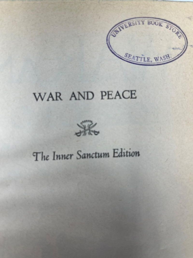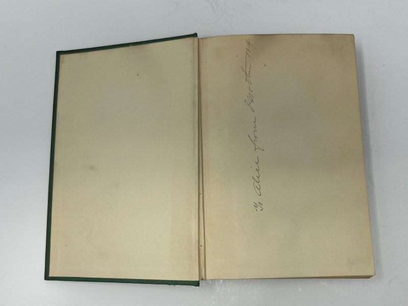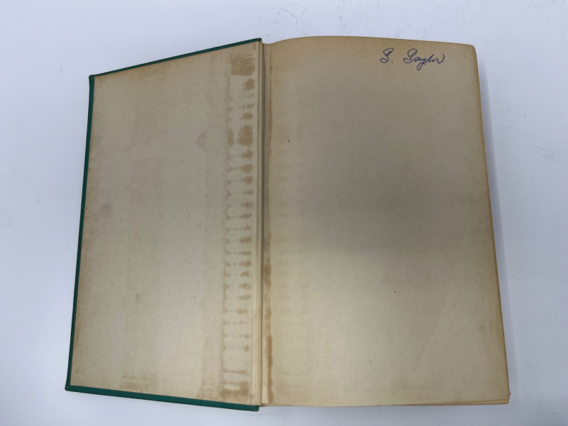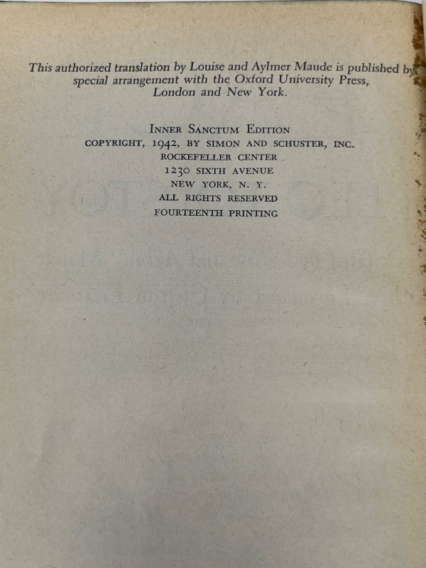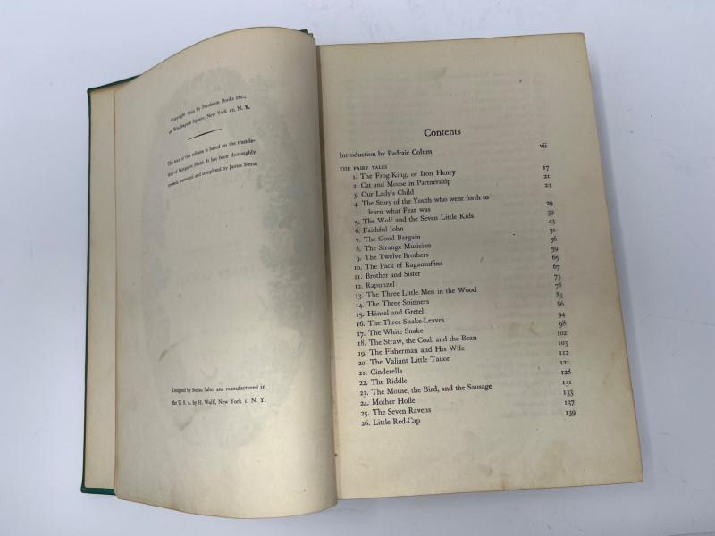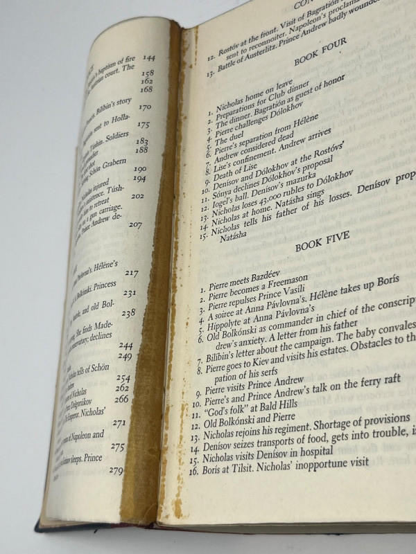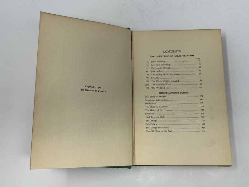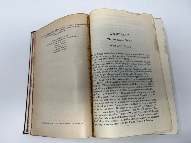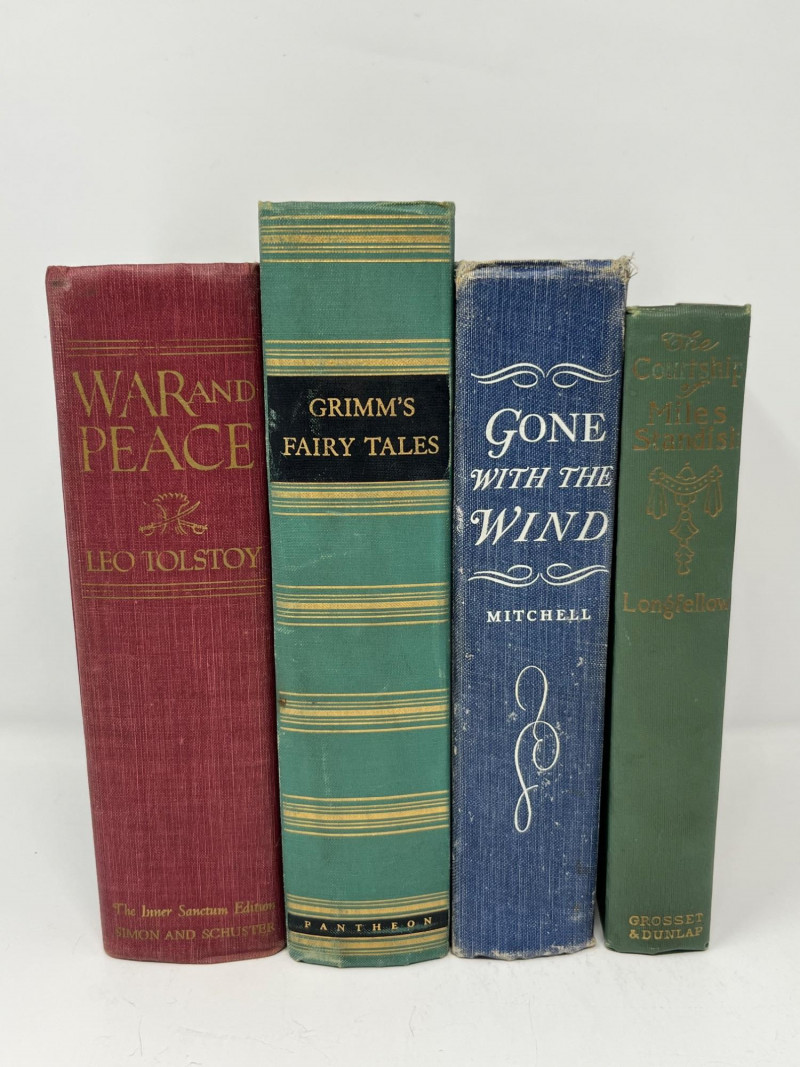 Group of four vintage to antique‑age literary volumes, spanning classic fiction, folklore, and American poetry. Includes early to mid‑20th‑century editions with period cloth bindings, decorative covers, inscriptions, and publisher marks. A cohesive shelf display with strong traditional library appeal. War and Peace by Leo Tolstoy – Inner Sanctum Edition, 14th printing, 1942. Based on the Constance Garnett translation, revised by Joseph Schrank. Visible staining along the page edges near the spine; see photos. Grimm’s Fairy Tales – 1944 copyright edition in green cloth with gilt titling. Gone With the Wind by Margaret Mitchell – 1954 Garden City Books reprint edition in blue cloth. The Courtship of Miles Standish by Henry Wadsworth Longfellow – 1910 Grosset & Dunlap edition with illustrated cover. Mixed lot of four classic works in period bindings Publication dates ranging from 1910 to 1954 Some volumes include inscriptions, bookshop stamps, or bookplates Expected age wear across the group: rubbing, toning, and handling marks War & Peace shows staining along the spine‑side page edges Strong decorative value for shelf styling or reading collections Good overall vintage condition with typical age‑related wear. Cloth rubbing, edge toning, and scattered marks present across the group. War & Peace has notable staining along the inner page edges near the spine. Please review all photos for details.Included Titles
