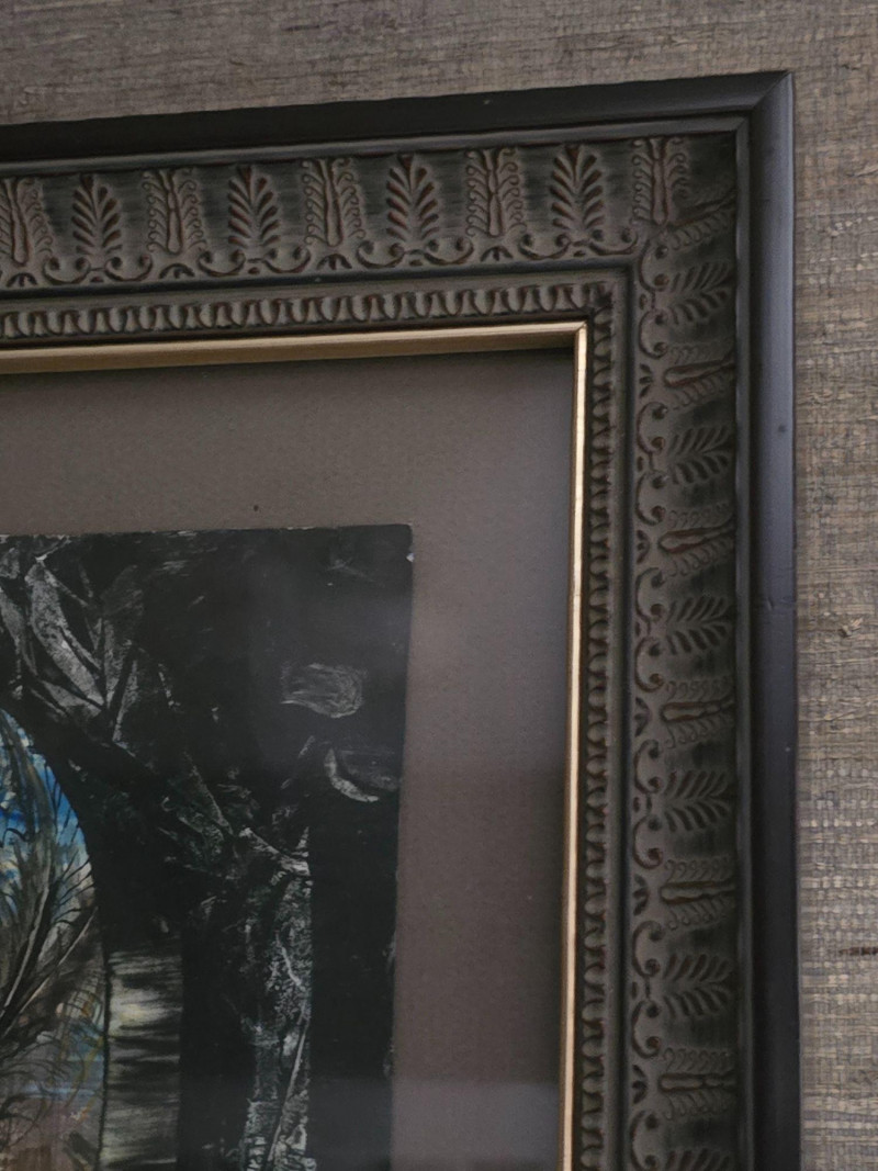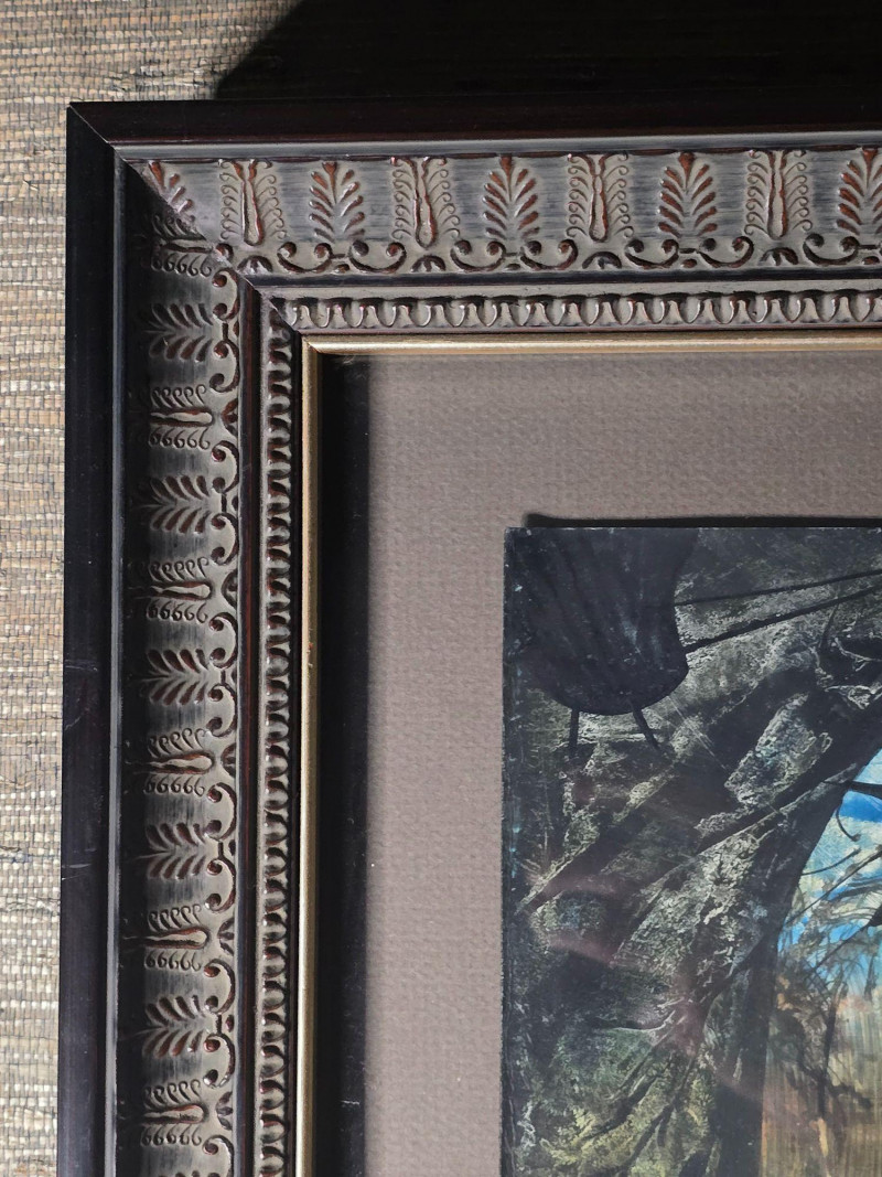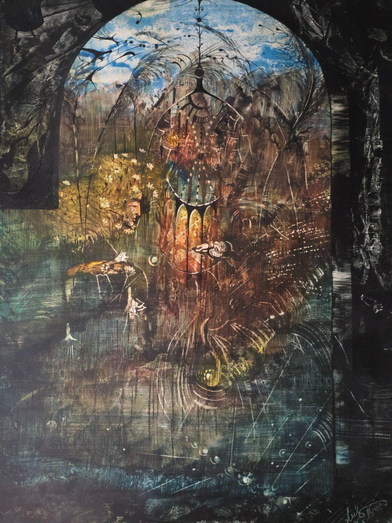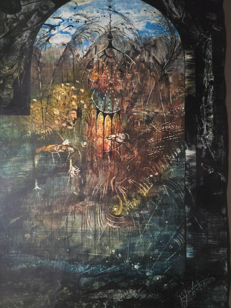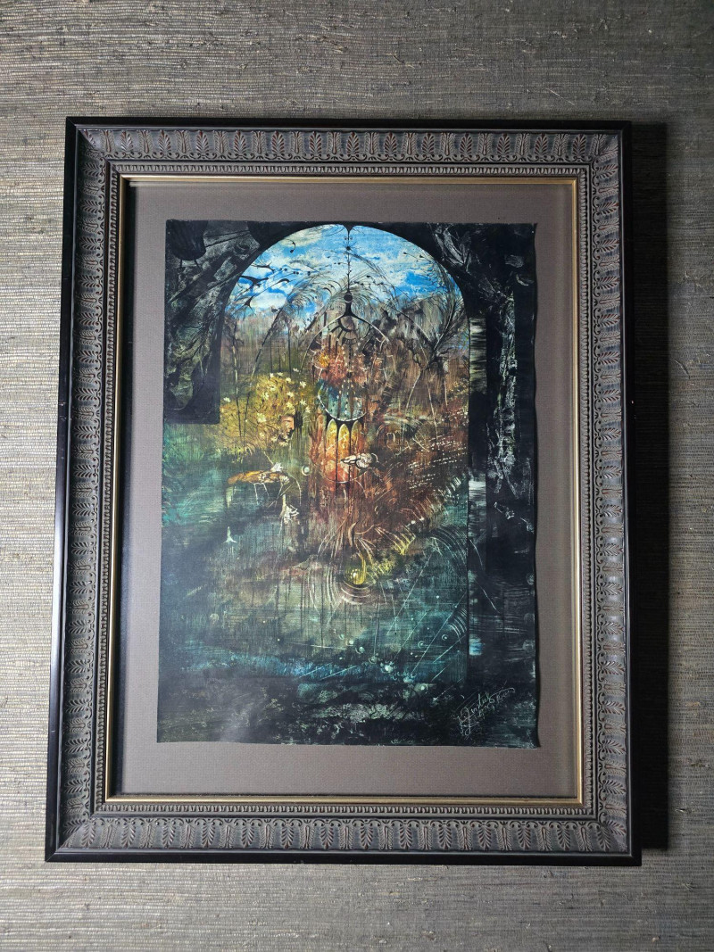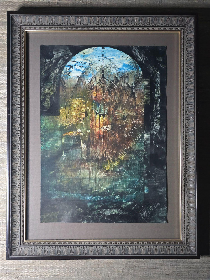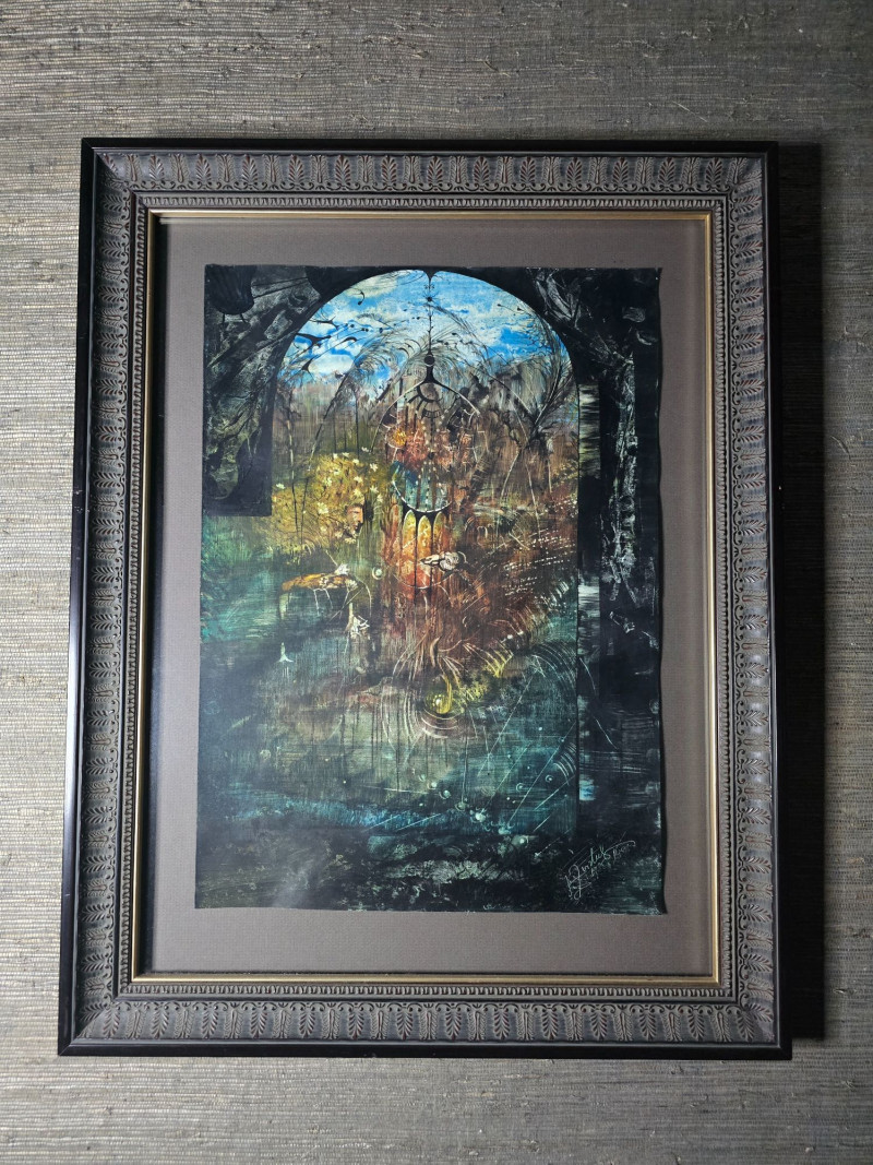 Signed and dated in the lower corner, this original surrealist composition by Juris Zvirbulis showcases the artist’s distinctive blend of architectural fantasy, organic forms, and dreamlike spatial depth. The central arched structure, layered textures, and atmospheric palette create a sense of narrative mystery characteristic of Zvirbulis’ work. The piece is presented in an ornate carved frame that complements its dramatic, otherworldly tone. Artist Bio — Juris Zvirbulis (Latvia)