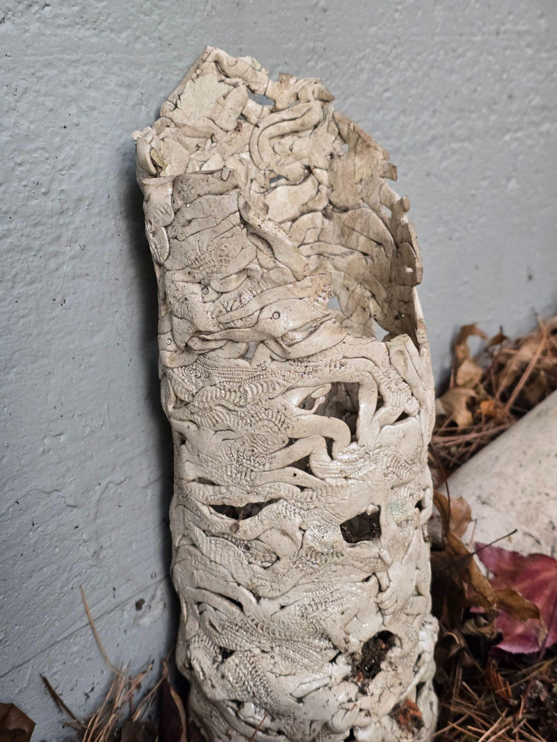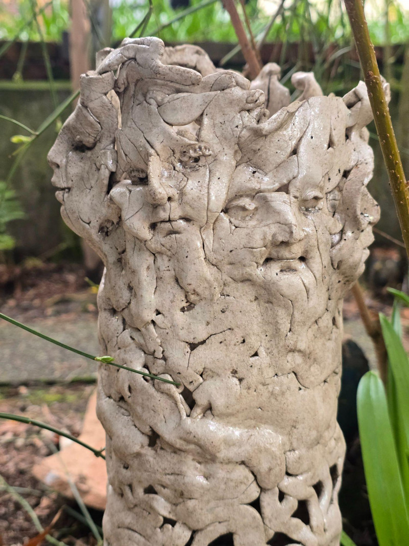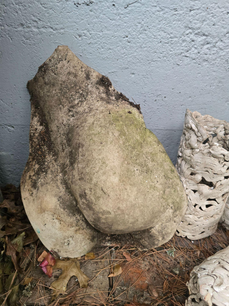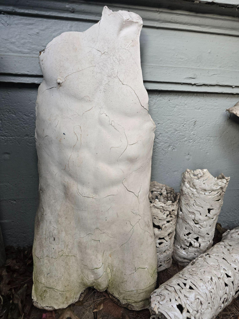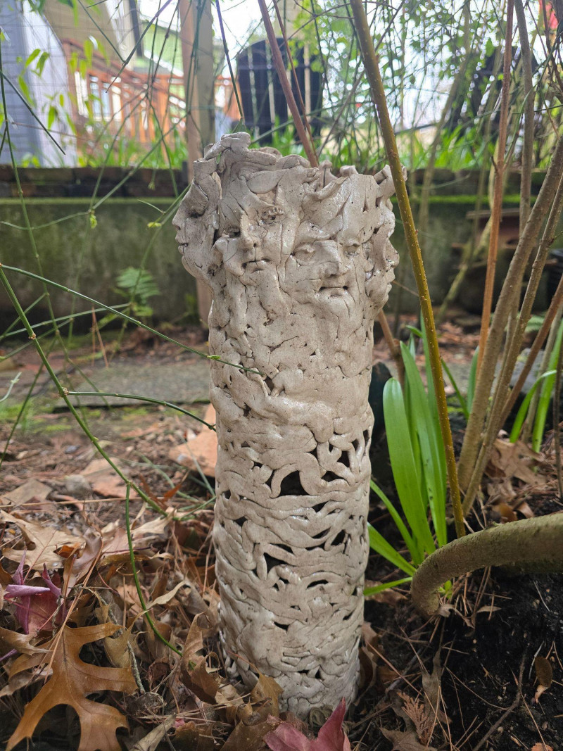 Offered here is a rare, mixed grouping of outdoor ceramic sculptures by Pacific Northwest artist Gerald Gedekes. This collection includes several tall, vase‑like sculptural forms featuring abstract imagery, stylized faces, and expressive surface treatments, along with additional figurative pieces representing male anatomy. All works are hand‑built ceramic forms created by the artist and were displayed outdoors; surfaces show typical weathering, patina, and wear consistent with long‑term exterior placement. This is an uncommon opportunity to acquire a substantial grouping of Gedekes’ sculptural work, reflecting both his abstract visual language and his exploration of the human form. Gerald Gedekes is a Washington‑based mixed‑media artist and studio potter active throughout the late 20th century. Known for his expressive ceramic forms, textured surfaces, and bold sculptural silhouettes, Gedekes produced both functional pottery and large‑scale sculptural works. His pieces often incorporate abstracted faces, symbolic motifs, and organic forms, reflecting the broader Pacific Northwest studio‑craft movement of his era. Gedekes’ work appears in private collections across the region and remains appreciated for its distinctive handmade character and artistic range.Artist Biography