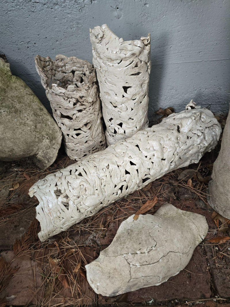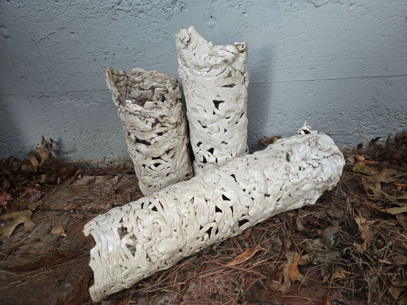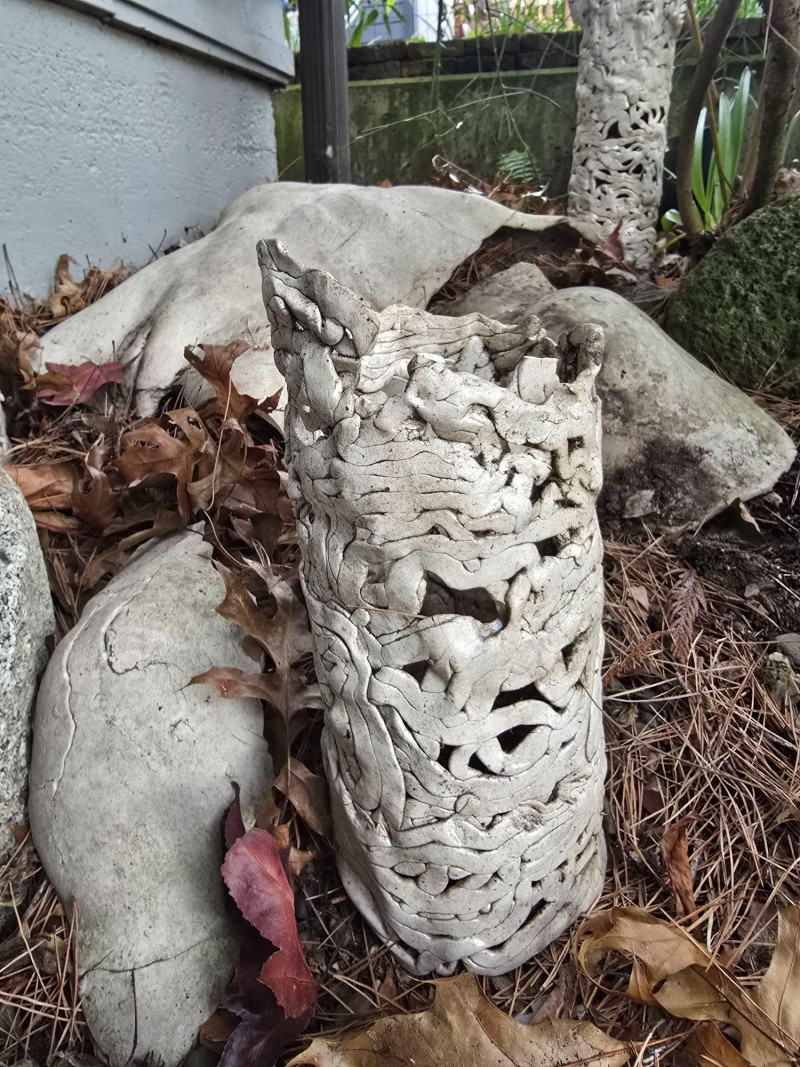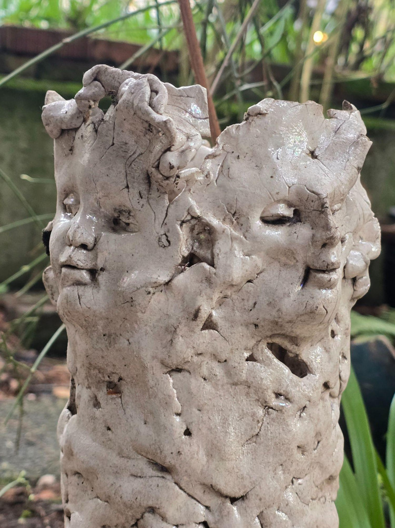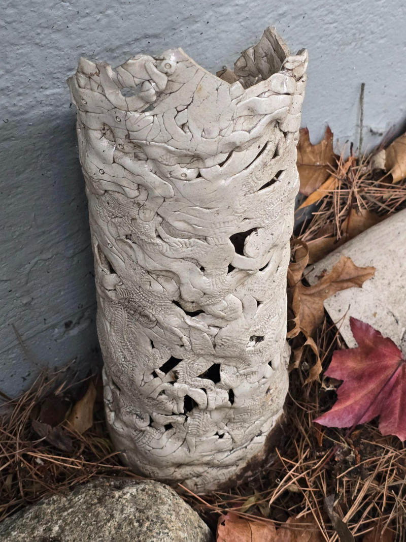 Offered here is a rare, mixed grouping of outdoor ceramic sculptures by Pacific Northwest artist Gerald Gedekes. This collection includes several tall, vase‑like sculptural forms featuring abstract imagery, stylized faces, and expressive surface treatments, along with additional figurative pieces representing male anatomy. All works are hand‑built ceramic forms created by the artist and were displayed outdoors; surfaces show typical weathering, patina, and wear consistent with long‑term exterior placement. This is an uncommon opportunity to acquire a substantial grouping of Gedekes’ sculptural work, reflecting both his abstract visual language and his exploration of the human form. Gerald Gedekes is a Washington‑based mixed‑media artist and studio potter active throughout the late 20th century. Known for his expressive ceramic forms, textured surfaces, and bold sculptural silhouettes, Gedekes produced both functional pottery and large‑scale sculptural works. His pieces often incorporate abstracted faces, symbolic motifs, and organic forms, reflecting the broader Pacific Northwest studio‑craft movement of his era. Gedekes’ work appears in private collections across the region and remains appreciated for its distinctive handmade character and artistic range.Artist Biography