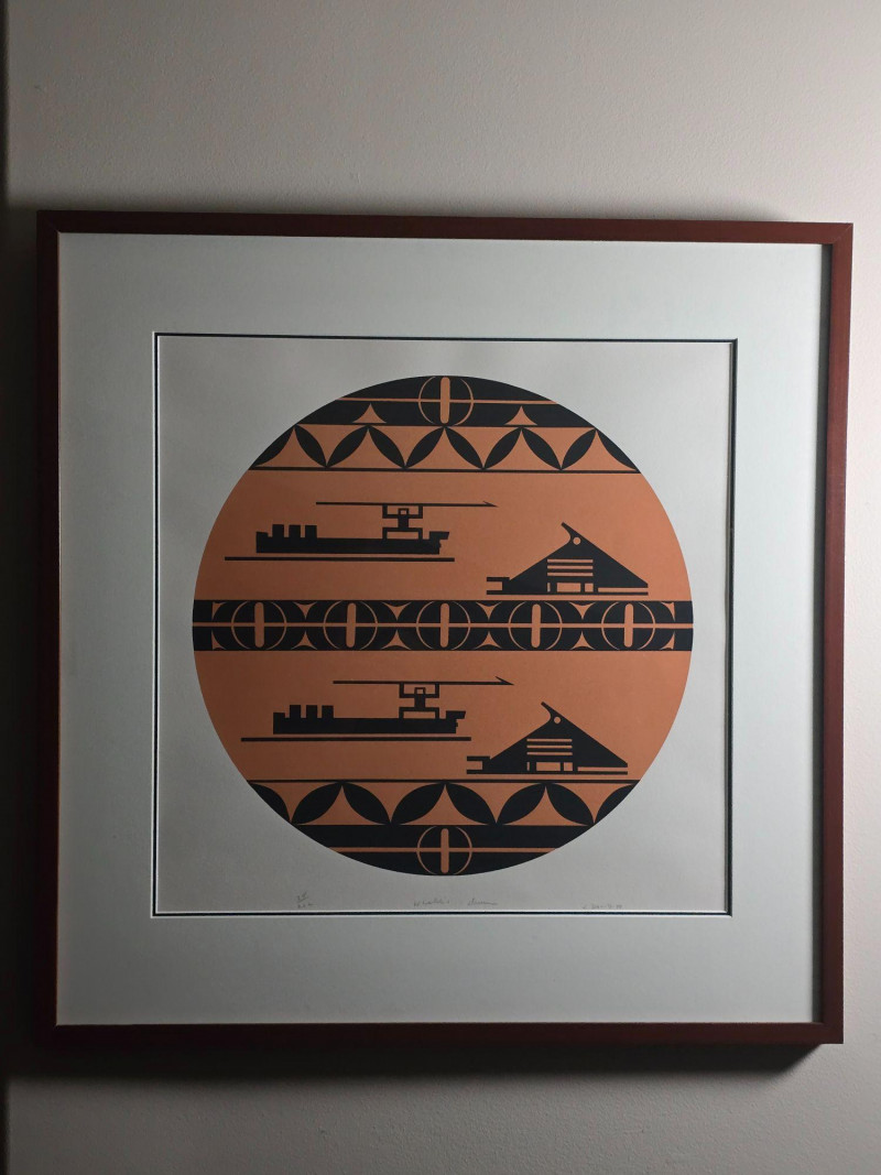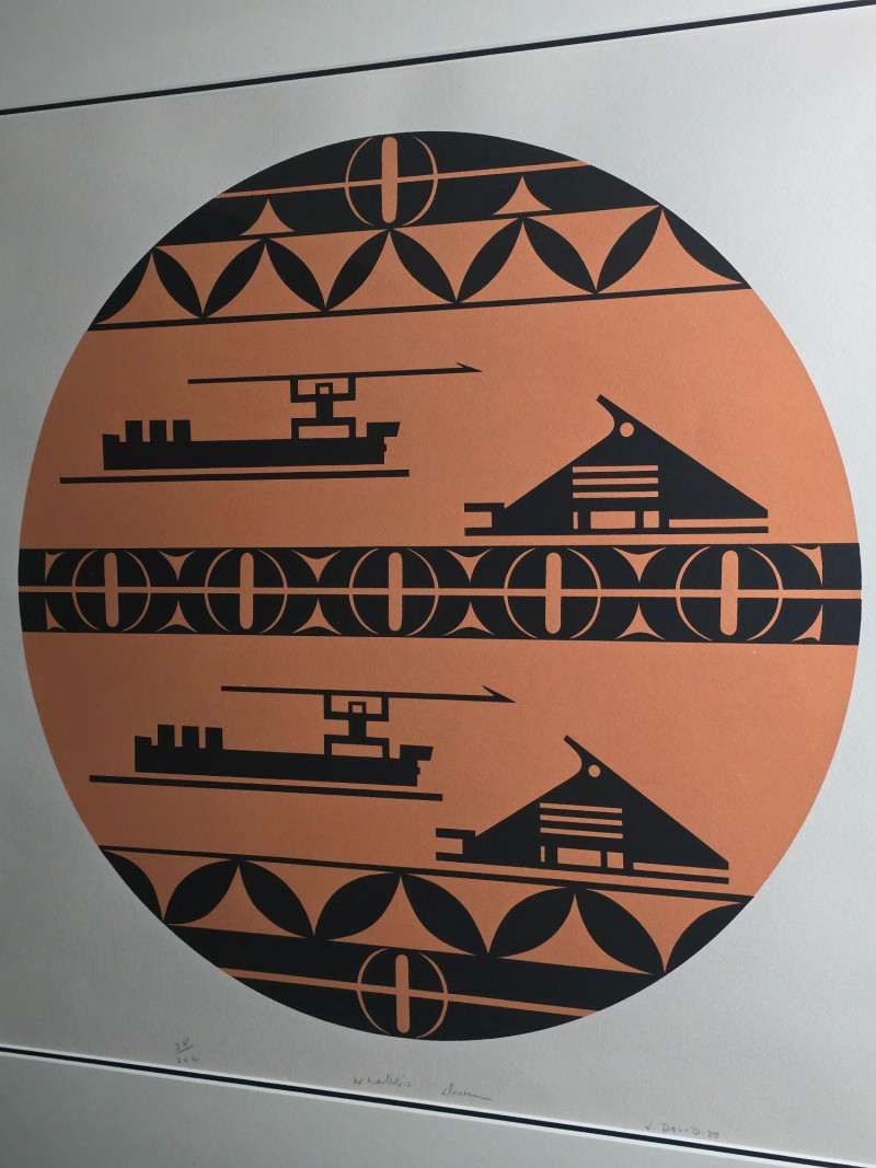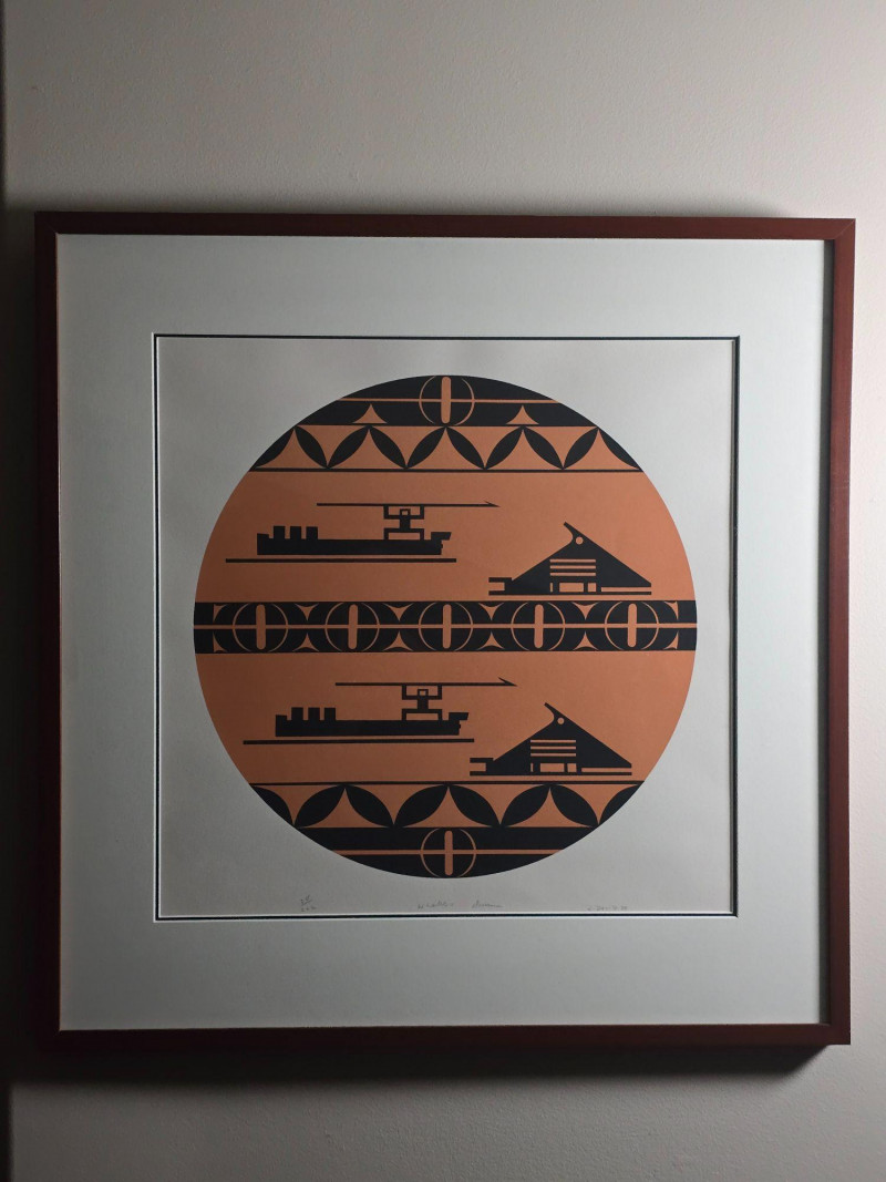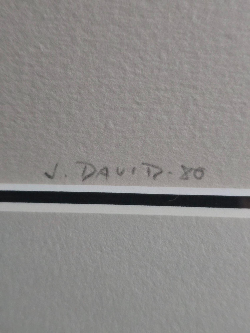 J. David is known for graphic, architectural, and symbol‑driven compositions that blend structural forms with stylized pattern work. His pieces from this era often explore balance, symmetry, and cultural motifs through simplified linework and strong color contrast. Works from the early 1980s are especially sought after for their distinctive design language and limited production runs. Details