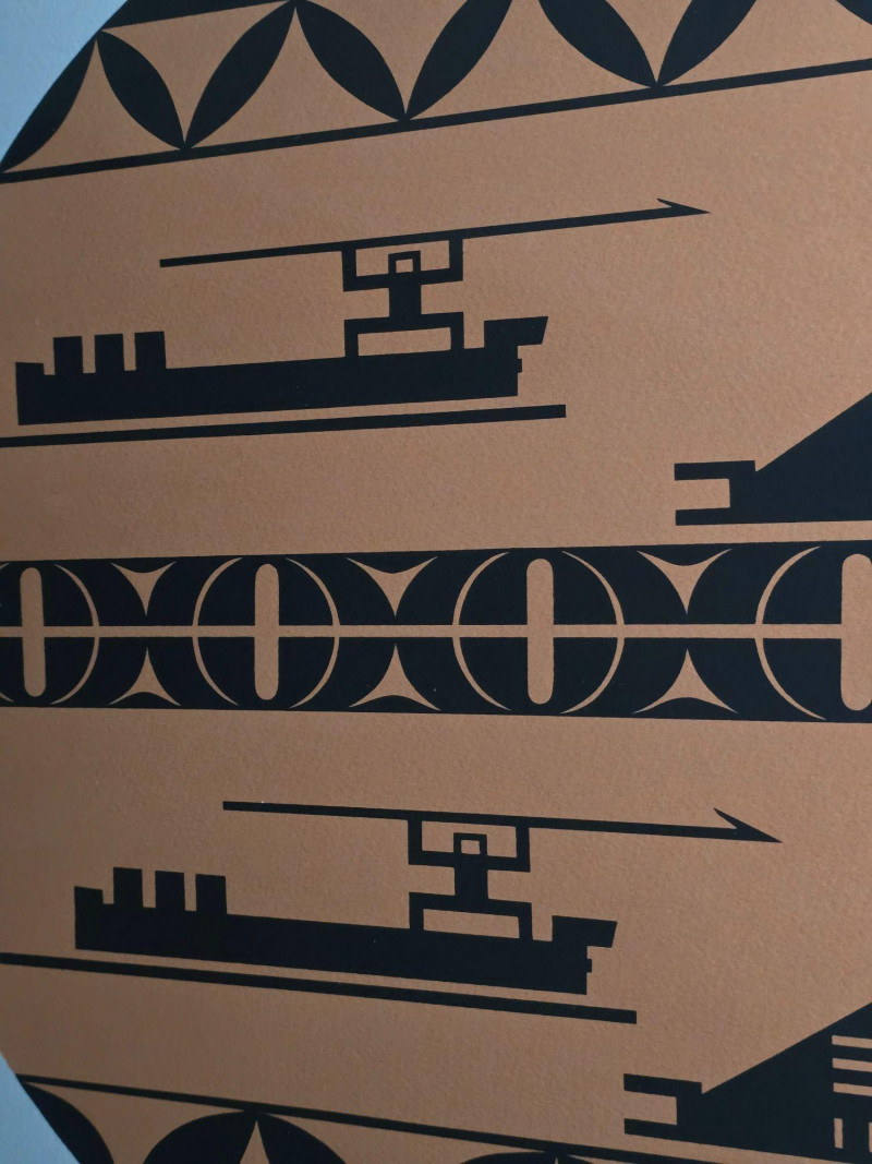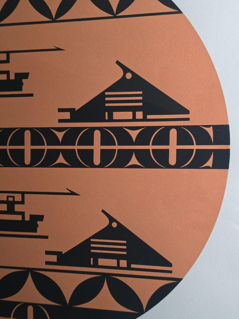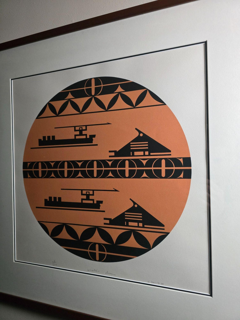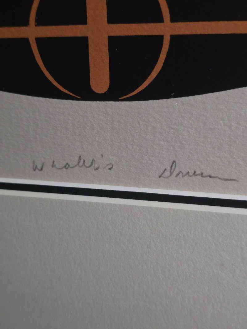 J. David is known for graphic, architectural, and symbol‑driven compositions that blend structural forms with stylized pattern work. His pieces from this era often explore balance, symmetry, and cultural motifs through simplified linework and strong color contrast. Works from the early 1980s are especially sought after for their distinctive design language and limited production runs. Details