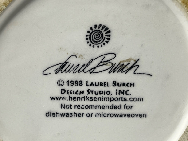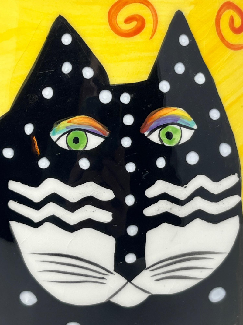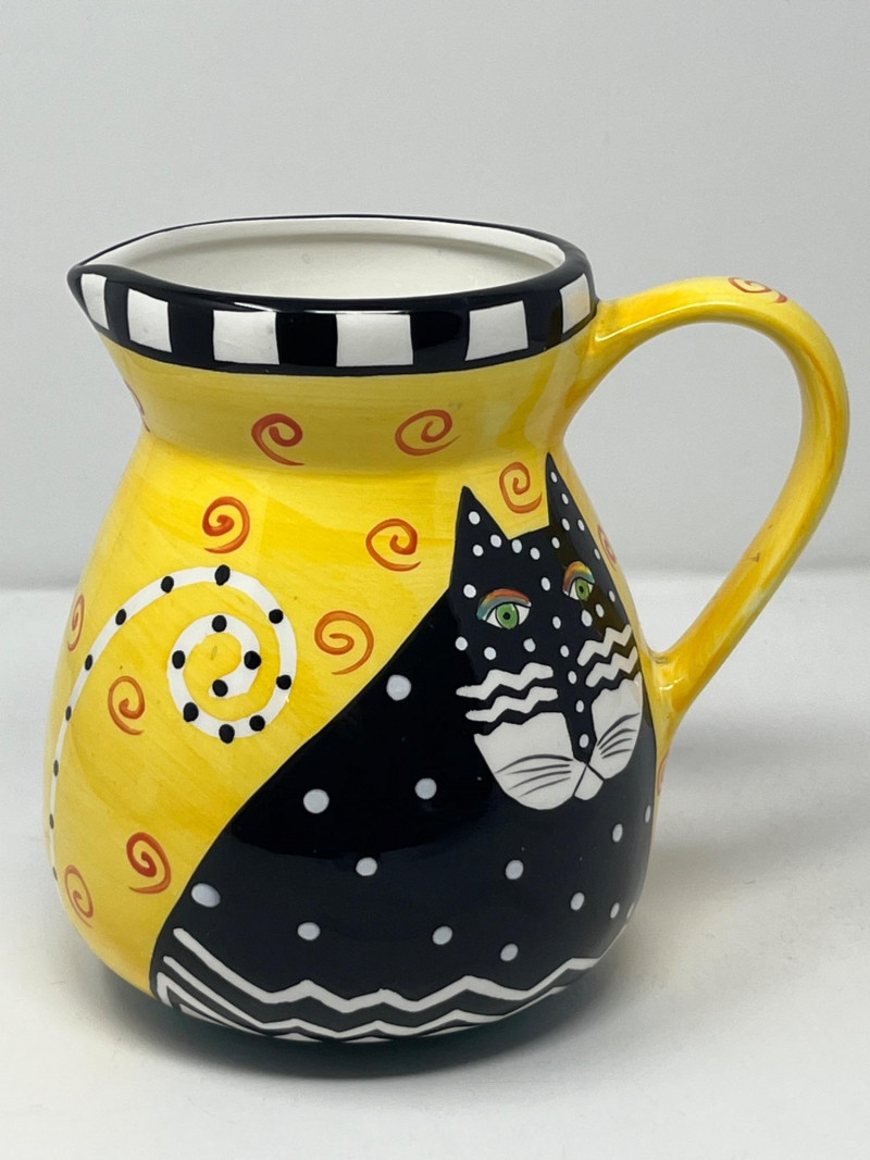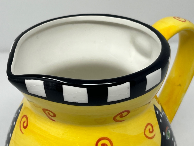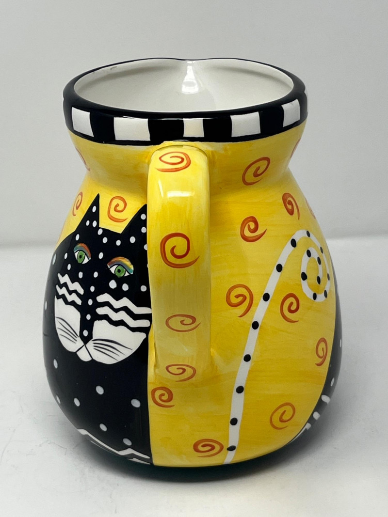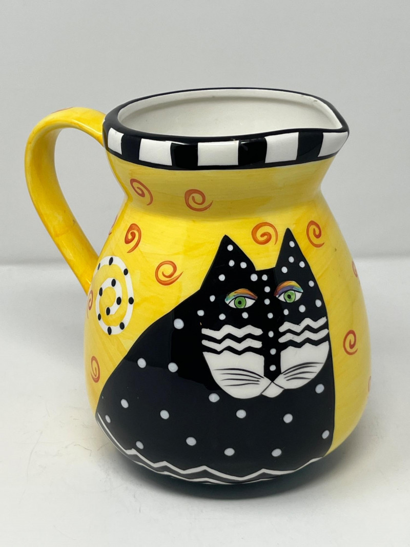 Whimsical ceramic pitcher designed by Laurel Burch, featuring her signature stylized cat motifs in bold yellow, black, white, and orange. The piece includes a black‑and‑white checkered rim, swirling decorative patterns, and expressive cat imagery characteristic of Burch’s late‑1990s design work. Marked on the base: Laurel Burch ©1998 Laurel Burch Design Studio, Inc. with original importer information. Not recommended for dishwasher or microwave use. Surface shows light general wear consistent with age and handling. No cracks observed. A bright, collectible decorative piece for fans of Laurel Burch artwork and colorful contemporary ceramics.