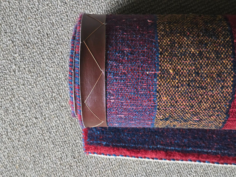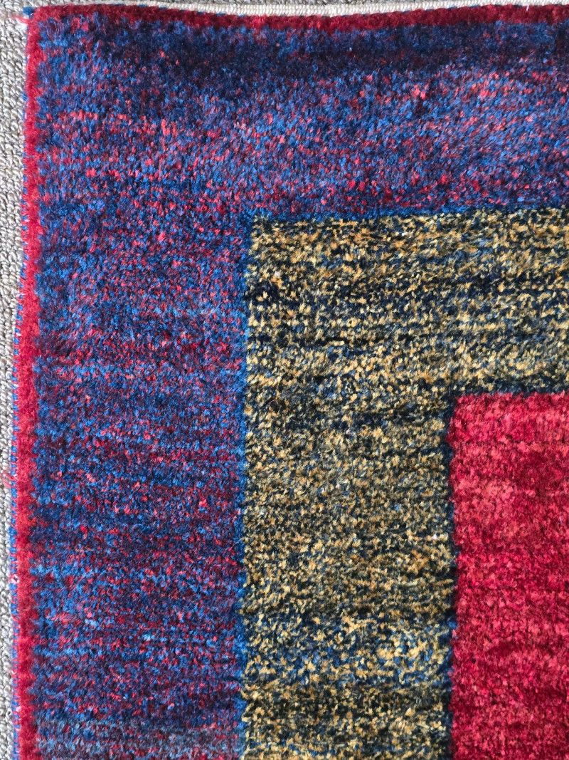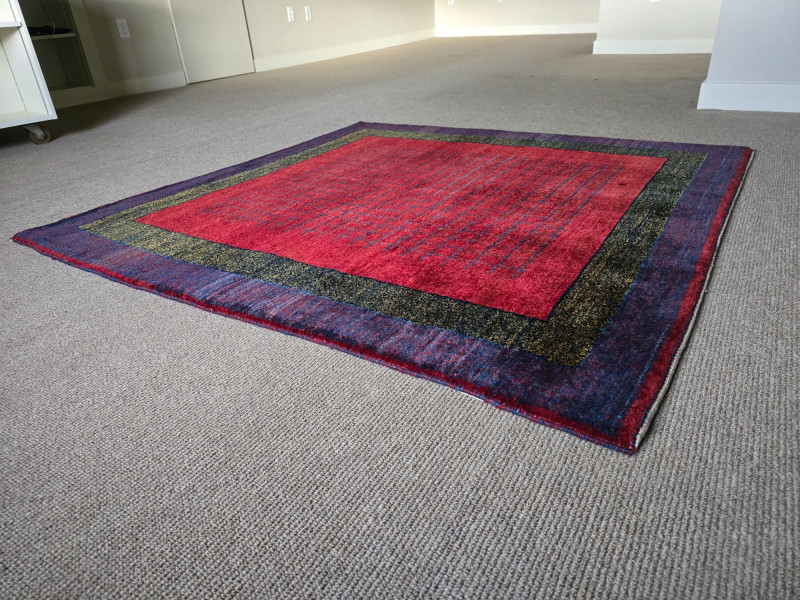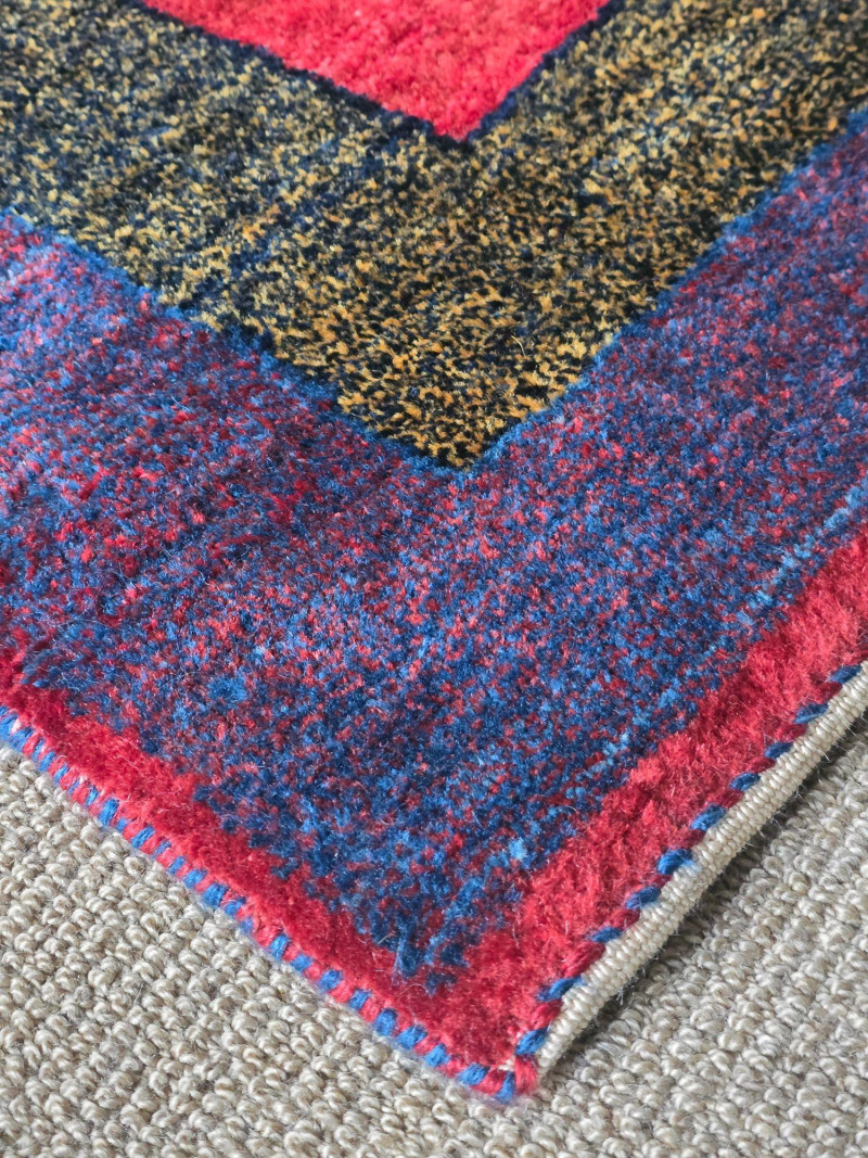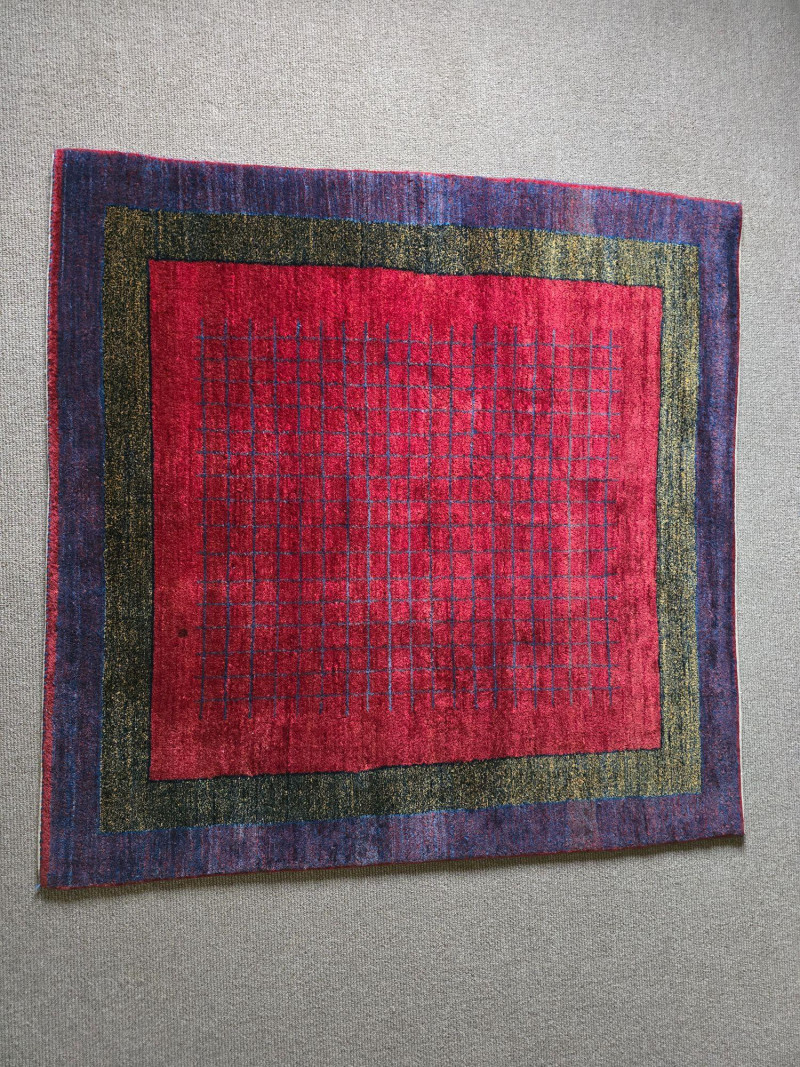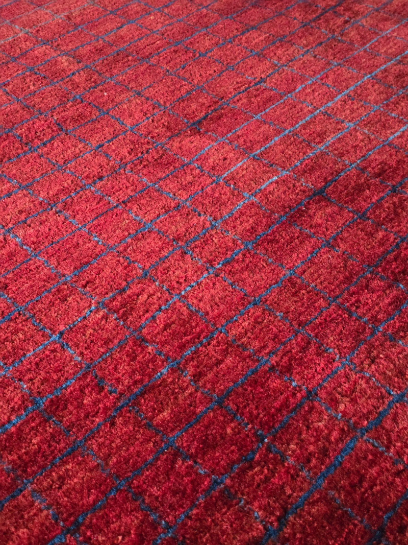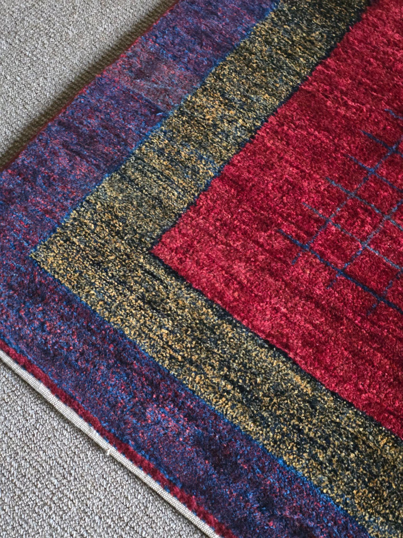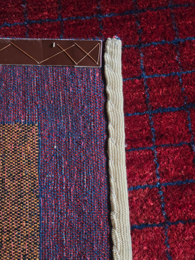 A hand‑knotted wool rug featuring a striking red field overlaid with a subtle blue line grid and framed by a gold and purple decorative border. The palette and patterning create a bold yet balanced visual presence suitable for both traditional and contemporary interiors. The underside shows hand‑stitched leather strips at each end, a detail often used to reinforce and protect the edges of handwoven rugs. There are no identifying tags, maker marks, or country‑of‑origin indicators present. Overall condition is very good, with expected signs of gentle use consistent with age. A well‑crafted, visually engaging textile ready for use or display.