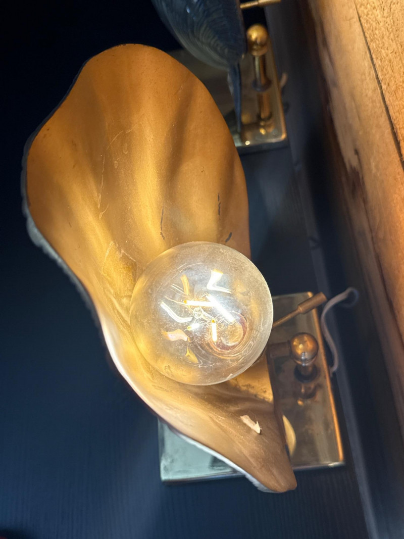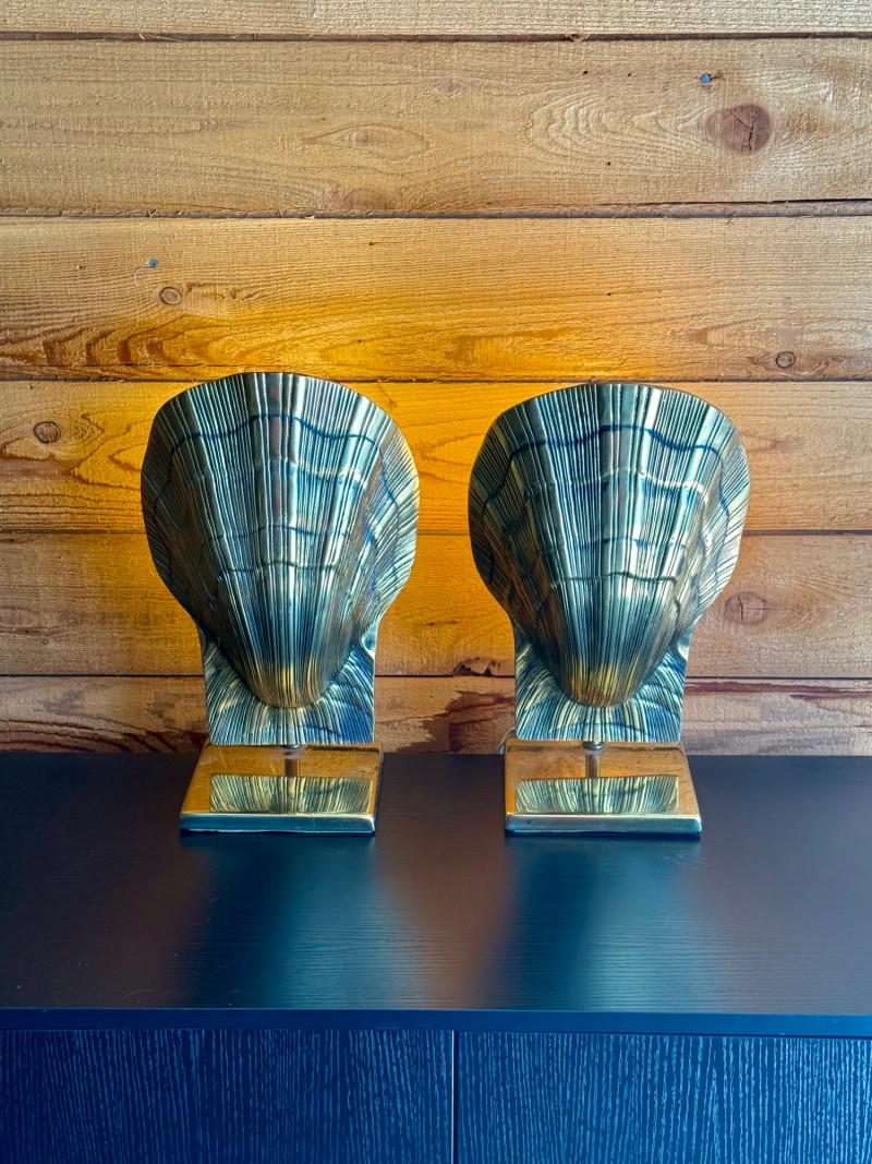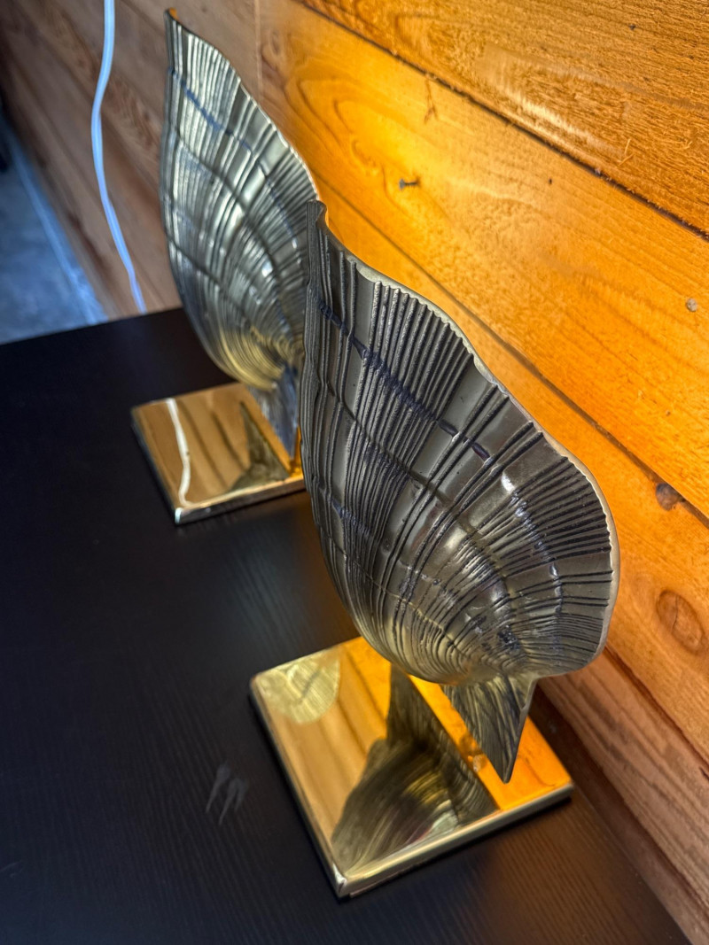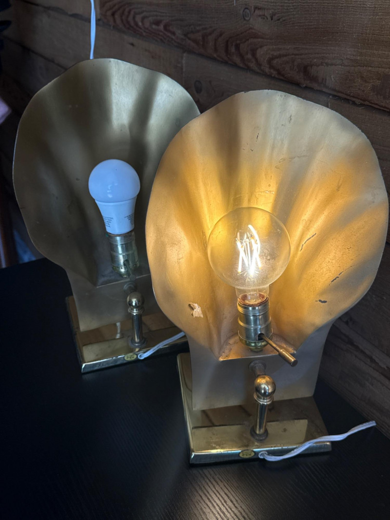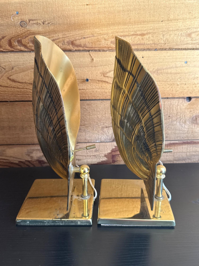 Vintage Brass Adjustable Shell Lamp Pair Online comps were showing same or similar for $600+ for pair. These gorgeous lamps would be perfect for table, mantel or accenting a bookcase. Minor brass pitting/marks due to age. Electric plug in. Both work. Adjustable side to side. Normal E26 light bulb socket fitting. Great vintage condition.