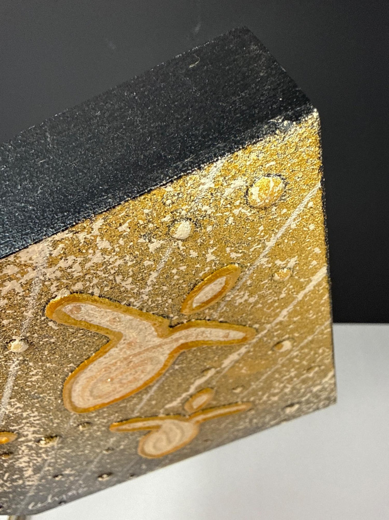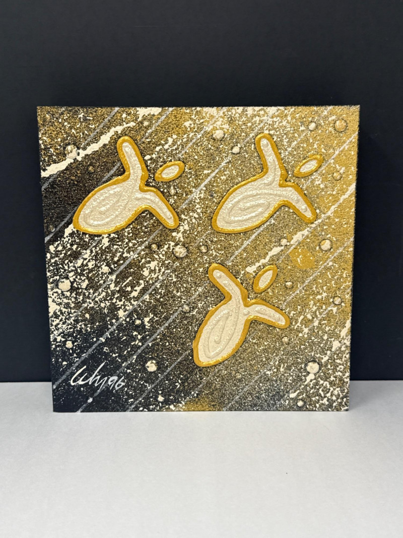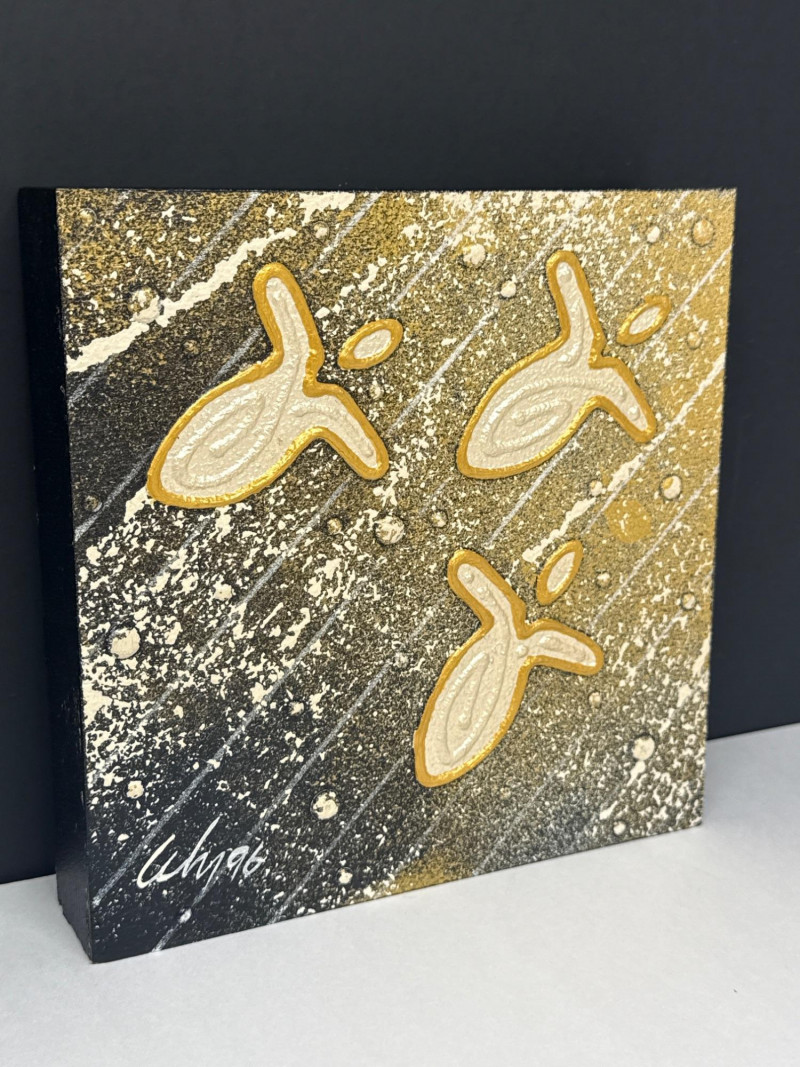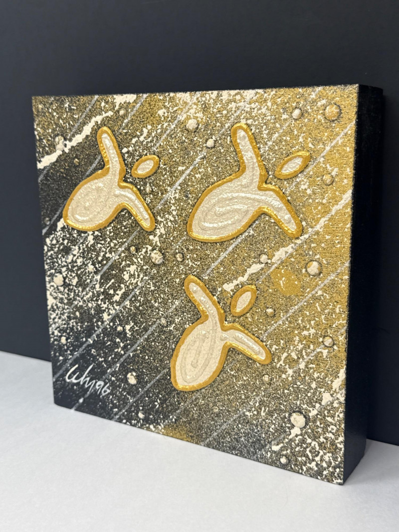 Measuring 7 x 7, the piece features soft metallic paints and soft lines.