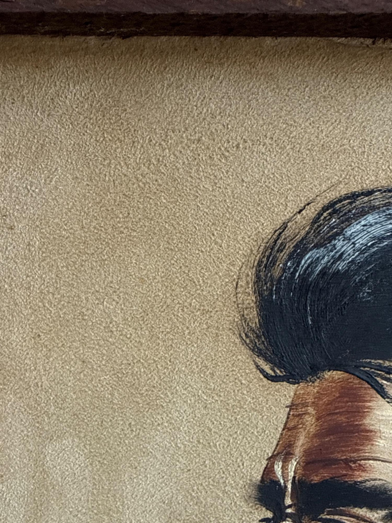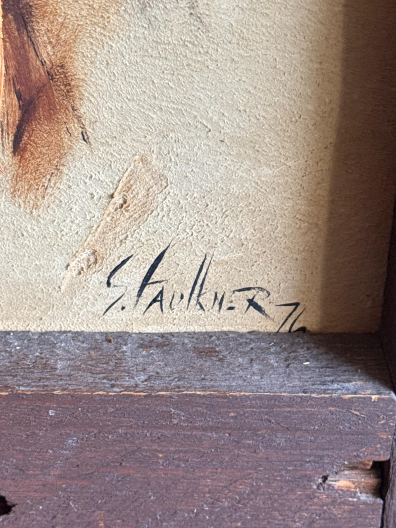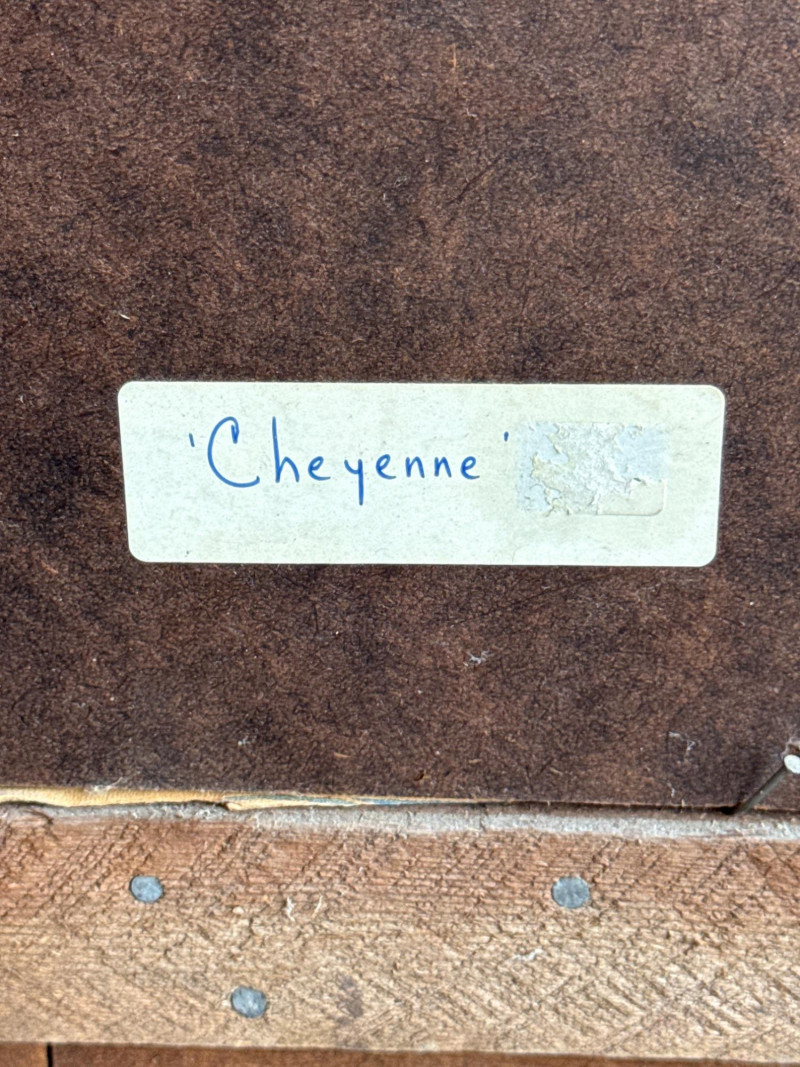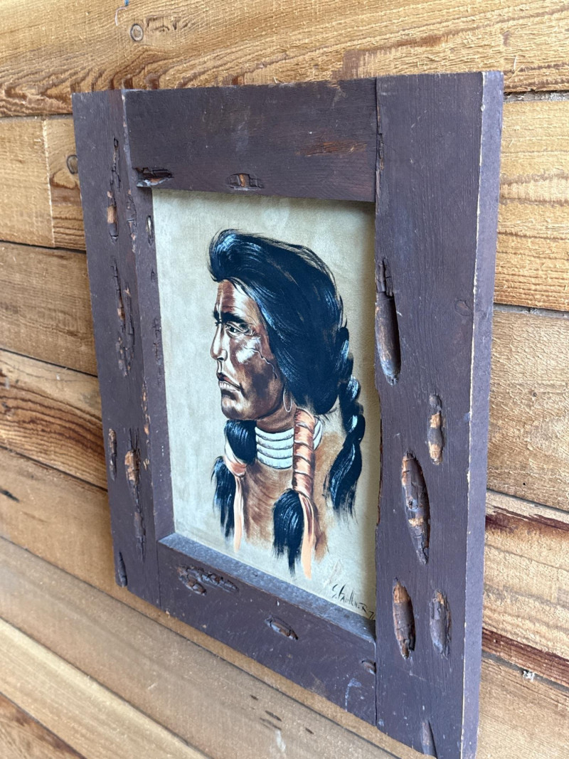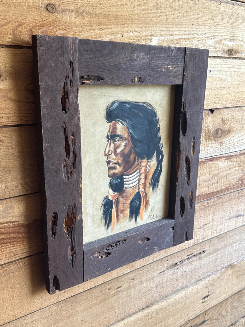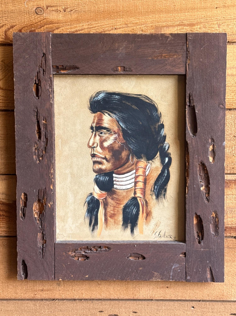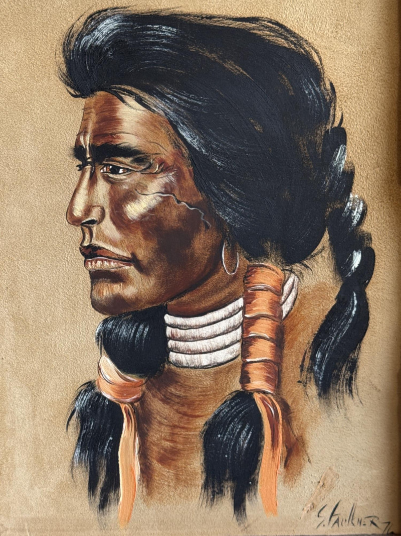 This piece, titled "Cheyenne," is a striking portrait of a Native American man created by the artist S. Faulkner in 1976. It is a unique mixed-media work, notably painted directly onto suede, which gives the piece a soft, organic texture that complements its subject matter. Framed in rustic wood.