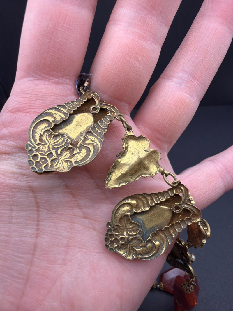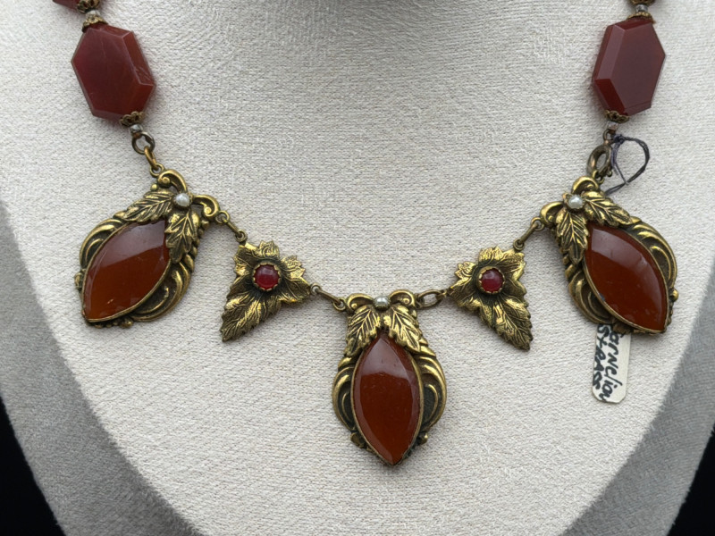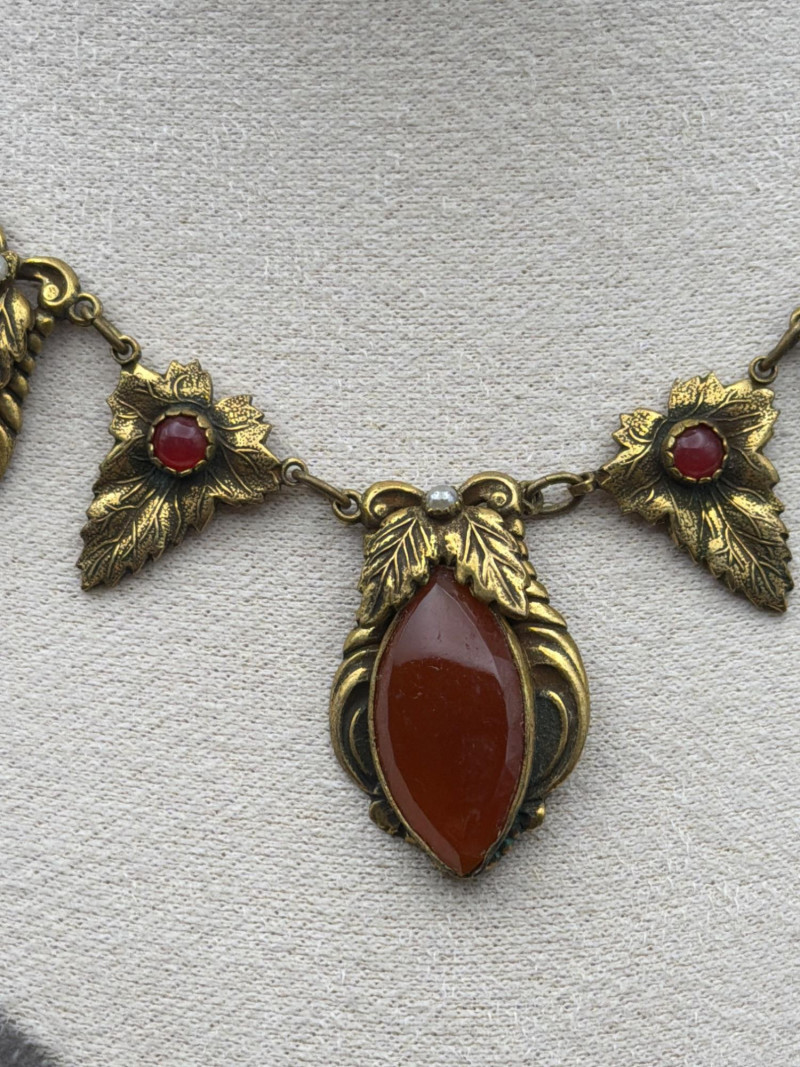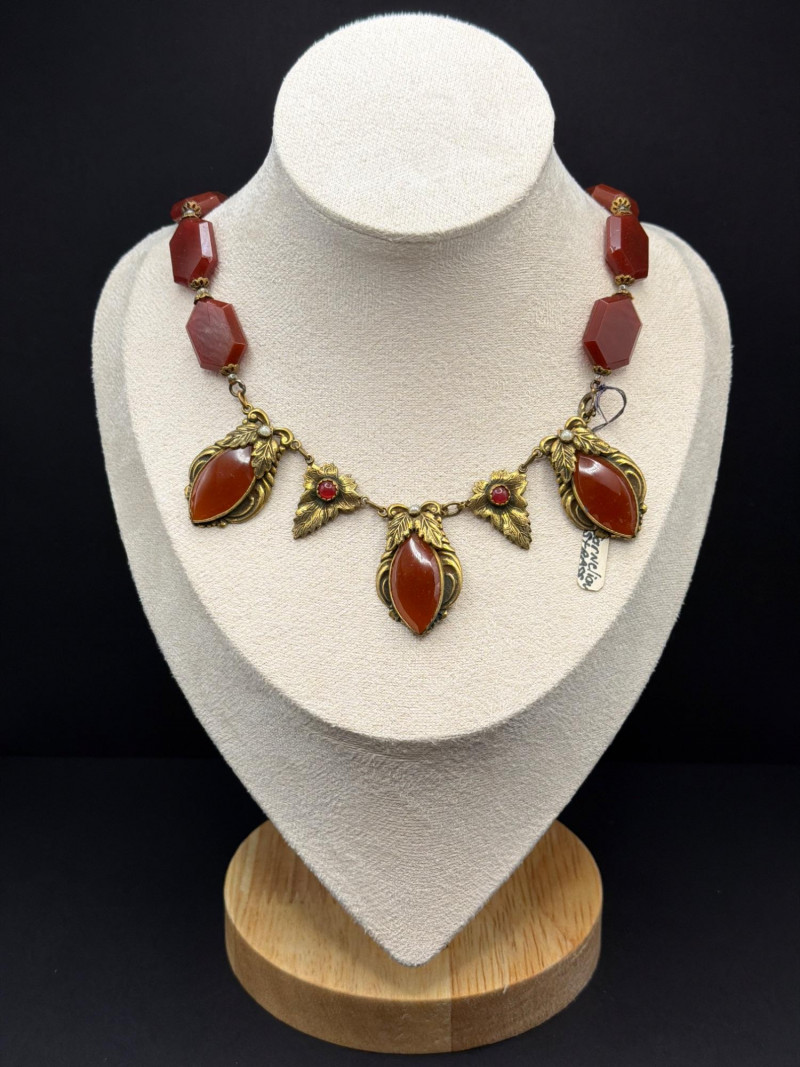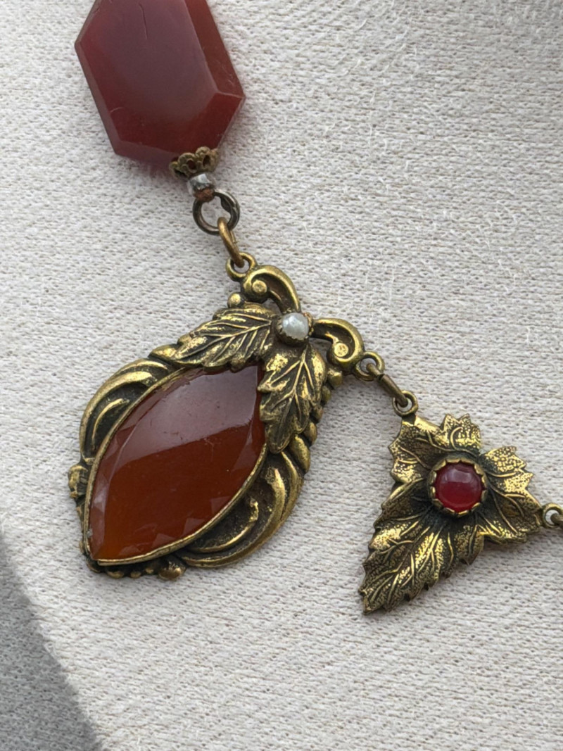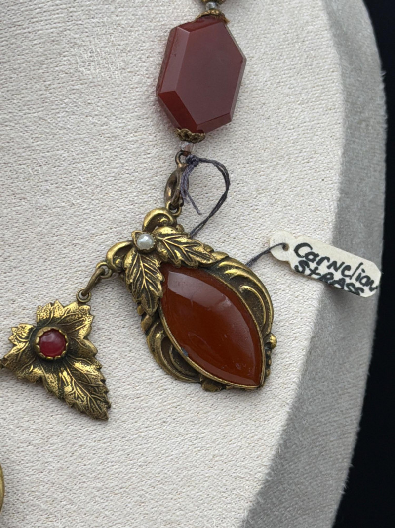 This exquisite Victorian-era fringe necklace combines the warmth of natural gemstones with delicate period artistry. Materials: Features vibrant, earth-toned Cornelian (Carnelian) drops and meticulously set white seed pearls. Design: A classic lavalier-style arrangement with ornate, gold-tone floral leaf motifs and a central teardrop pendant. Dimensions: Features a 9.5-inch drop from the clasp, designed to sit gracefully at the collarbone. Condition: Excellent antique condition with a rich, authentic patina and well-preserved stone settings.