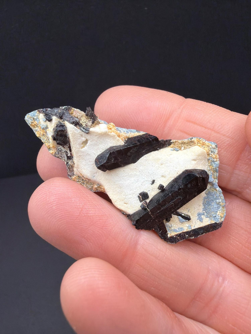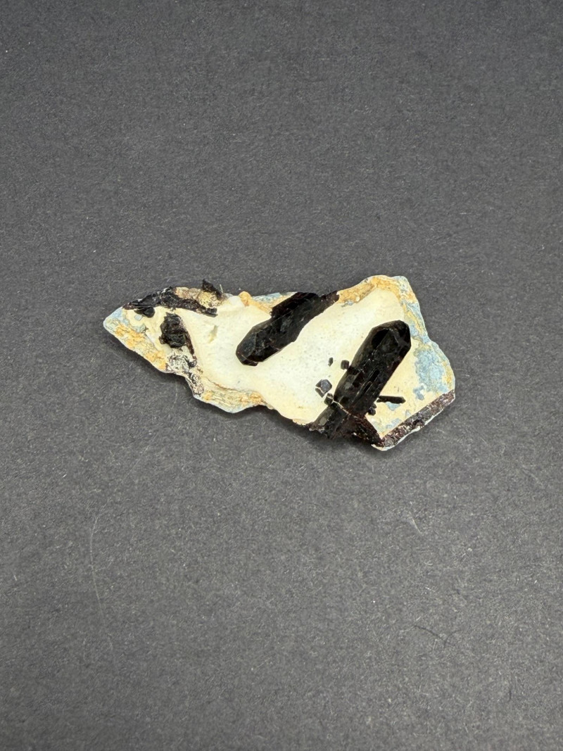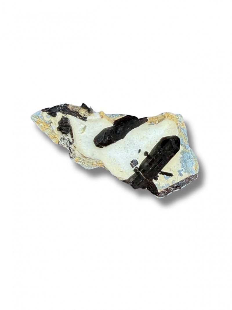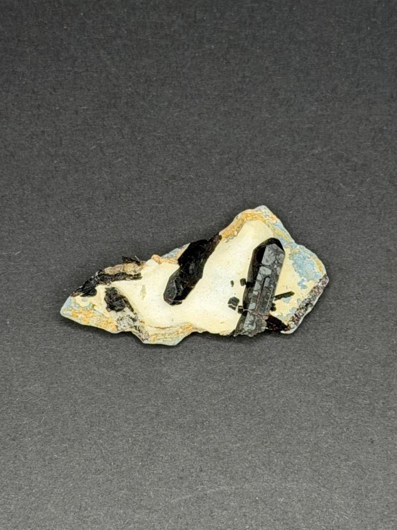 A beautiful 2-inch specimen featuring sharp, lustrous black Neptunite crystals set against a contrasting white Natrolite matrix. This piece displays excellent geometric crystal formation.