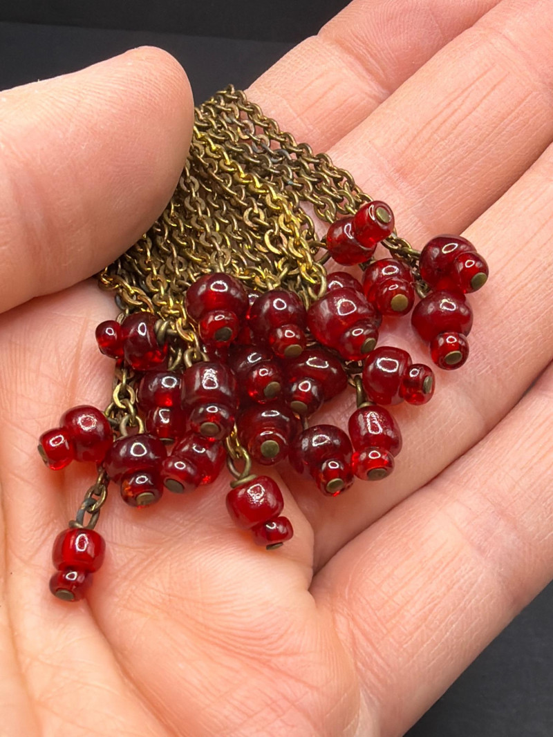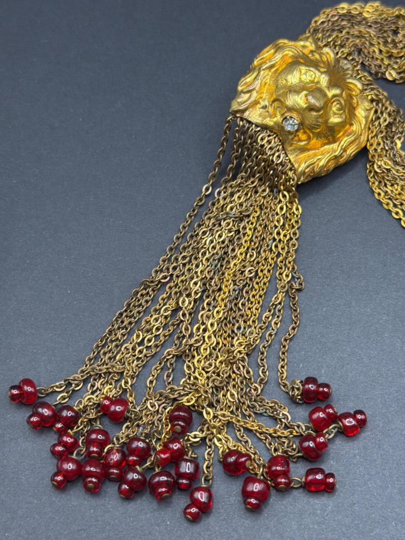 A high-fashion statement piece that captures the iconic Hollywood Regency and Grandmillennial aesthetic. This dramatic necklace features a bold lion motif, a symbol often associated with luxury vintage designs. Design: Features a central, high-relief lion head medallion with a shimmering clear rhinestone "diamond" accent in its mouth. Style: The medallion anchors a cascading multi-strand chain tassel drop, finished with vibrant ruby-red poured glass or resin beads. Necklace Type: A long-form tassel sautoir with a decorative, heavy-link gold-tone chain. Dimensions: The necklace has a 22-inch length, offering a bold silhouette that sits mid-chest. Aesthetic: Heavily inspired by the 1980s/90s Chanel "Lion" collections, making it a perfect find for fans of high-end vintage costume jewelry.