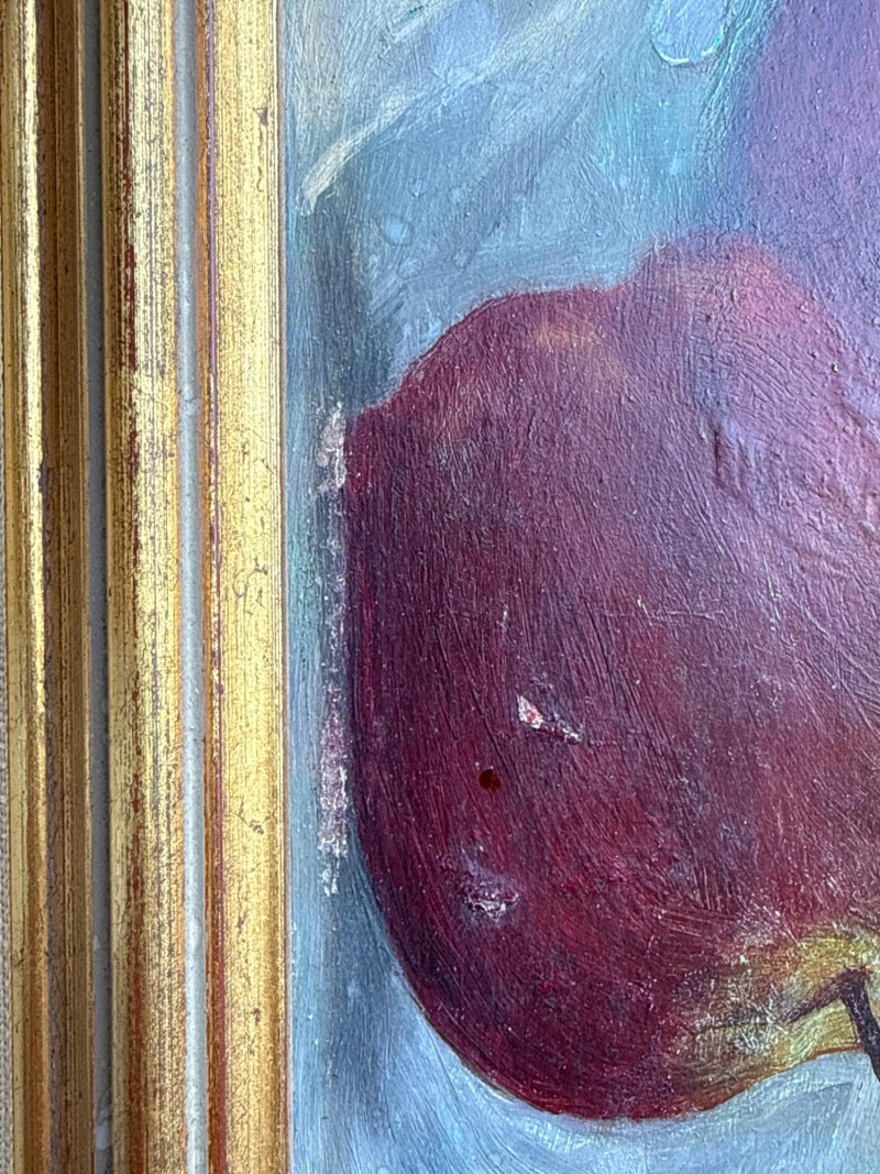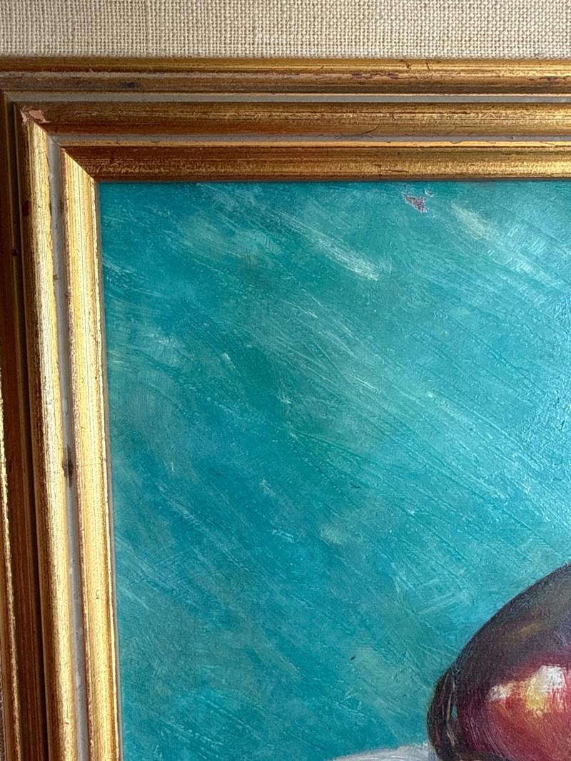 Textured Still Life Oil Painting - Fruit on Turquoise A striking and colorful original still life painting featuring a bowl of cherries set against a brilliant turquoise background. The artist utilizes a heavy impasto technique to create a rich, tactile surface. Housed in a sophisticated double-layered gold and cream wood frame. Size: 17.25" x 15.5" (Framed) Medium: Oil or Acrylic on board/canvas Style: Impressionist Still Life Condition: Excellent; frame shows minor vintage character. Signature unrecognizable.