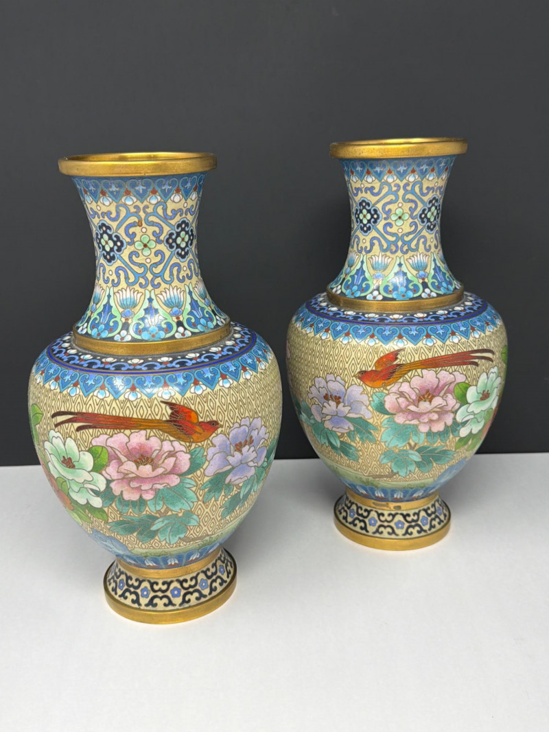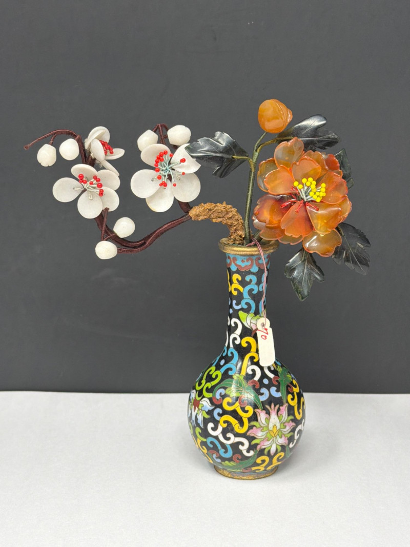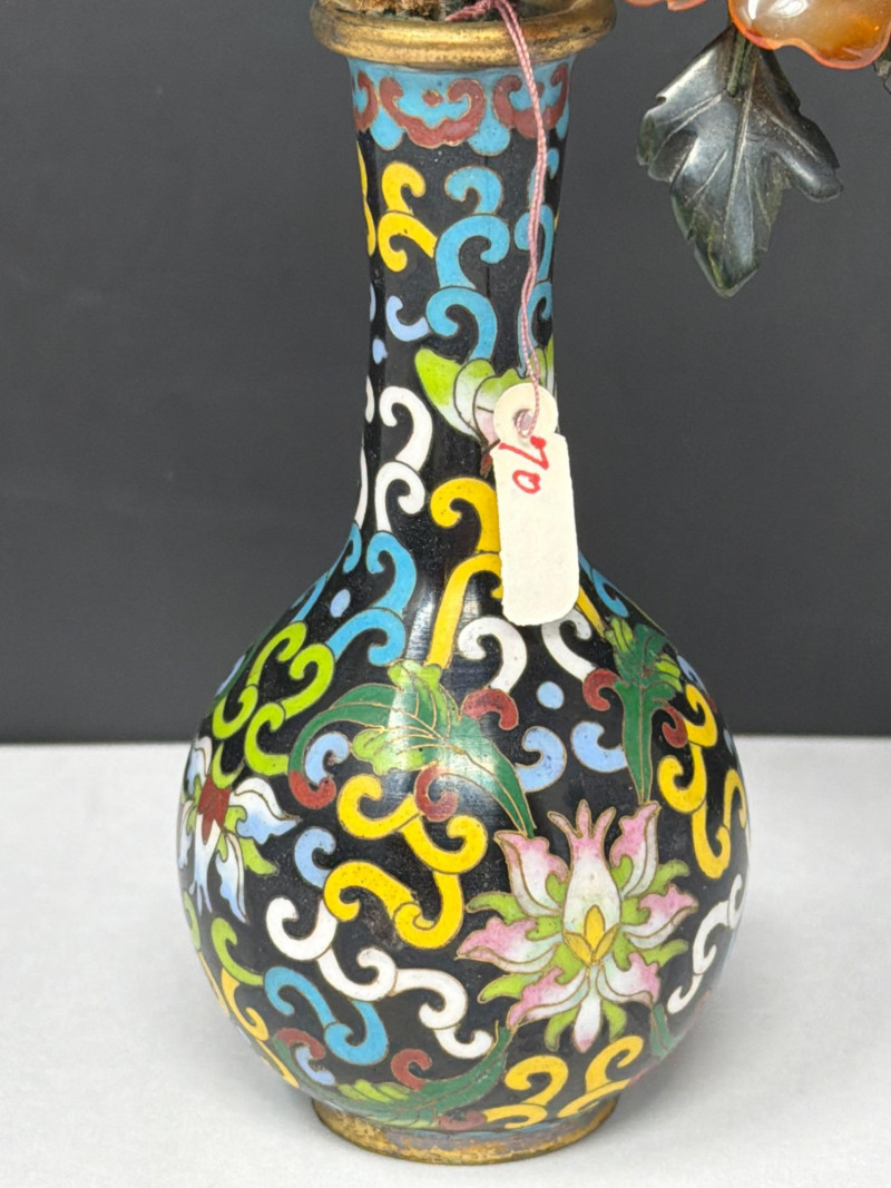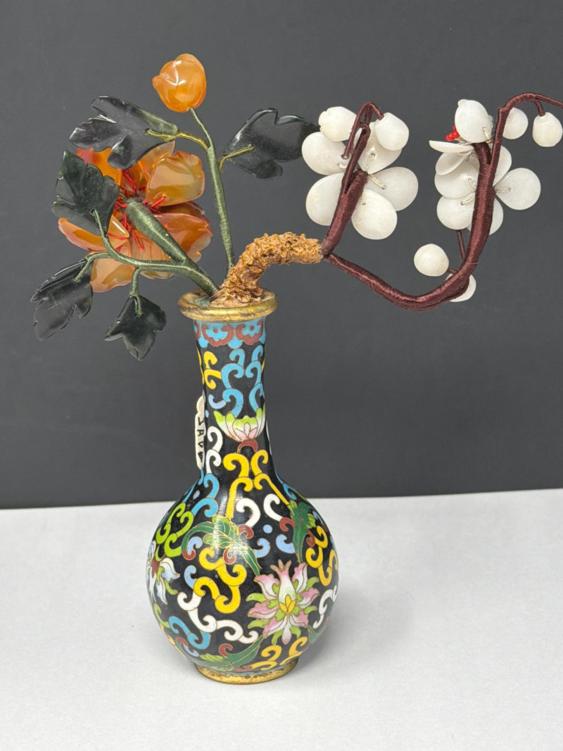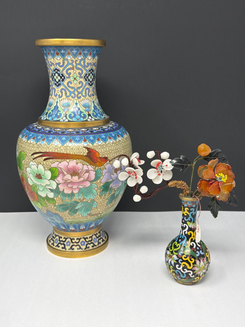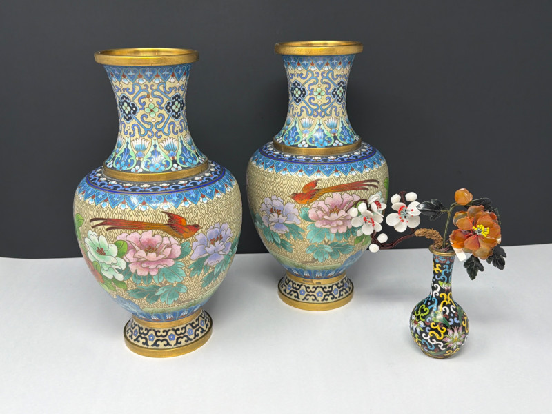 Lot # 47 - Vintage Cloisonné Vase Pair w/ Smaller Vase & Jade Flowers