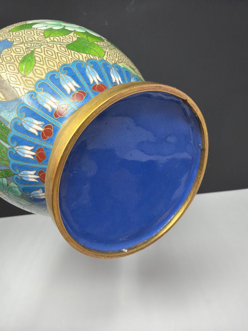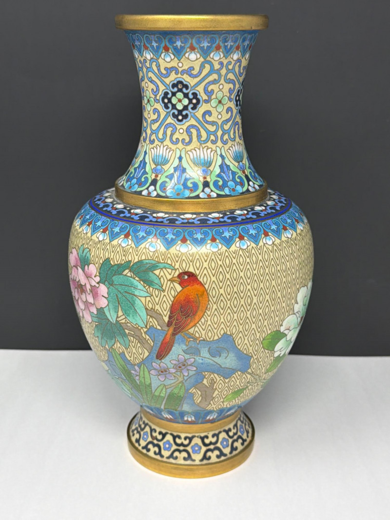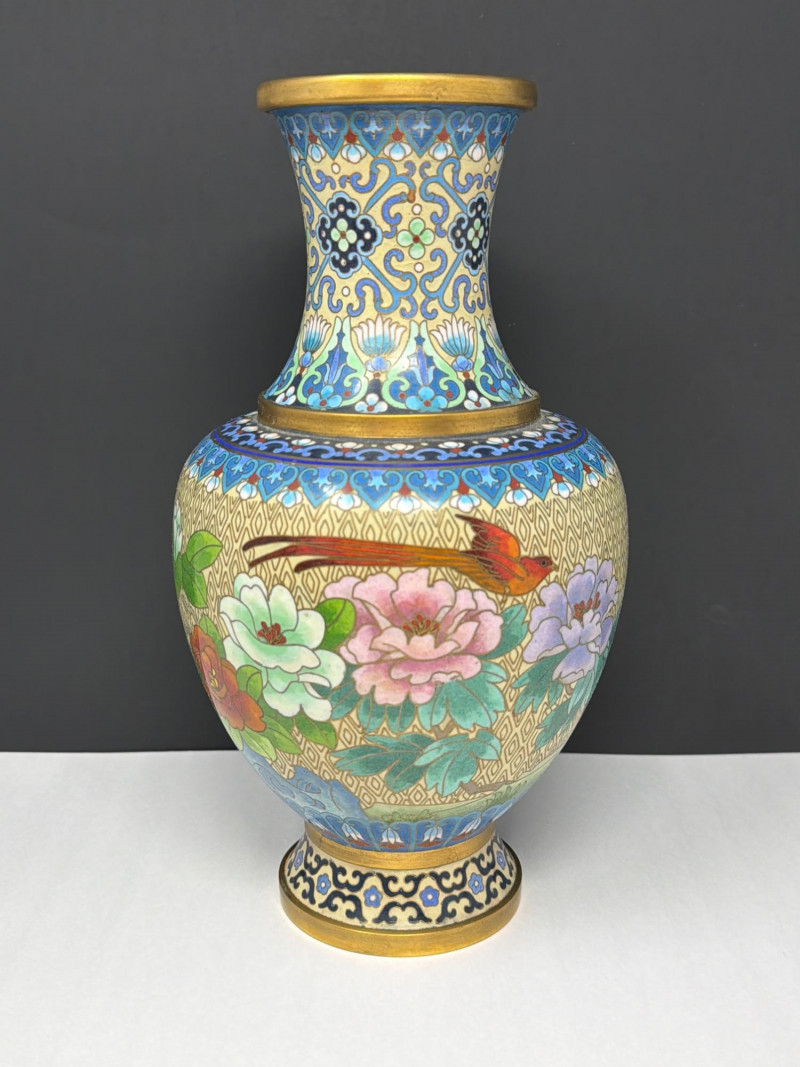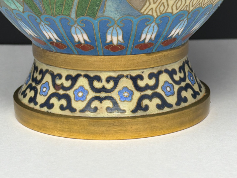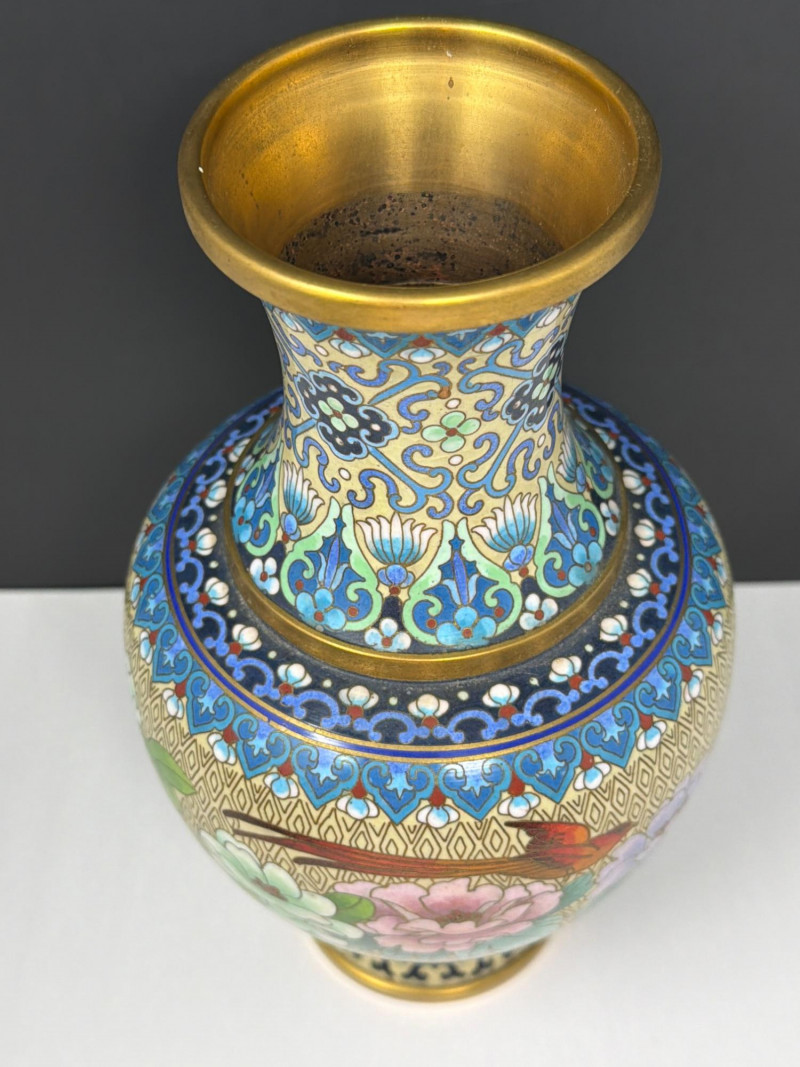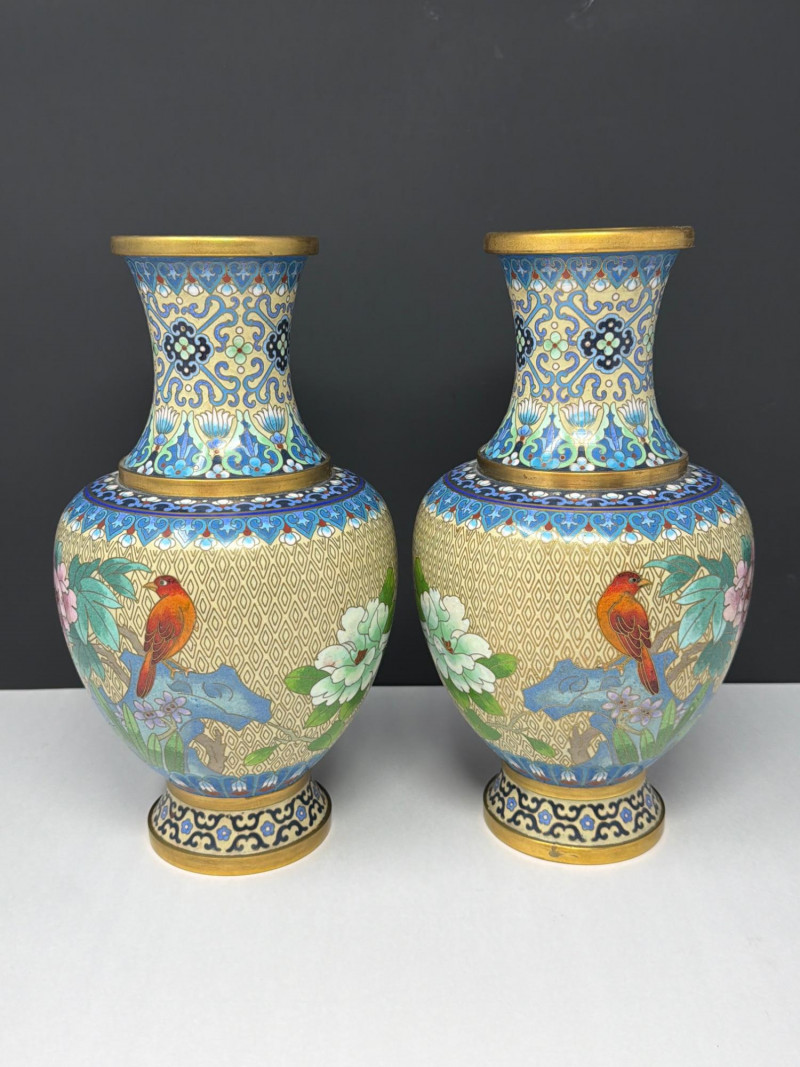 Lot # 47 - Vintage Cloisonné Vase Pair w/ Smaller Vase & Jade Flowers