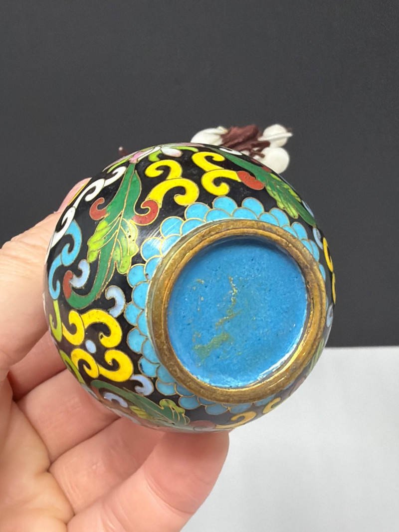Vintage Cloisonné Vase Pair w/ Smaller Vase & Jade Flowers