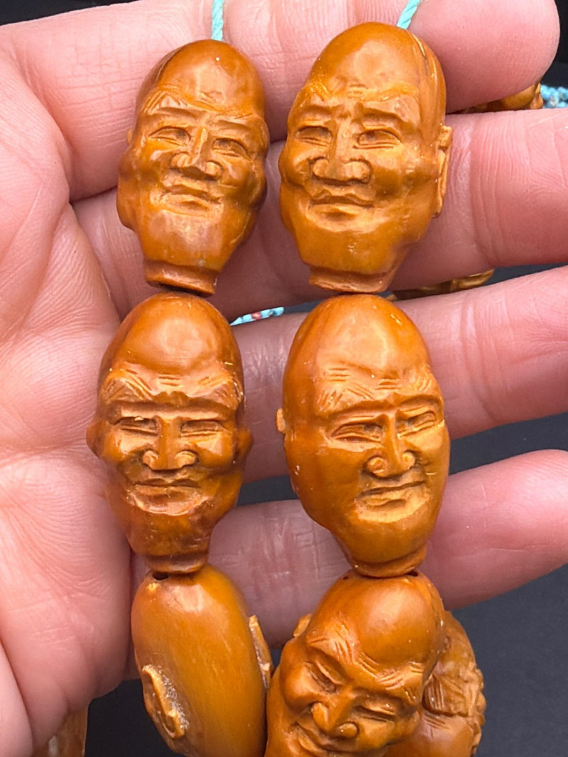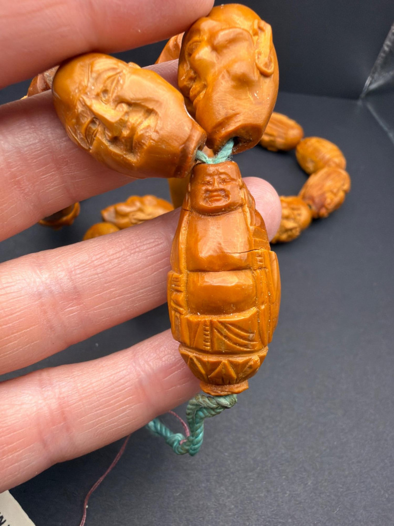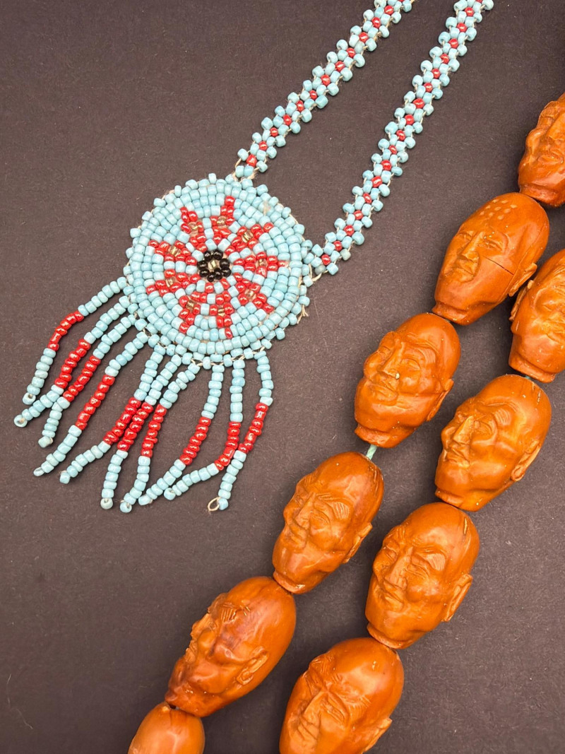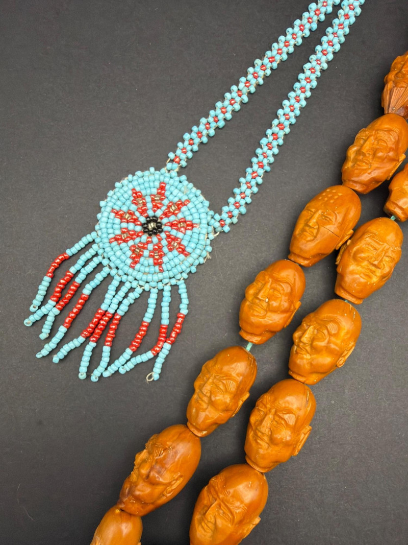 Beaded Native Style Necklace. 15" L Intricate Carved Chinese Hadiao Prayer beads. 11" L