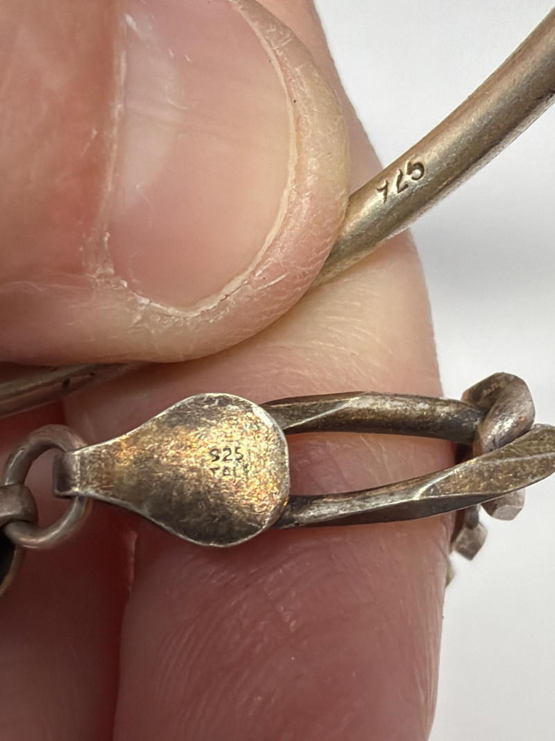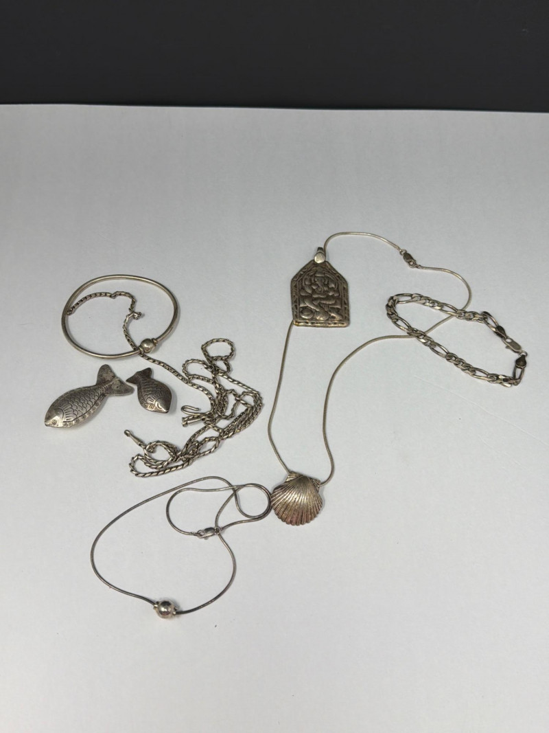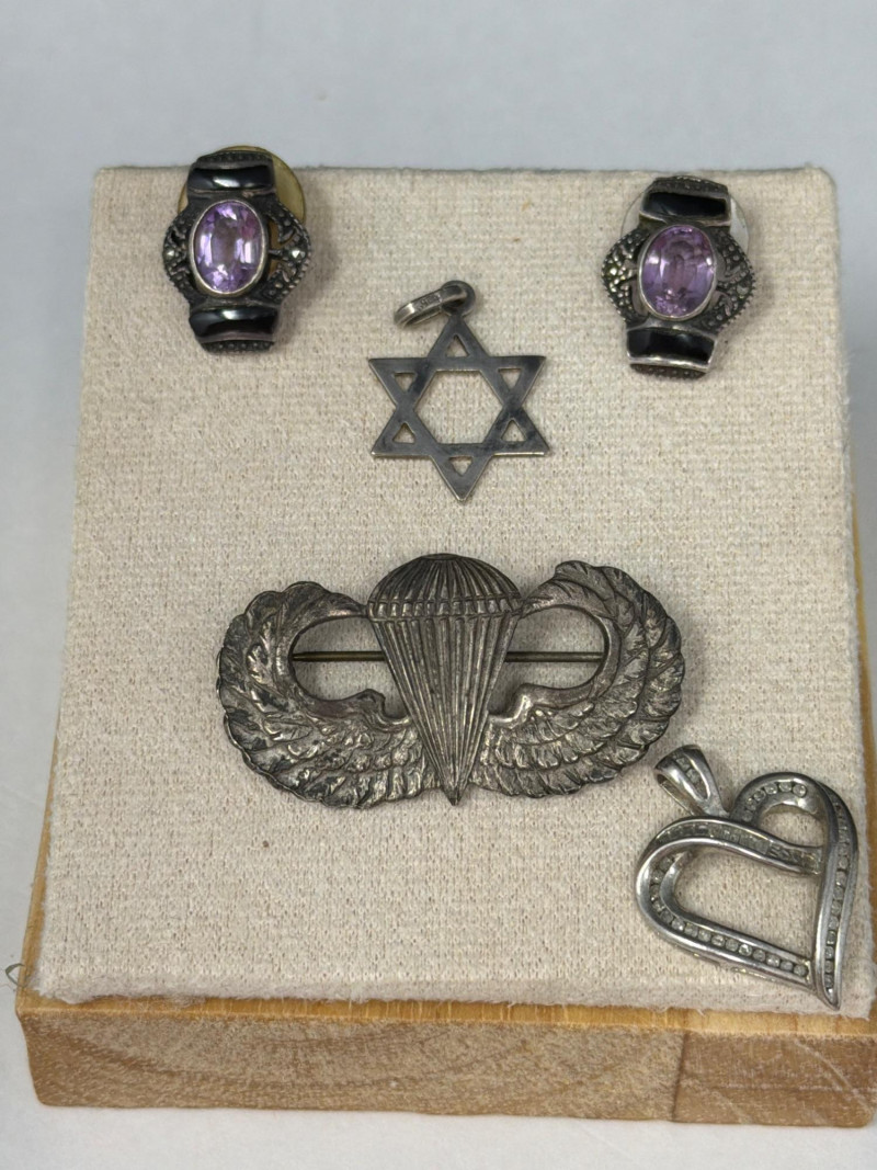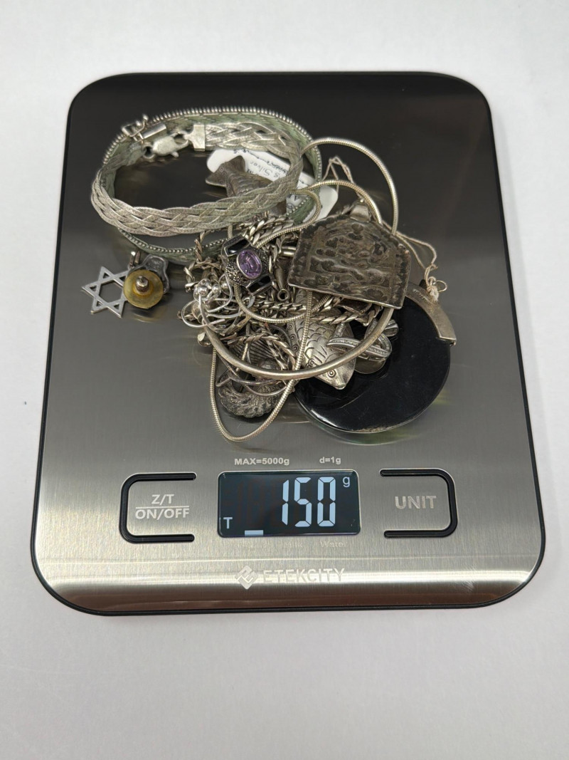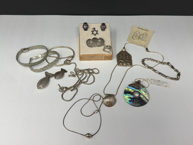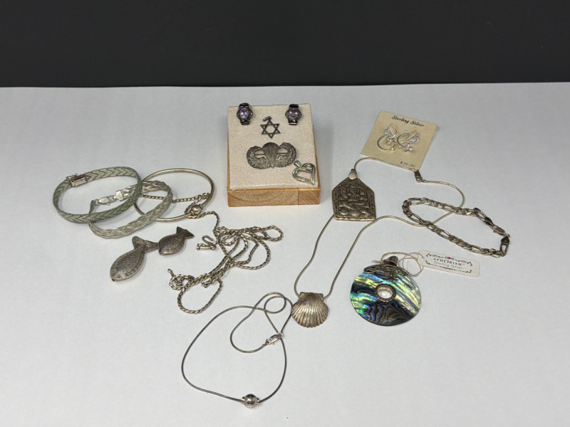 Assorted Sterling Jewelry- 150g Most pieces are stamped as sterling. There was a couple that were in the labeled bag but not tested (they seem to be silver) Various jewelry- pins, necklaces- a couple pieces may need to be repaired and cleaned.
