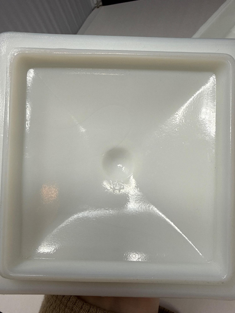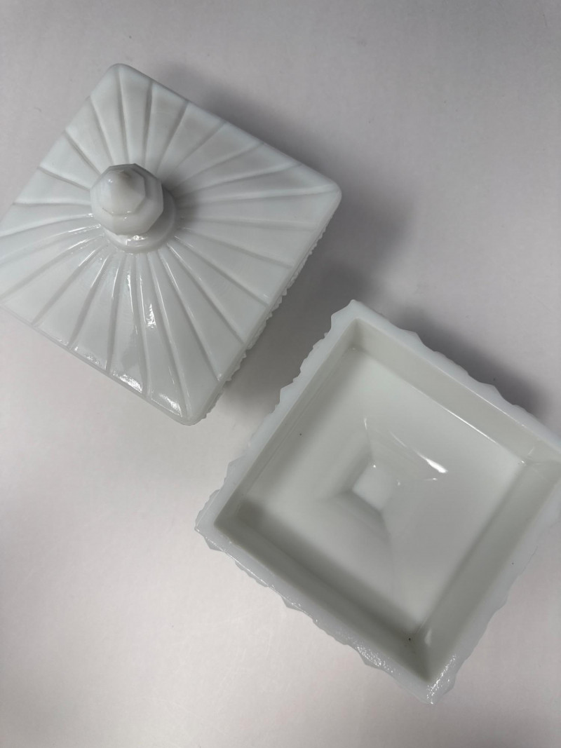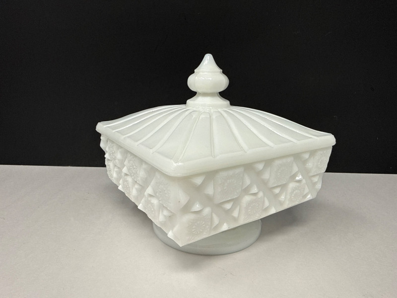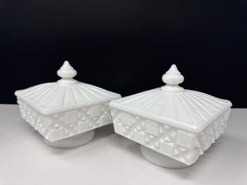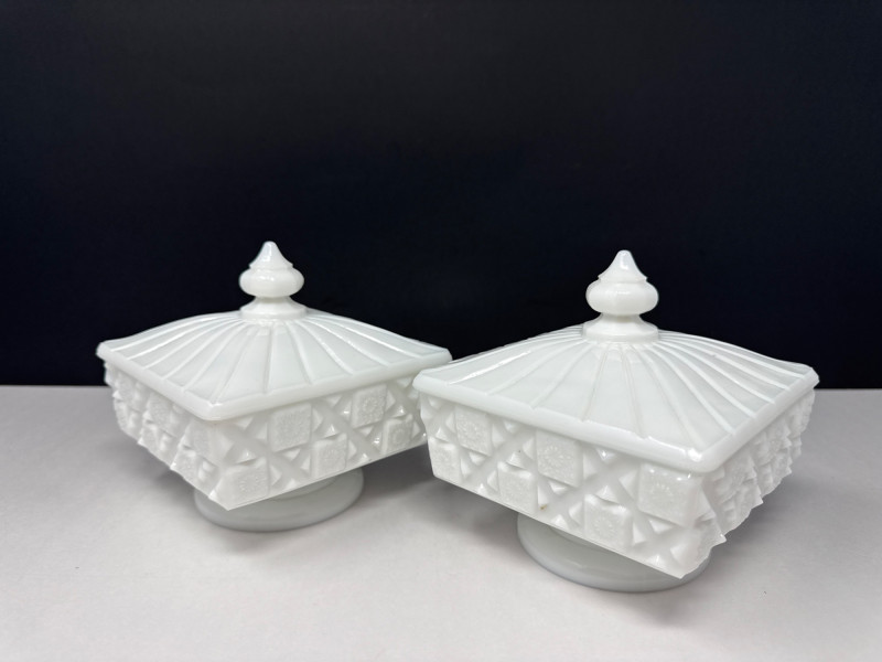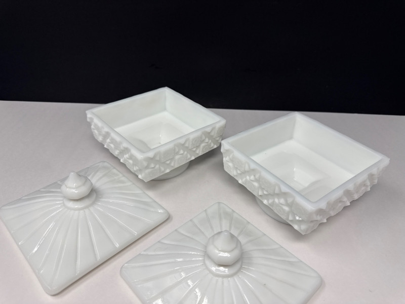 Milk Glass Candy Dishes. 5in deep/wide with lid 5 1/2 in. tall with lid
