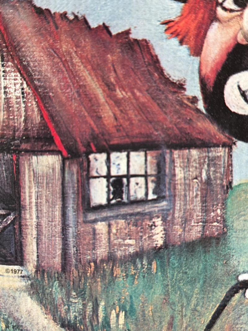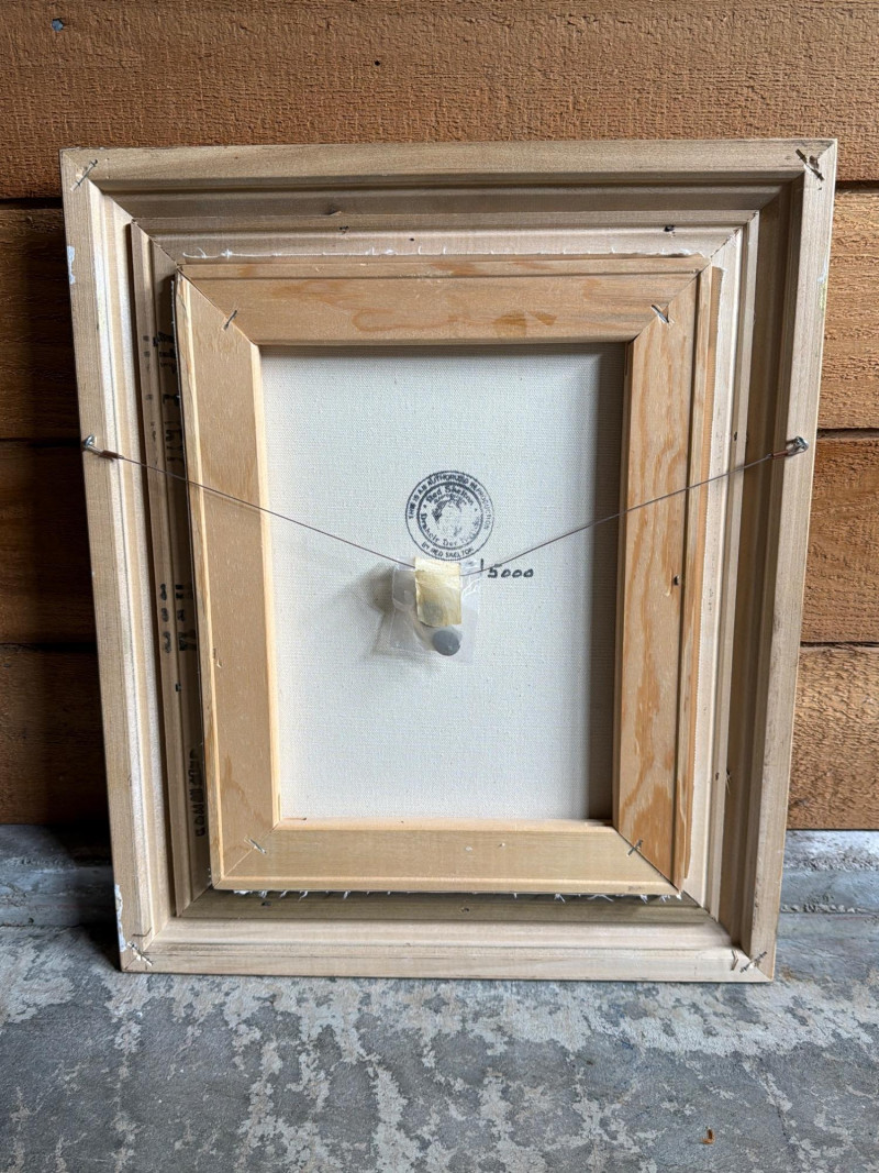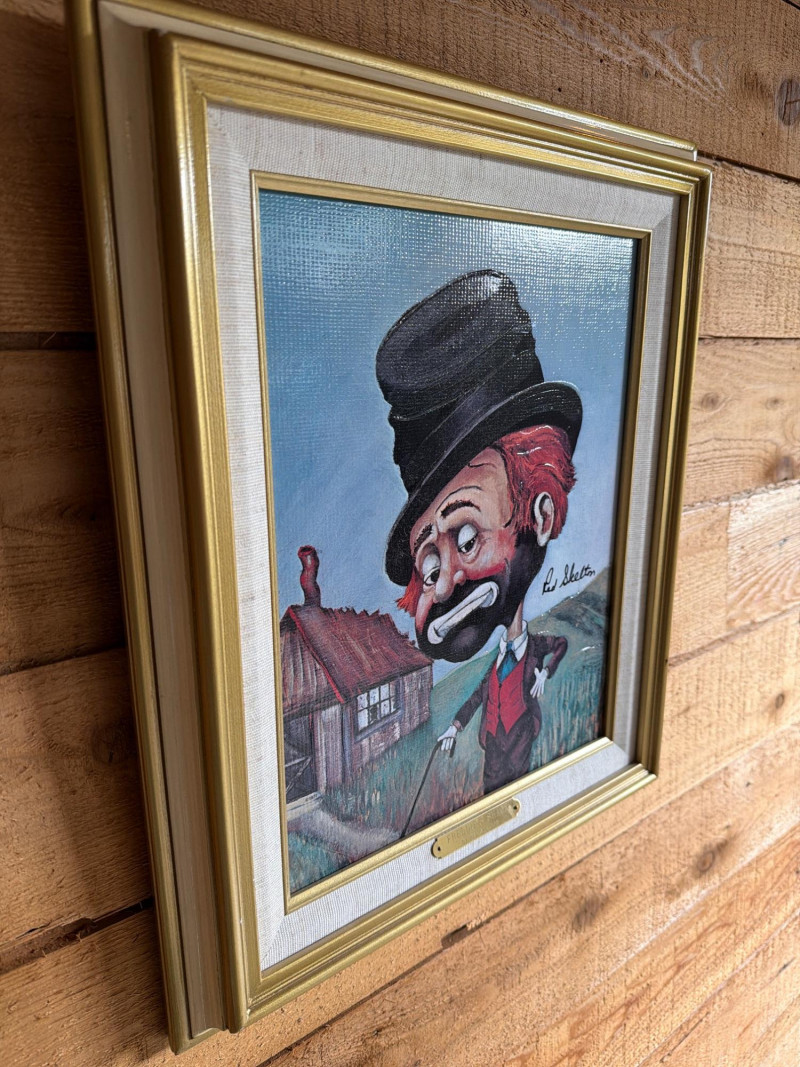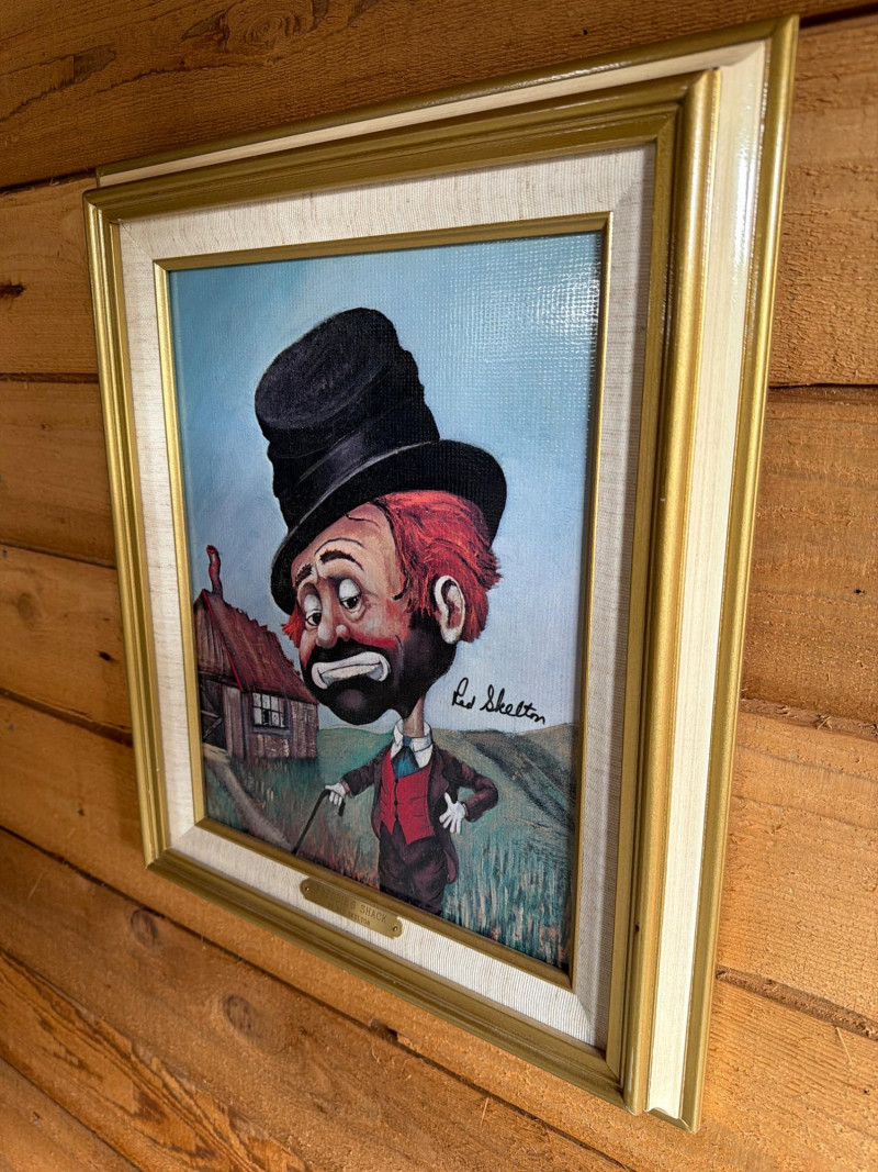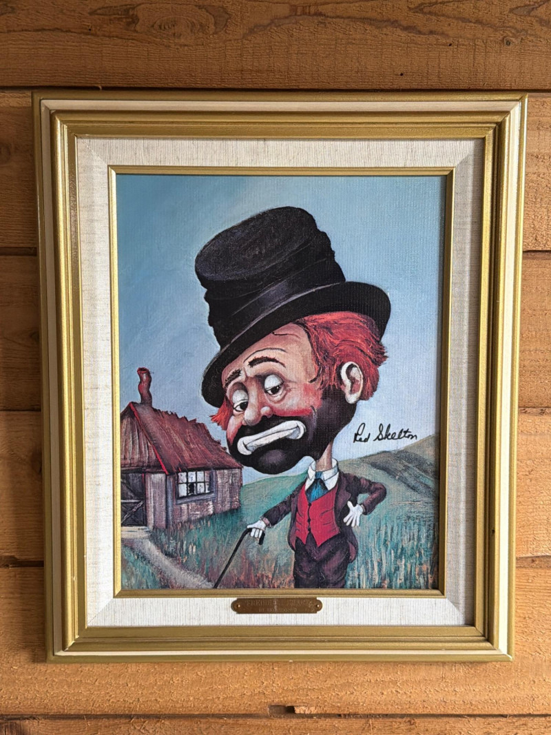 A charming and highly collectible piece of Americana by the legendary entertainer and artist Red Skelton. This work features his most famous character, Freddie the Freeloader, in a whimsical landscape setting. Artist: Red Skelton (American, 1913–1997) Title: "Freddie's Shack" Edition: Hand-numbered 4057/5000 Signature: Features a bold, hand-signed signature by Red Skelton in the lower margin. Format: Framed lithograph on paper, housed in a classic gold-tone ornate frame that complements the artwork’s warm tones. Details: Includes a formal brass title plate on the front of the frame. Condition: The artwork appears well-preserved with vibrant colors; the frame shows light vintage wear consistent with age.
