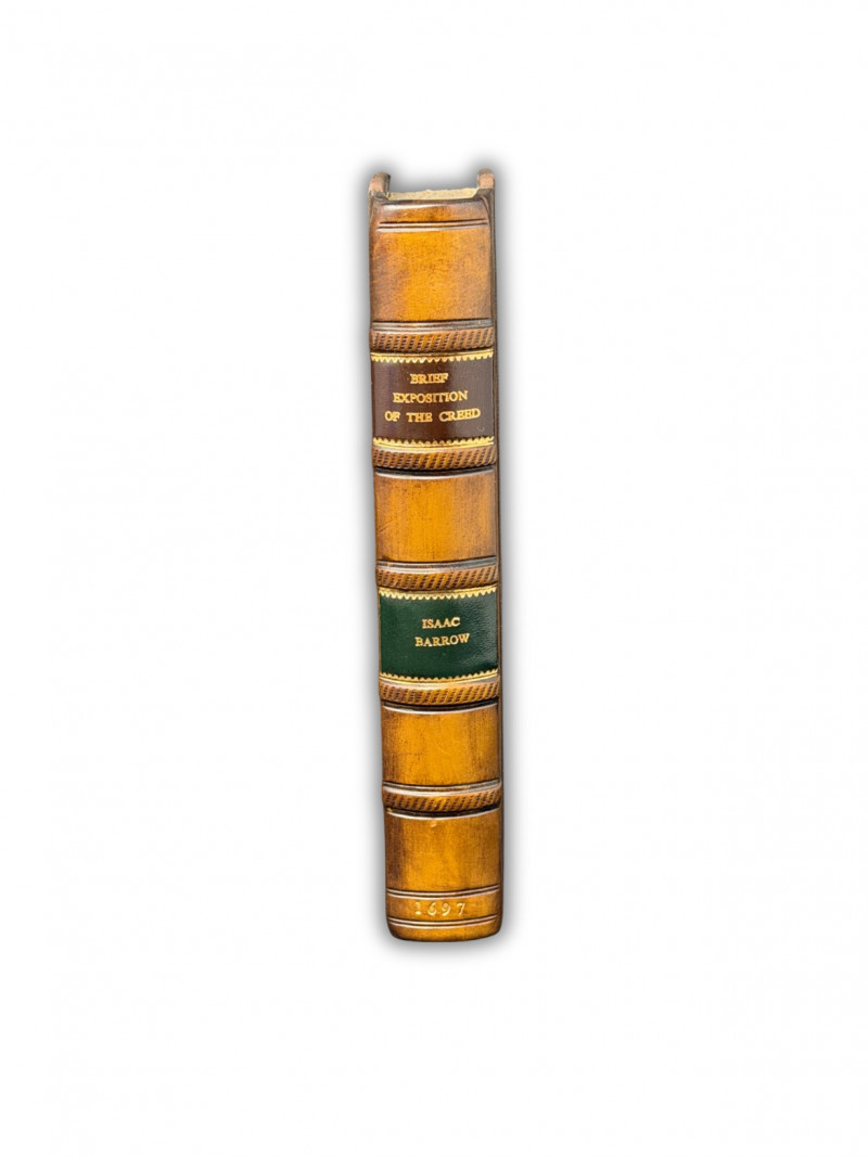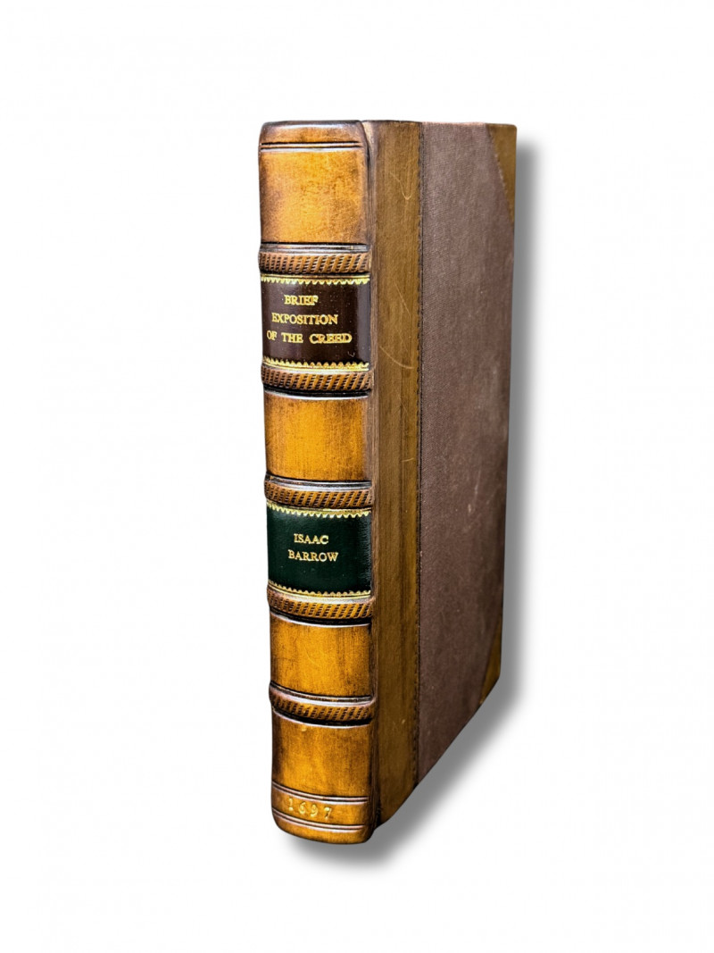 1697 “Brief Exposition of the Creed” Isaac Barrow- $350+ Isaac Barrow (October 1630 – 4 May 1677) was an English Christian theologian and mathematician who is generally given credit for his early role in the development of infinitesimal calculus; in particular, for a proof of the fundamental theorem of calculus.[1] His work centered on the properties of the tangent; Barrow was the first to calculate the tangents of the kappa curve. He is also notable for being the inaugural holder of the prestigious Lucasian Professorship of Mathematics at the University of Cambridge, a post later held by his student, Isaac Newton.