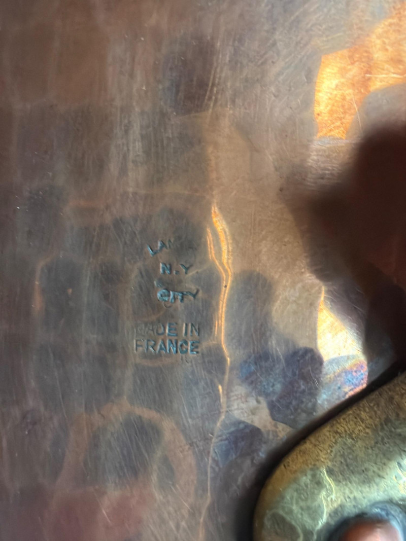 Antique French Large Hammered Copper Stock Pot This is a gorgeous, heavy piece! I've seen similar or same while touring Chateaus in France! Inside may need to be refinished. Beautiful copper patina Stamped Legible "Made in France" "NY City"