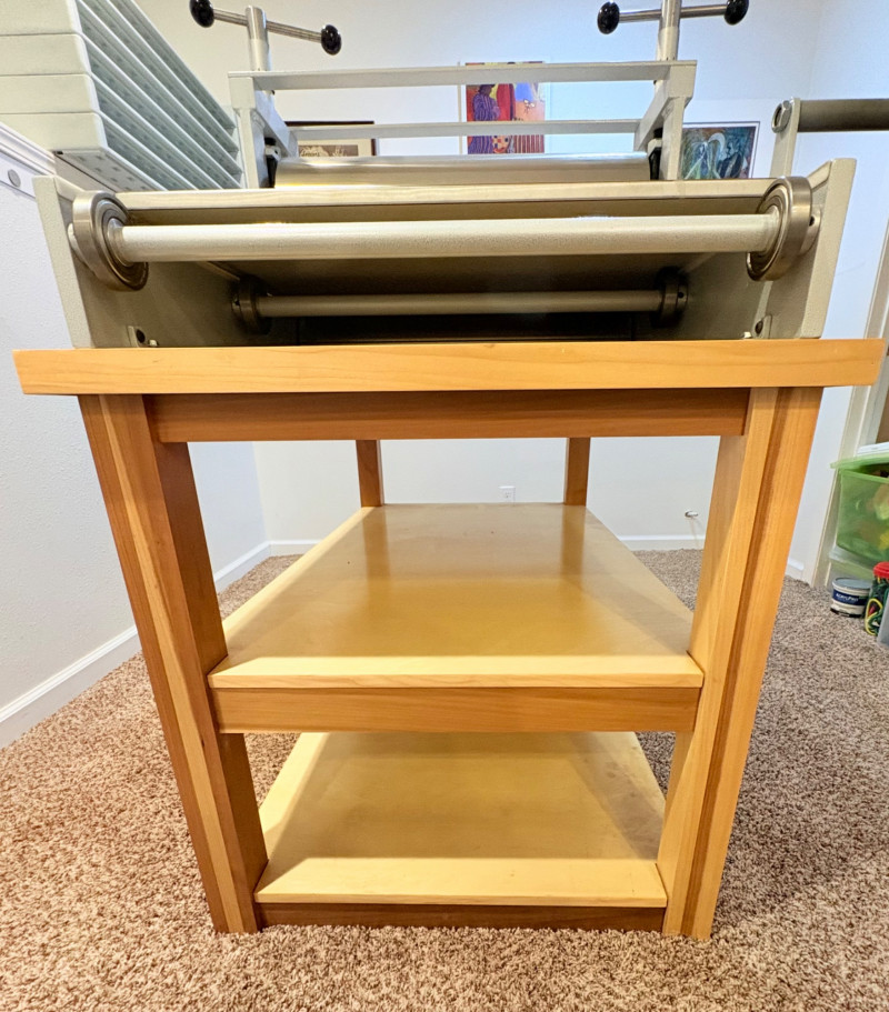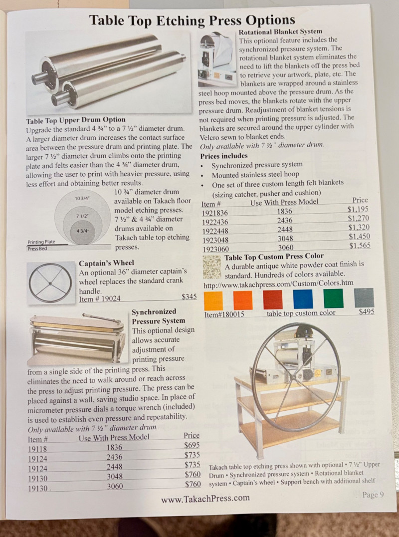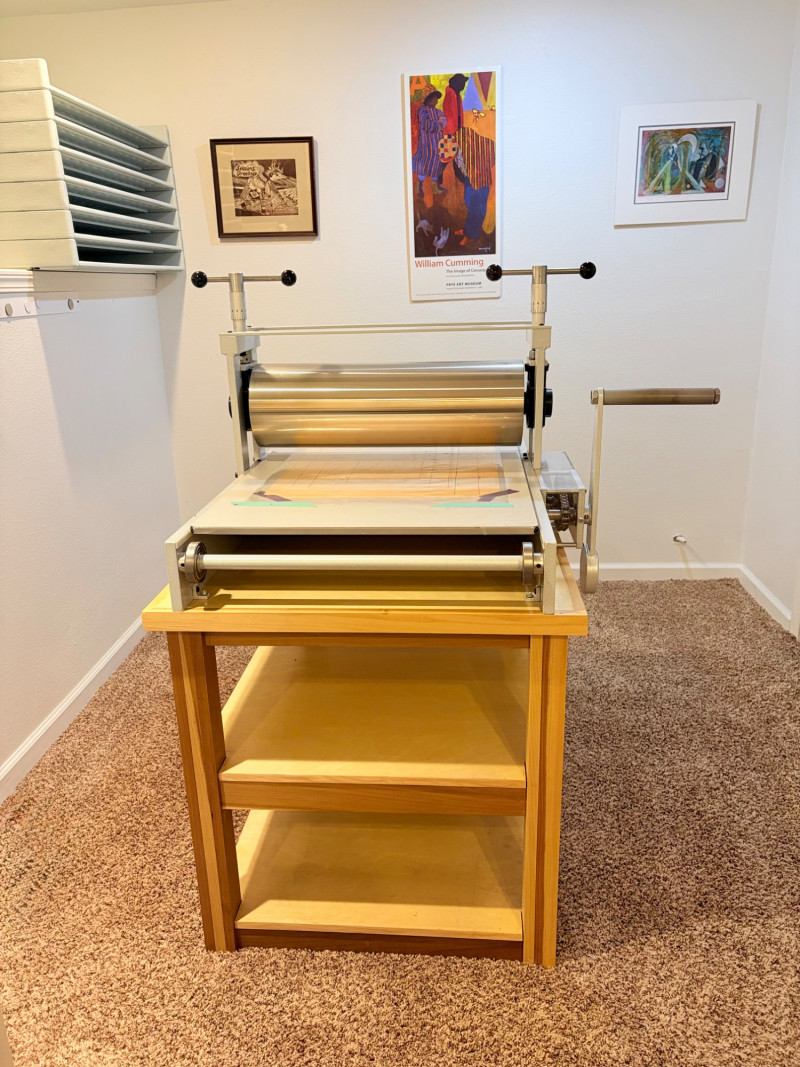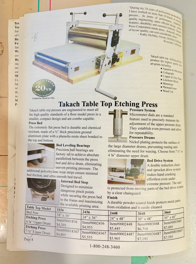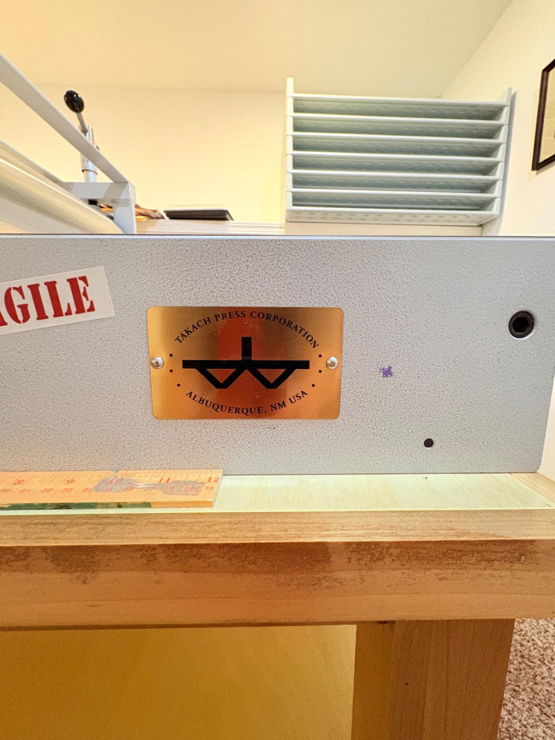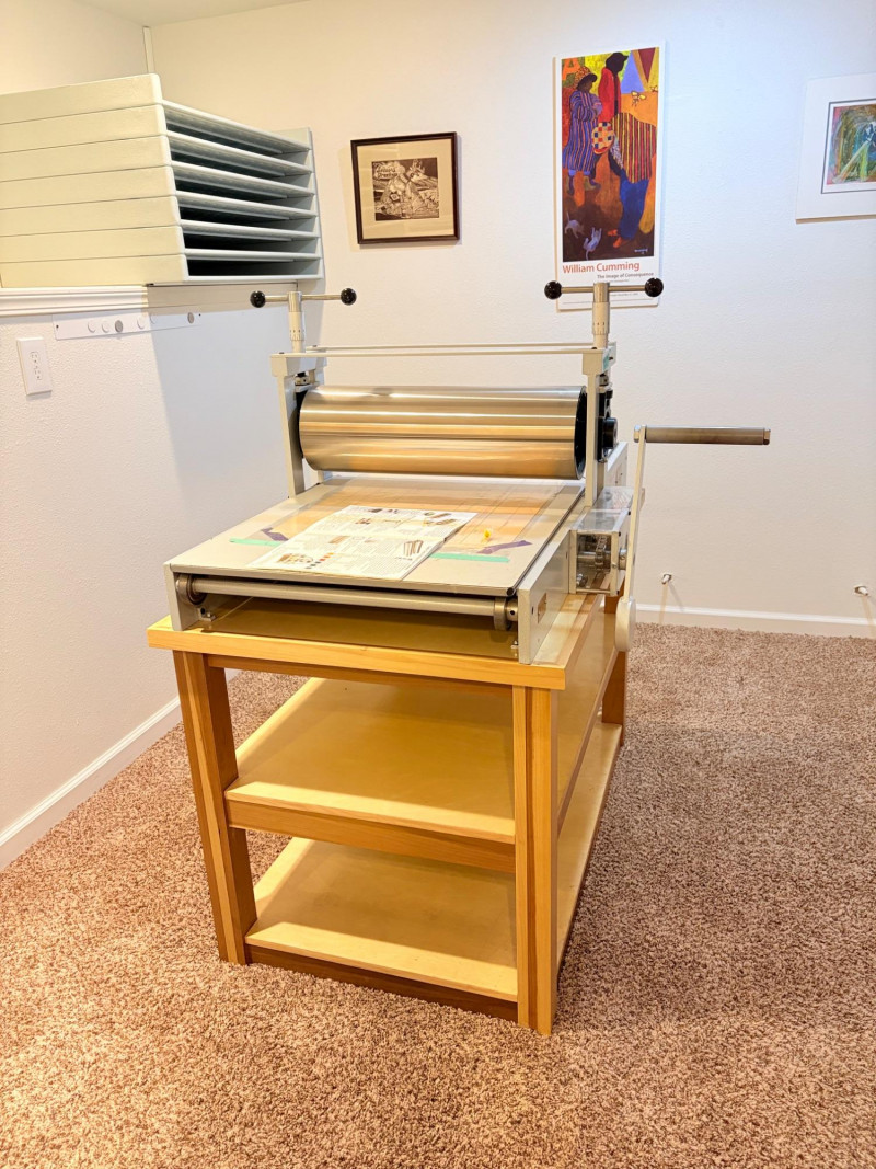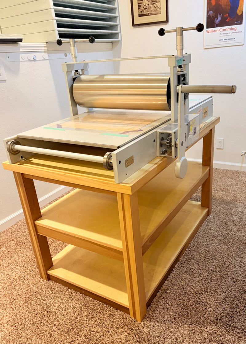 This is the Cadillac of tabletop presses! This Takach tabletop etching printing press is model #2448 with a 24“ x 48“ bed. Our client chose the larger of the two drums this model can be fitted with - a full 7.5" diameter. The bed moves like a knife through warm butter as you turn the crank with an incredibly smooth chain mechanism. We opted to leave our client's guides on the bed for the new owner, but they are easily removed if you prefer as they are just taped down. The actual height of the press from base to top of handles is 22". Takach Press catalogue with this model and other supplies is included. Please look through the pages shown - this is a great machine! Made in the USA (Albuquerque). Press appears to be in excellent condition with no noticeable flaws. The press is mounted to a fabulous support table with large shelves to place your prints when completed or store your supplies. It is solid wood throughout with two reinforced fixed shelves as well as the tabletop (the lowest shelf is 3" from the floor with the middle shelf 17" from the floor). Table measures 30.5" H x 48" L x 30" W and is in excellent condition. For sale from Takach: 2448 Table Top Etching Press with 7.5 in. Diameter Upper Drum - Takach Press Less pretty table for sale from Takach https://shop.takachpress.com/takach-presses/etching-presses/ NOTE: The high bidder on this press and table will not pick this up during our regular pickup window on the 10th of May. We will make separate arrangements at a mutually agreeable time. This will allow for plenty of time to unscrew the press from the table and remove the top of the table to get it out of the house. There are several steps from the basement to the back driveway. We don't want you to rush and will arrange for you to be able to park near/on the property for pickup at an agreed upon time; we are very flexible with this item as we really want it to go to a good home! We suggest a minimum of 2 people be present to move this item.